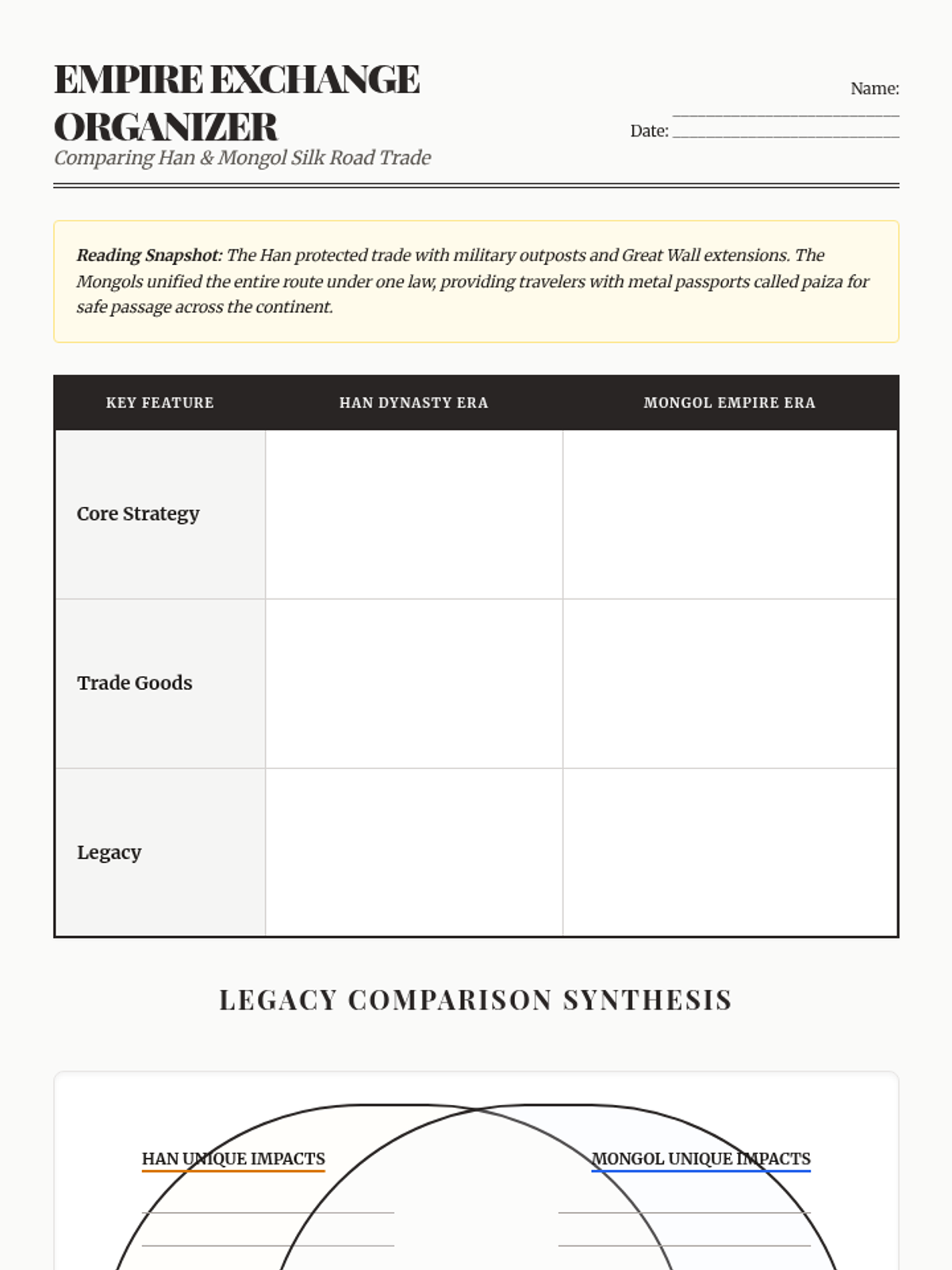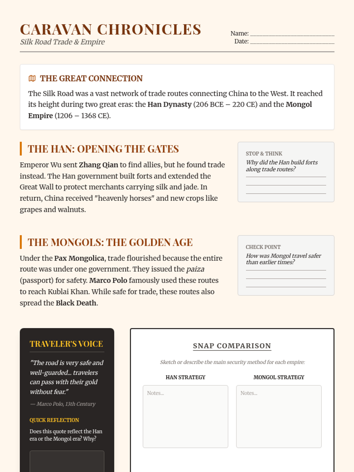 A lesson comparing the Silk Road trade during the Han Dynasty and the Mongol Empire, focusing on safety, technology, and cultural exchange.