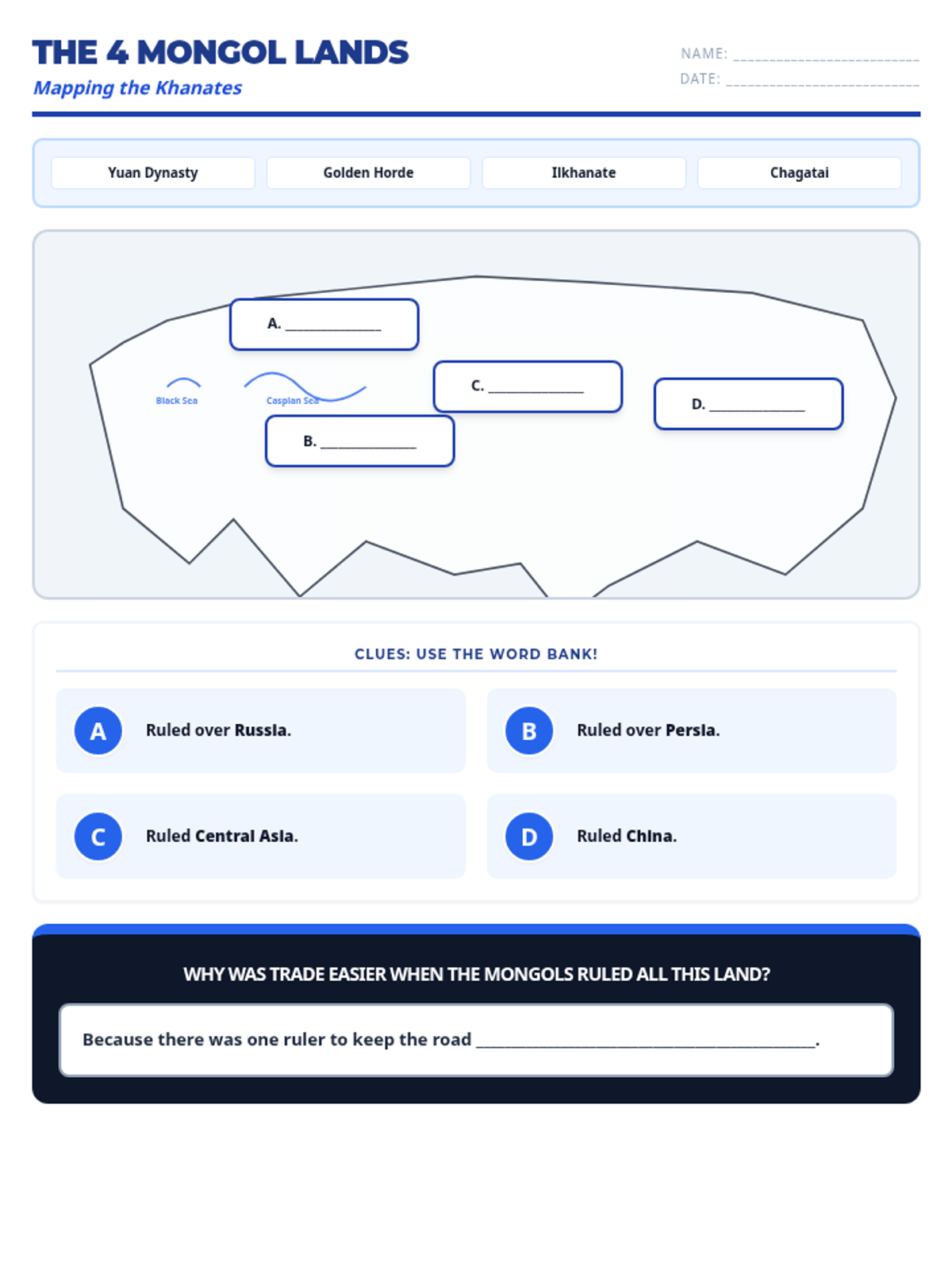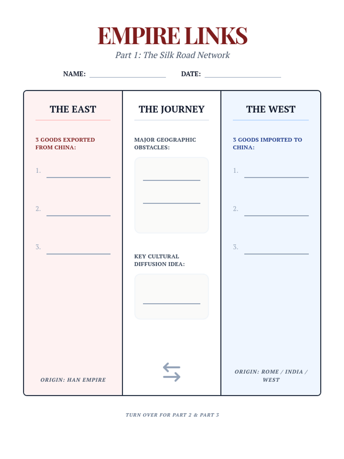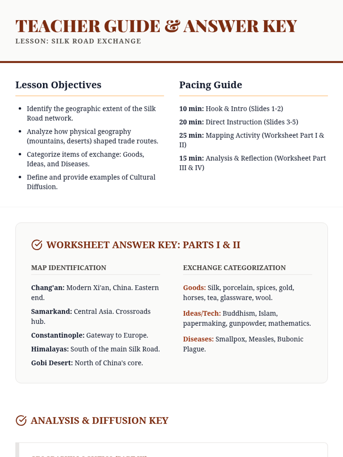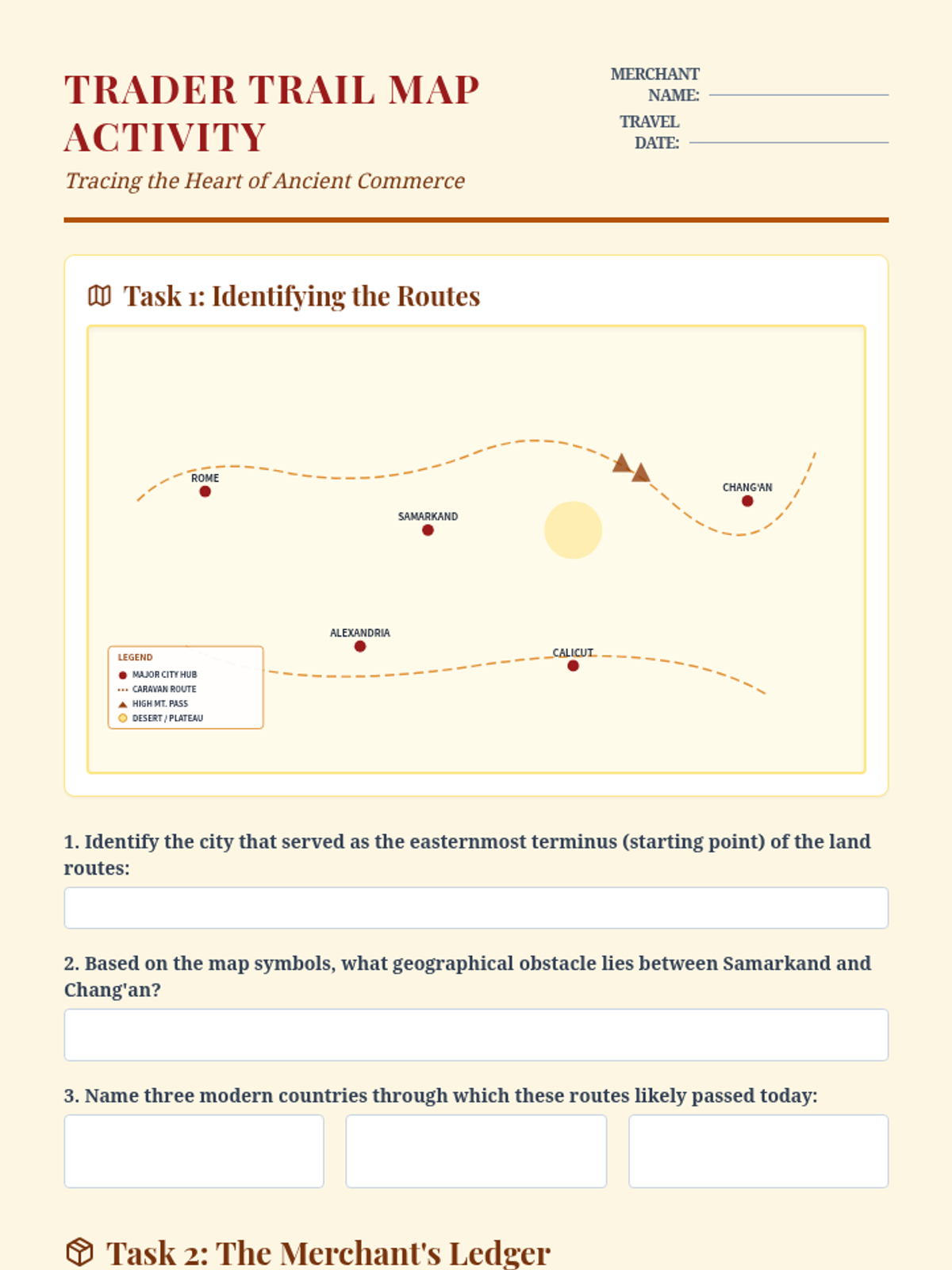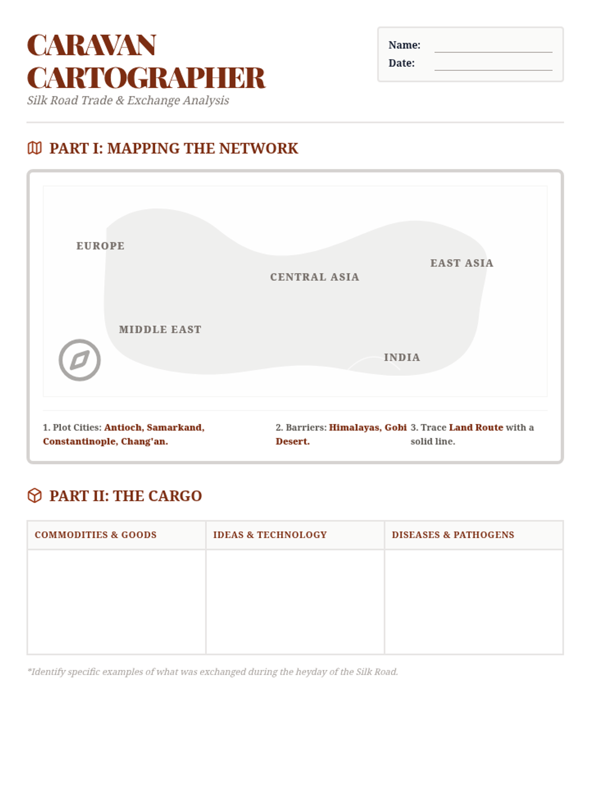Students will map the Silk Road, identifying major trade cities, physical barriers, and the exchange of goods, ideas, and diseases.