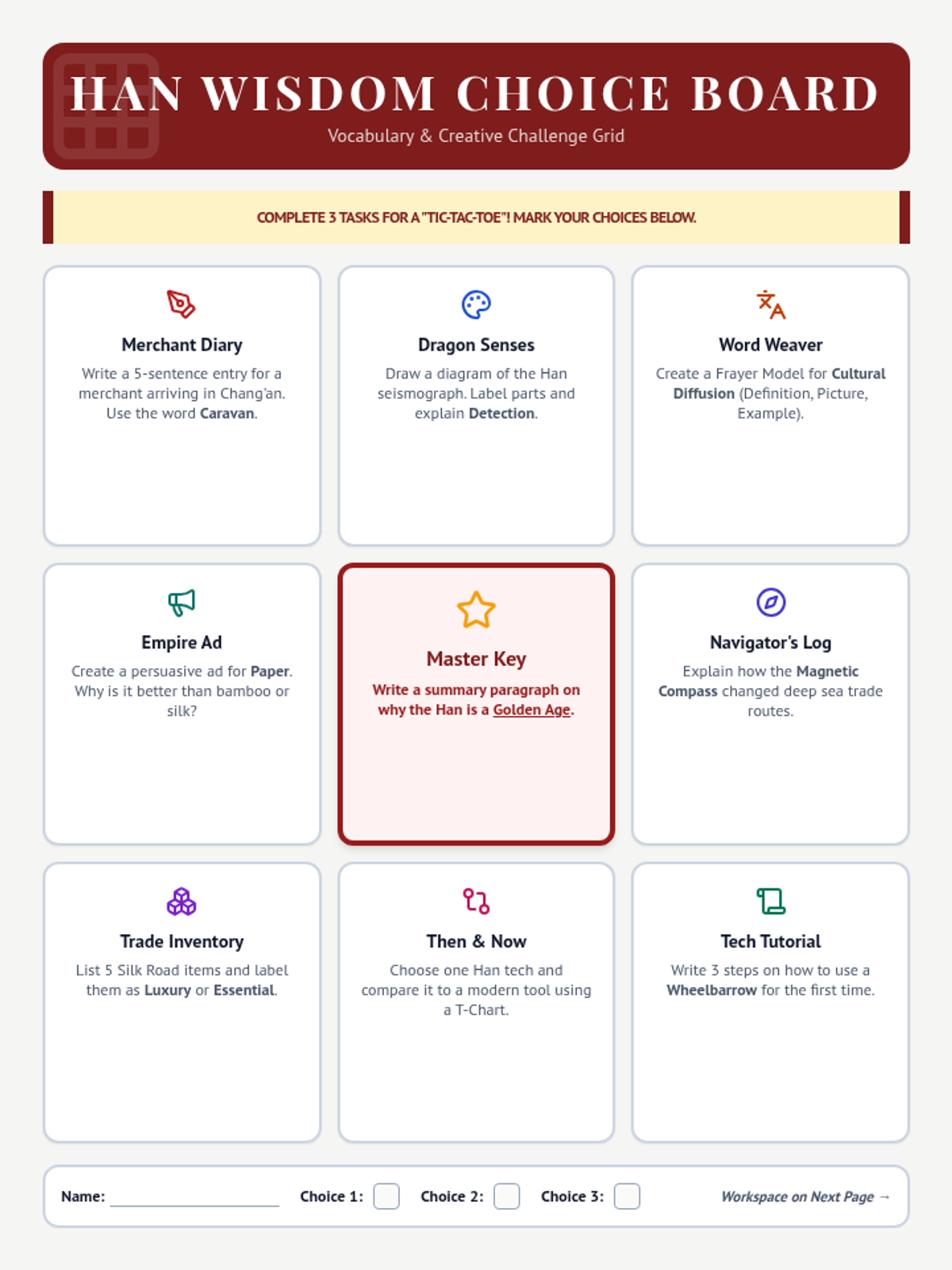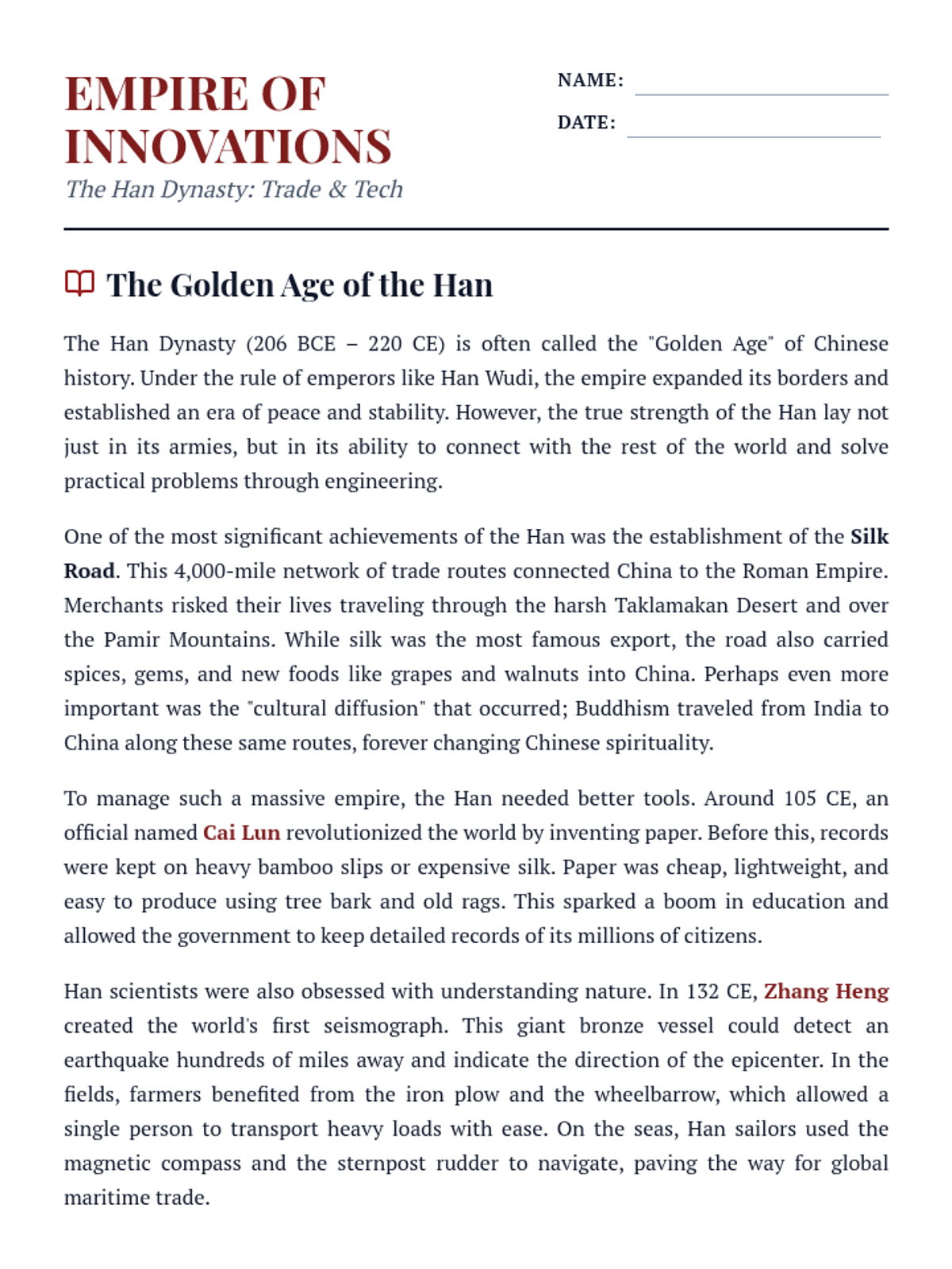 This lesson explores the dual pillars of the Han Dynasty's legacy: the vast Silk Road trade network and the revolutionary technological advancements that shaped ancient China and the world. Students will examine how trade goods and cultural ideas flowed across Eurasia and analyze key inventions like paper and the seismograph.