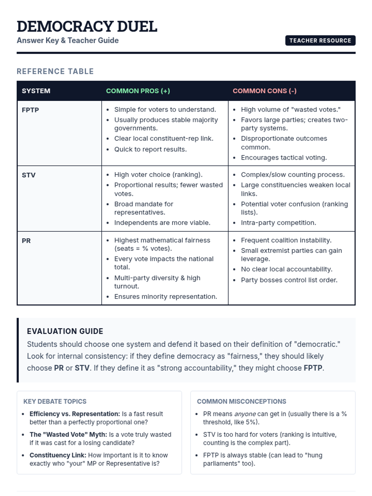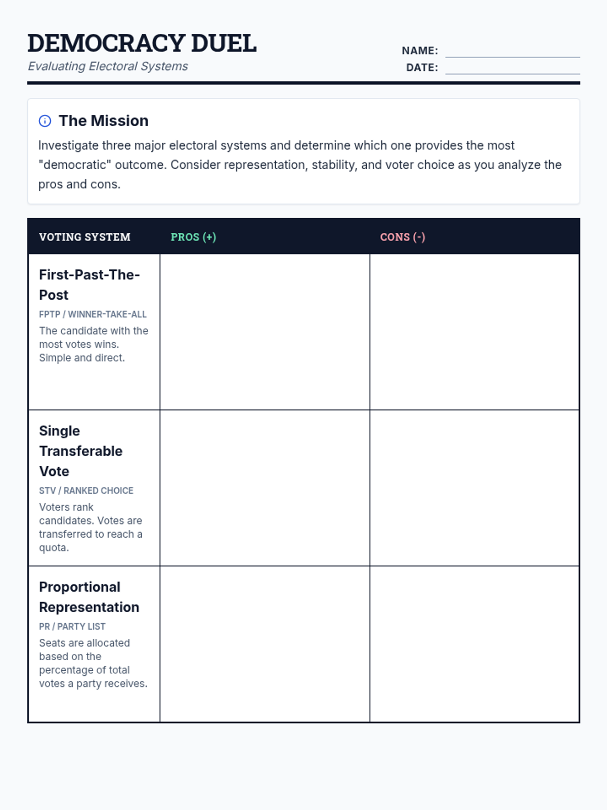 A lesson evaluating the democratic merits of First-Past-The-Post, Single Transferable Vote, and Proportional Representation through comparative analysis.