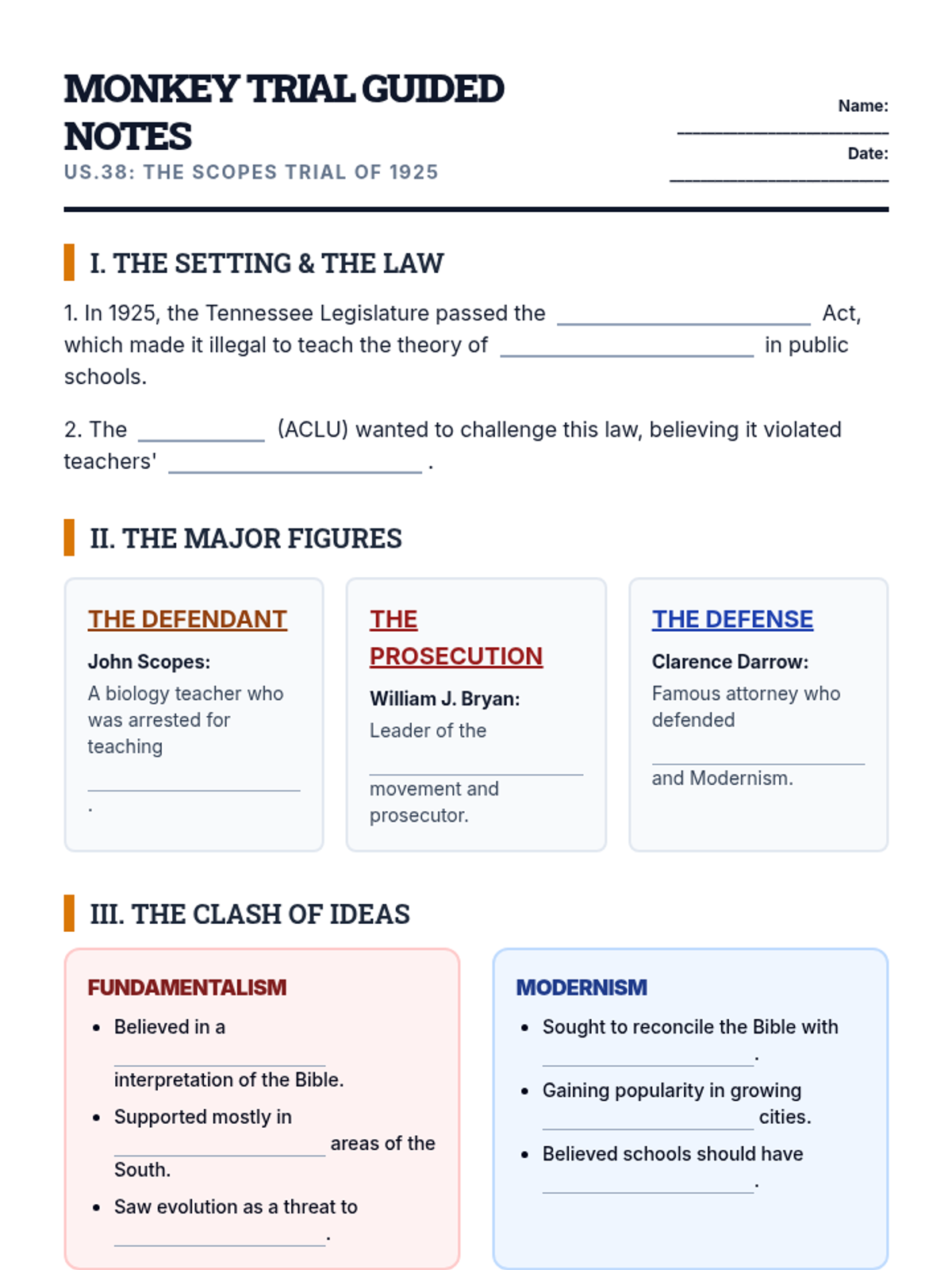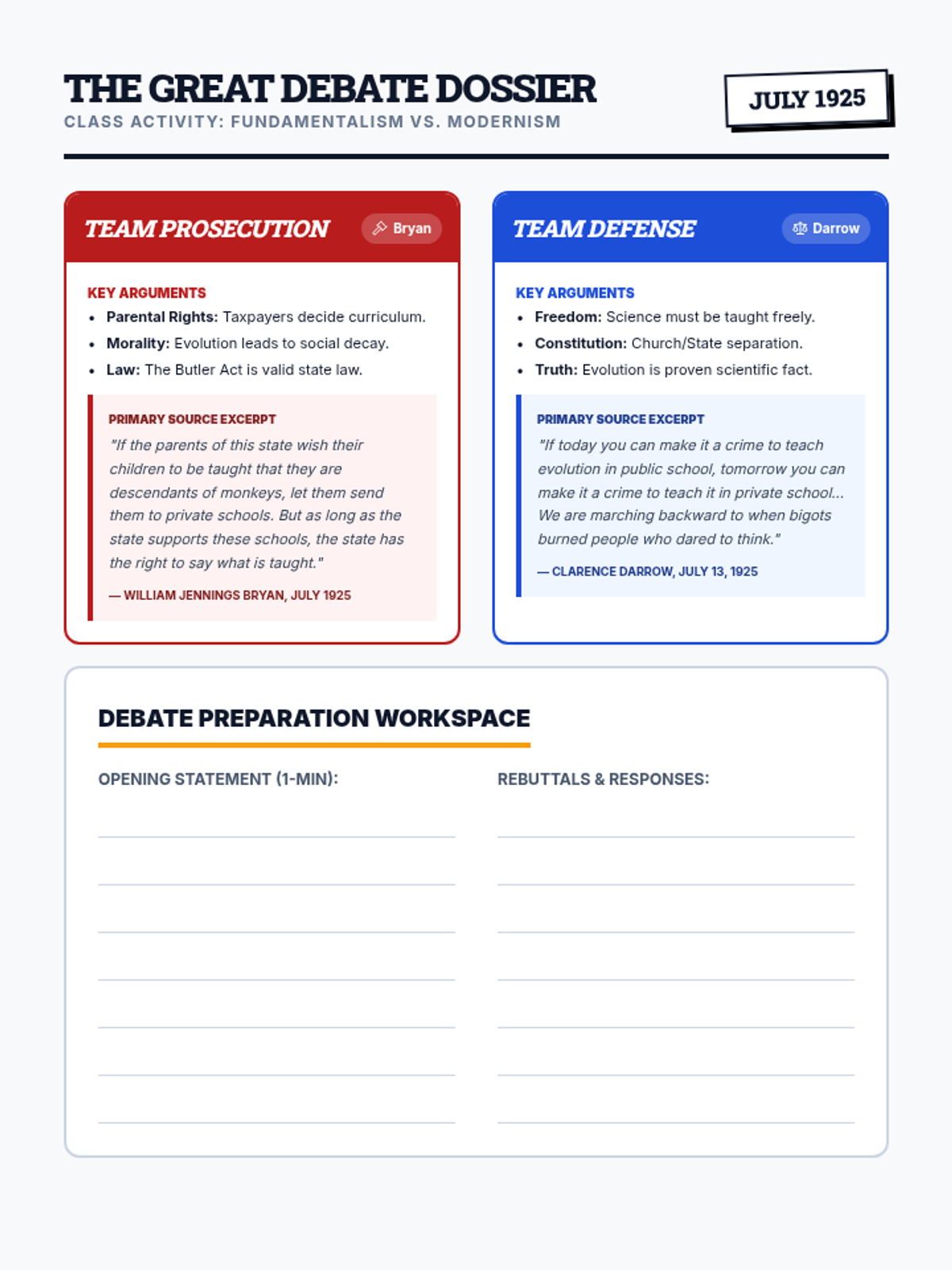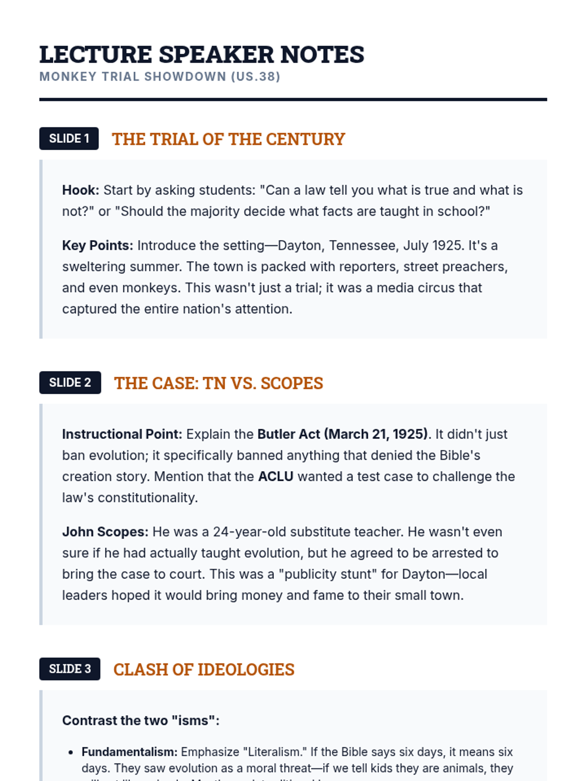 A 40-minute exploration of the 1925 Scopes Trial, focusing on the clash between fundamentalism and modernism through lecture and transcript analysis.