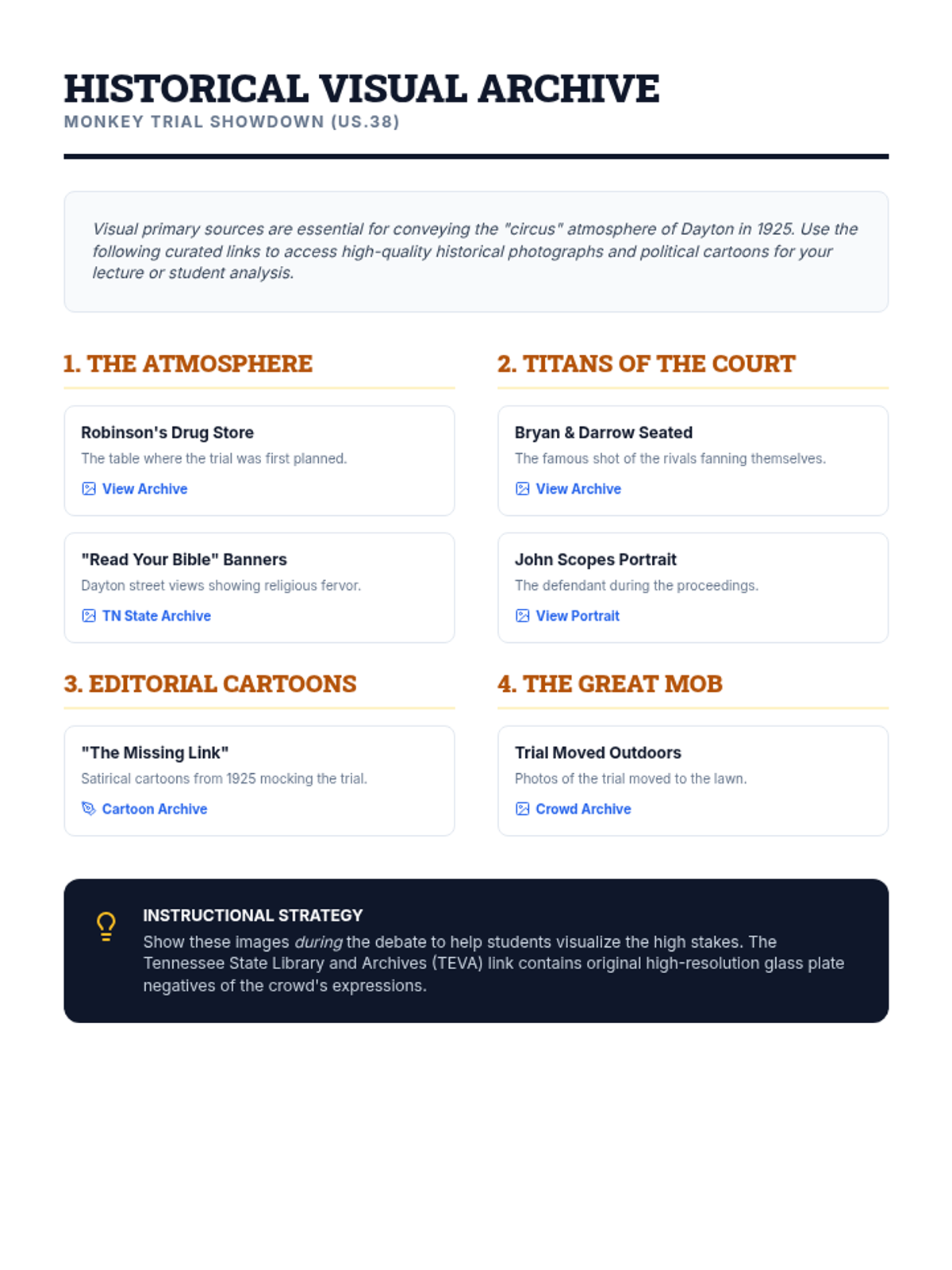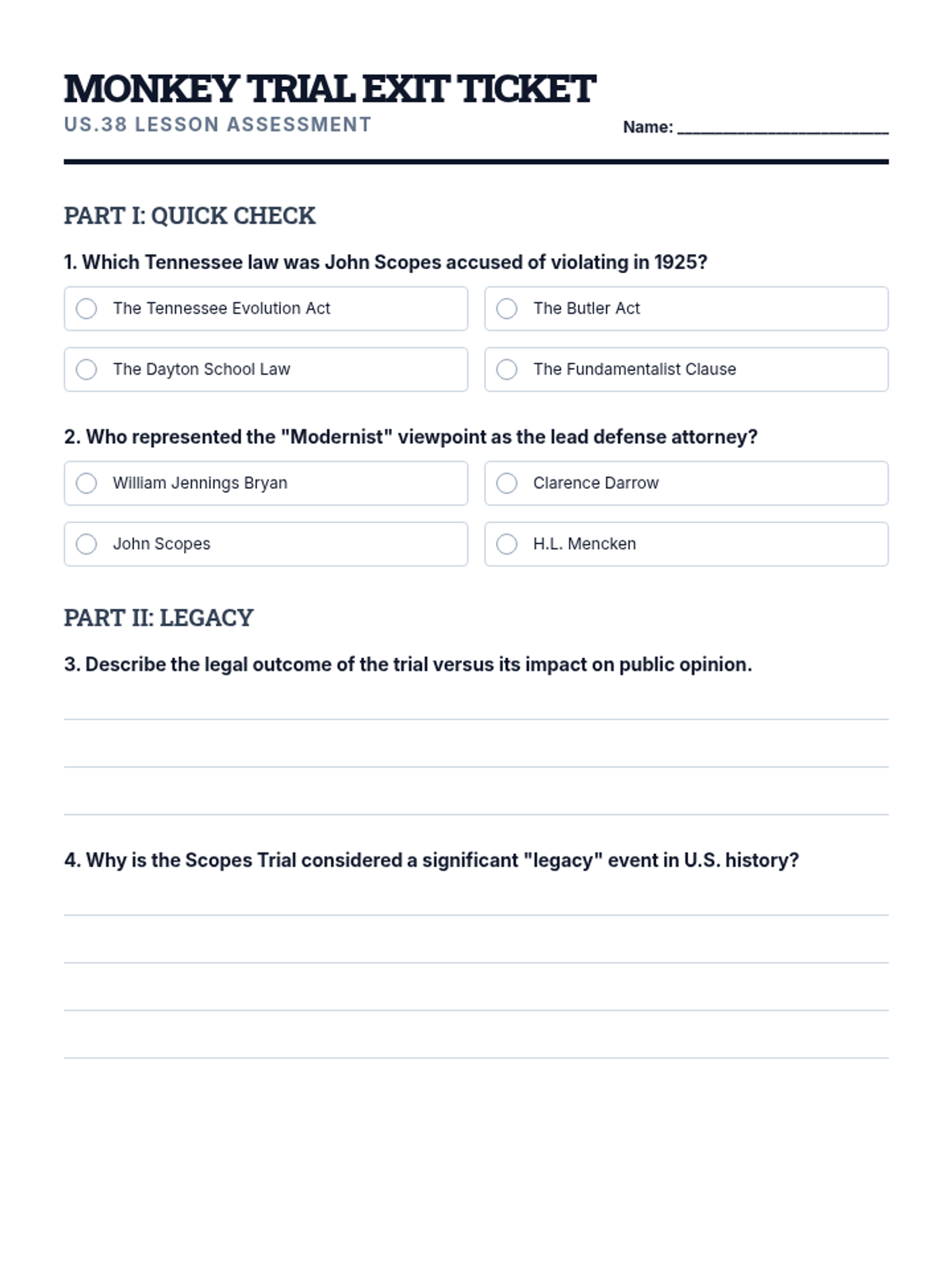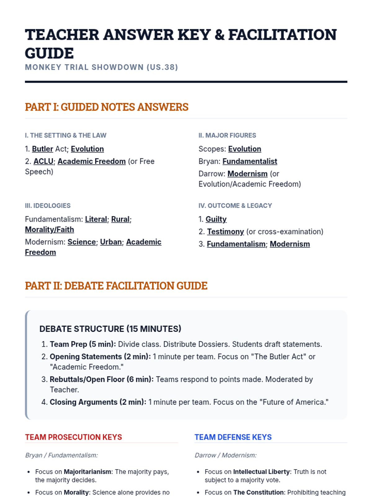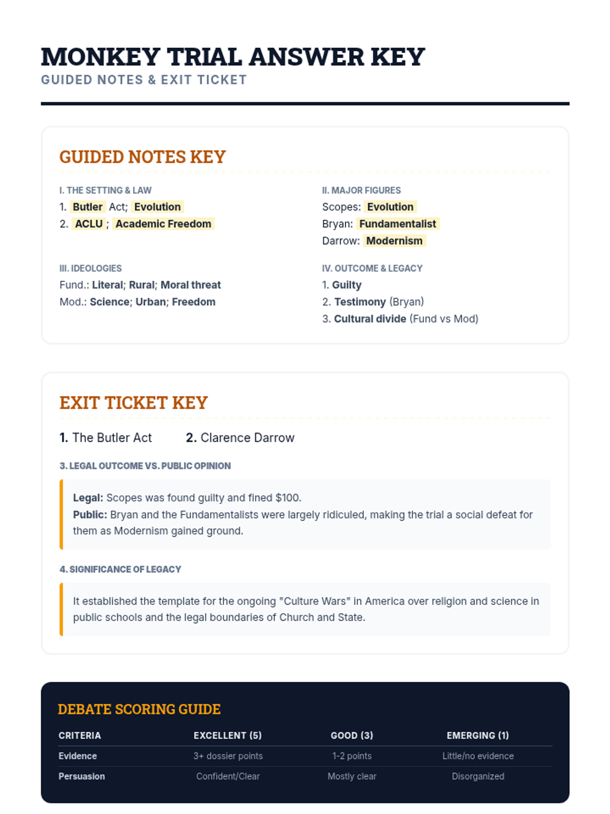 A 40-minute exploration of the 1925 Scopes Trial, focusing on the clash between fundamentalism and modernism through lecture and transcript analysis.