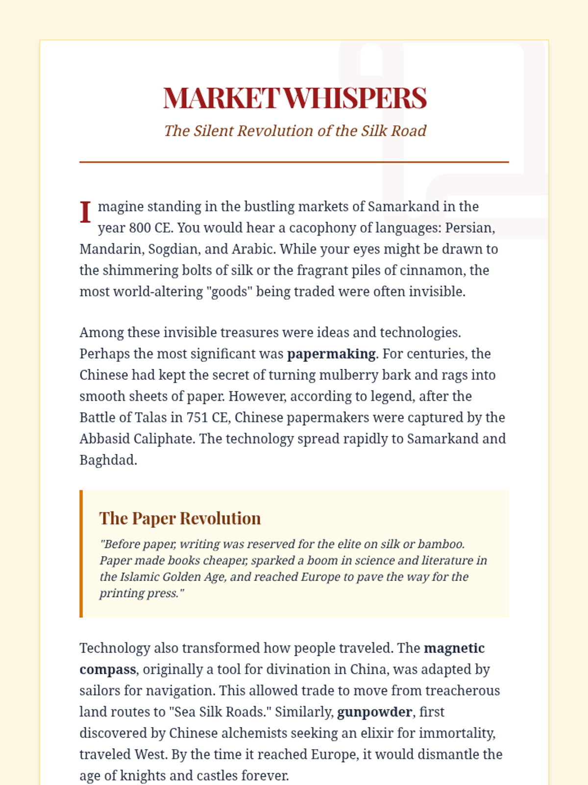 Students explore the complex web of the Silk Road, focusing on the movement of goods like silk and spices, and the revolutionary spread of technologies like papermaking and the magnetic compass. through map analysis and reading comprehension.