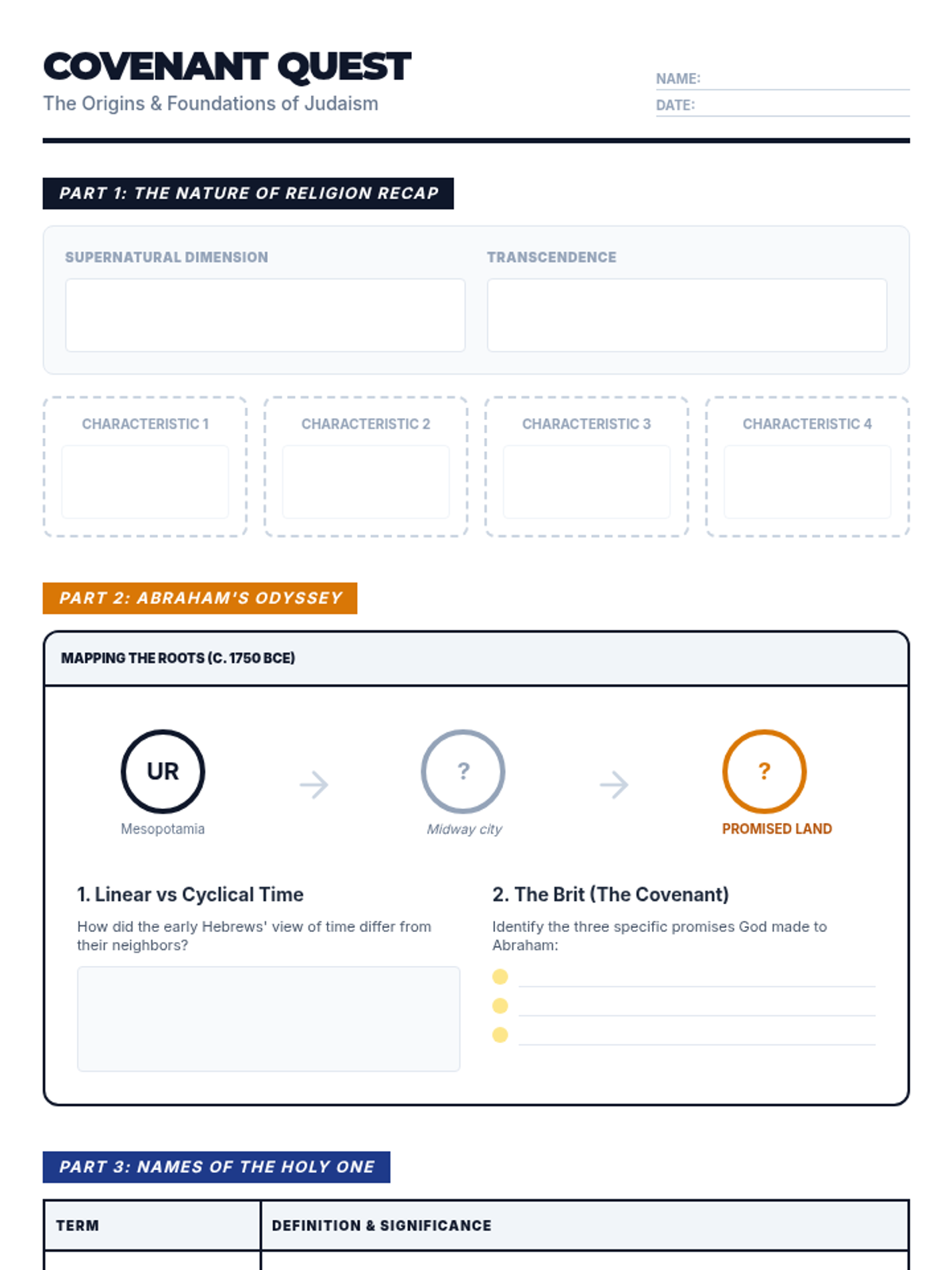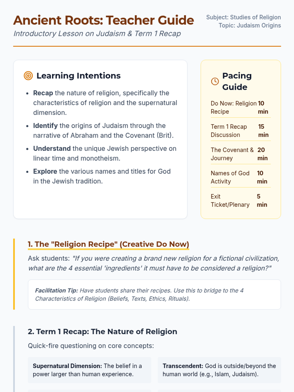 An introductory lesson on Judaism exploring its origins through the story of Abraham and the Covenant, while recapping the Nature of Religion and Beliefs from Term 1.