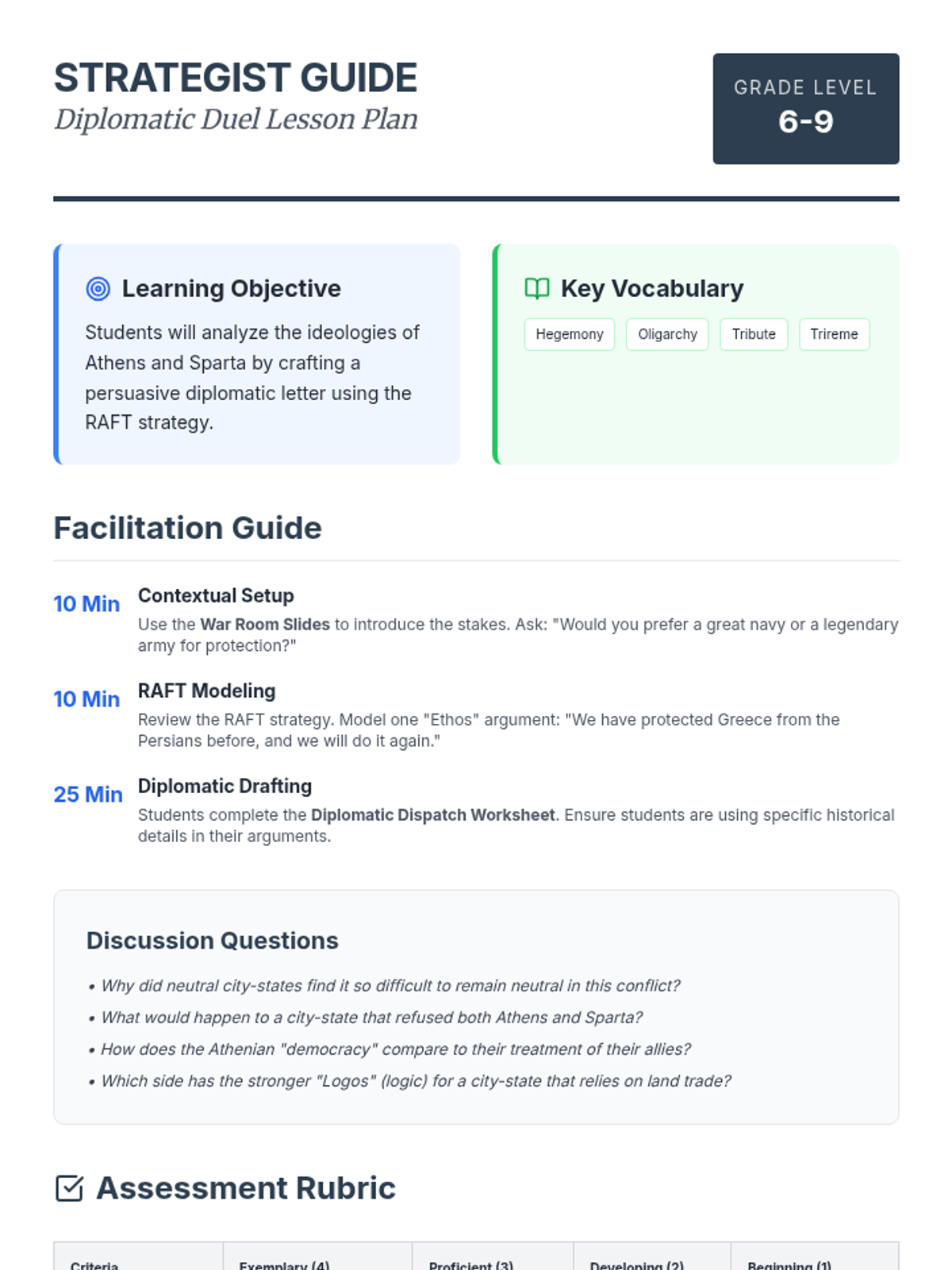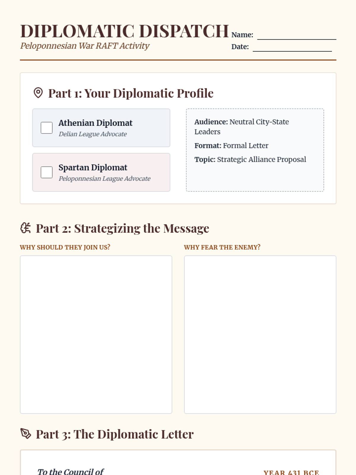 Students step into the shoes of Athenian or Spartan diplomats during the Peloponnesian War. Using the RAFT strategy, they will craft persuasive diplomatic letters to recruit neutral Greek city-states to their side.