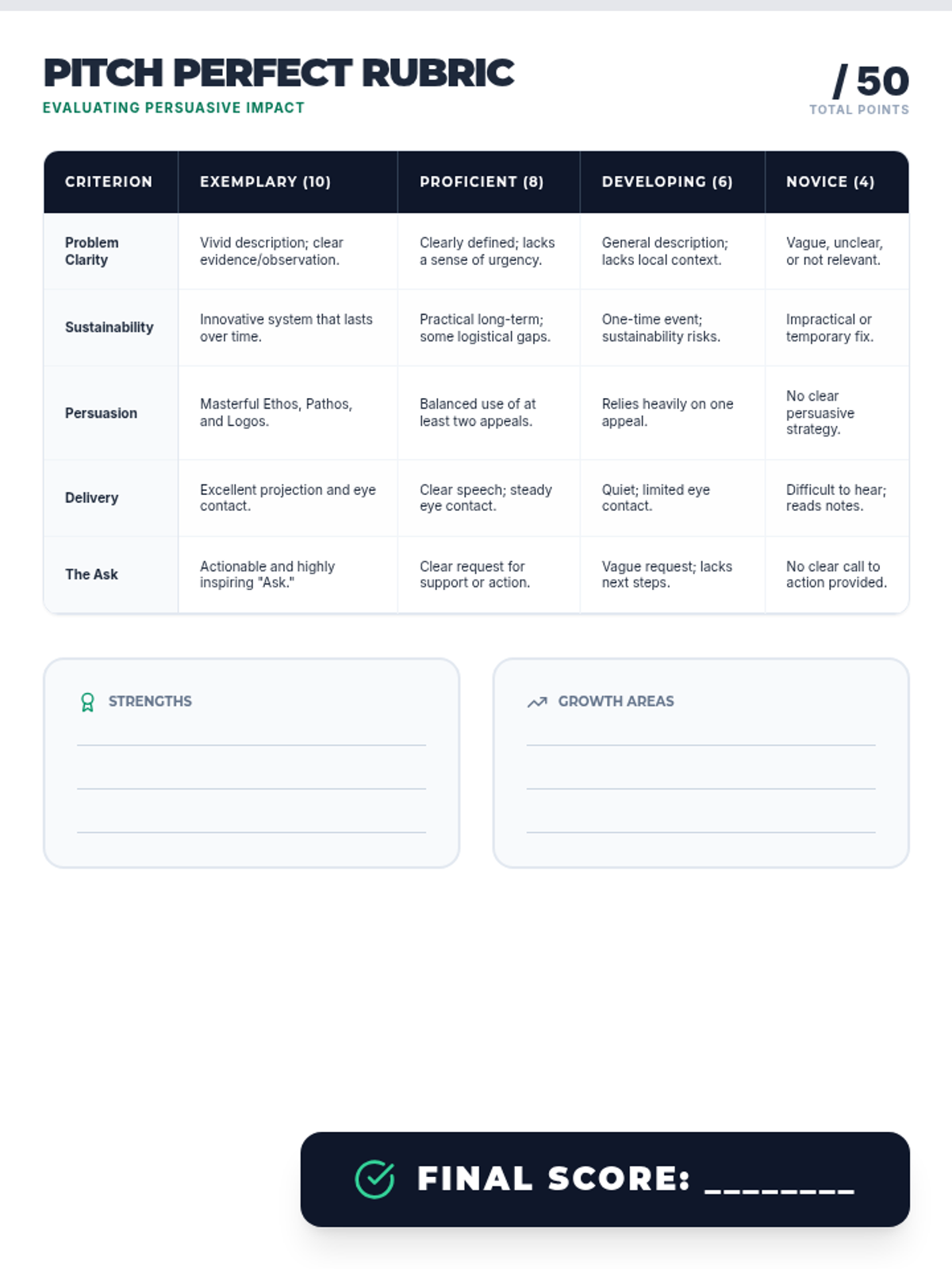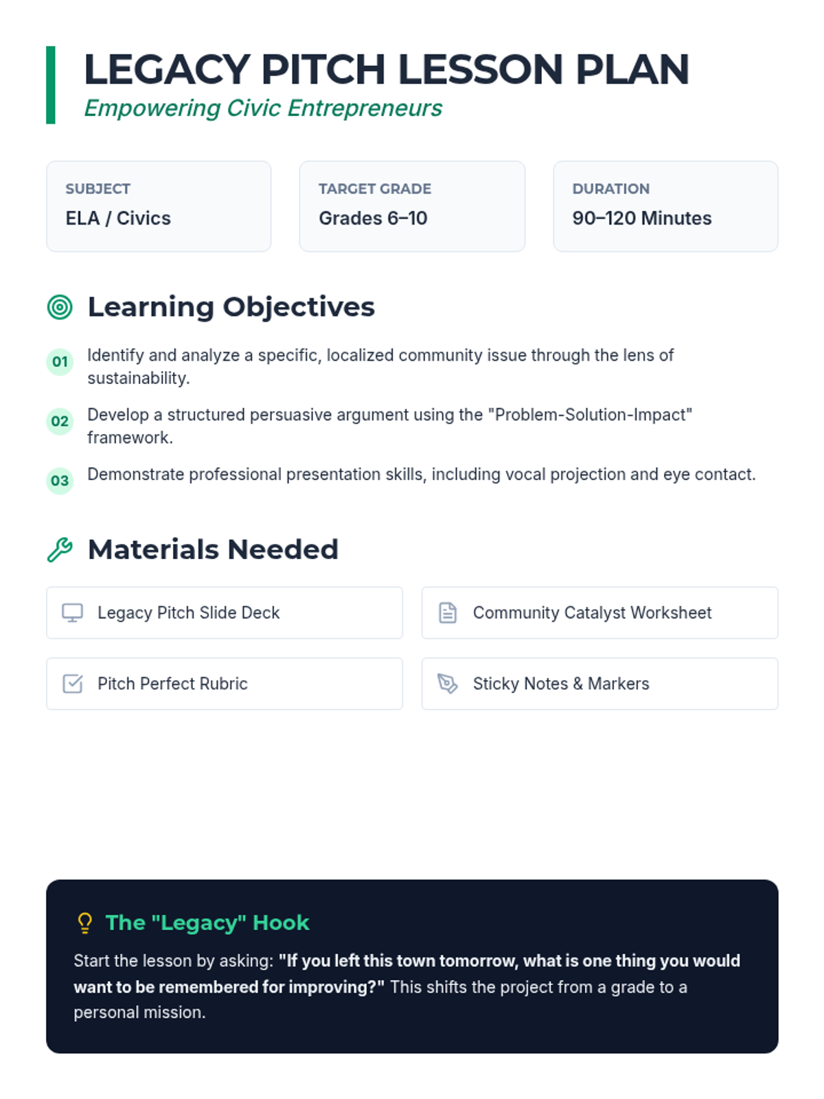 A comprehensive lesson guiding students through the process of identifying community needs and crafting a professional, persuasive pitch for a sustainable solution. Students develop public speaking skills while engaging in civic problem-solving.