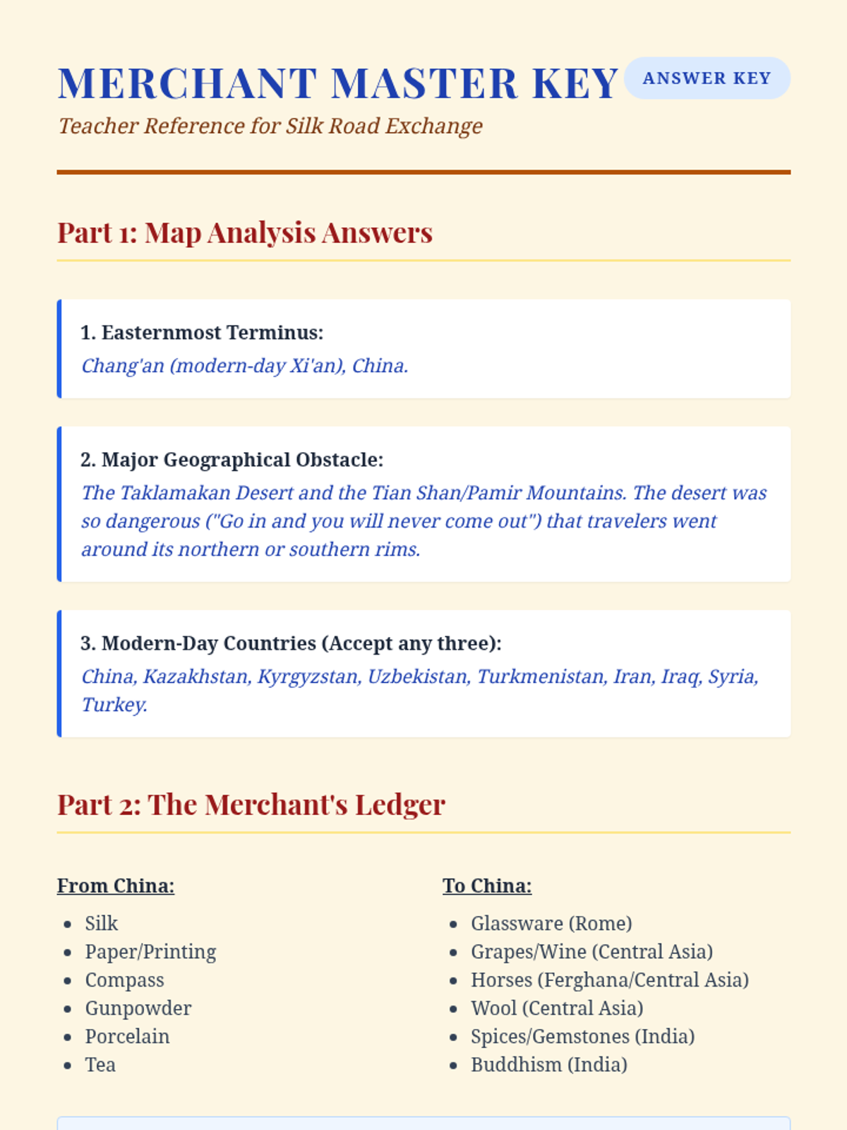 An assessment lesson evaluating student knowledge of the Silk Road's trade goods, geographical challenges, and the cross-cultural exchange of inventions and technology.