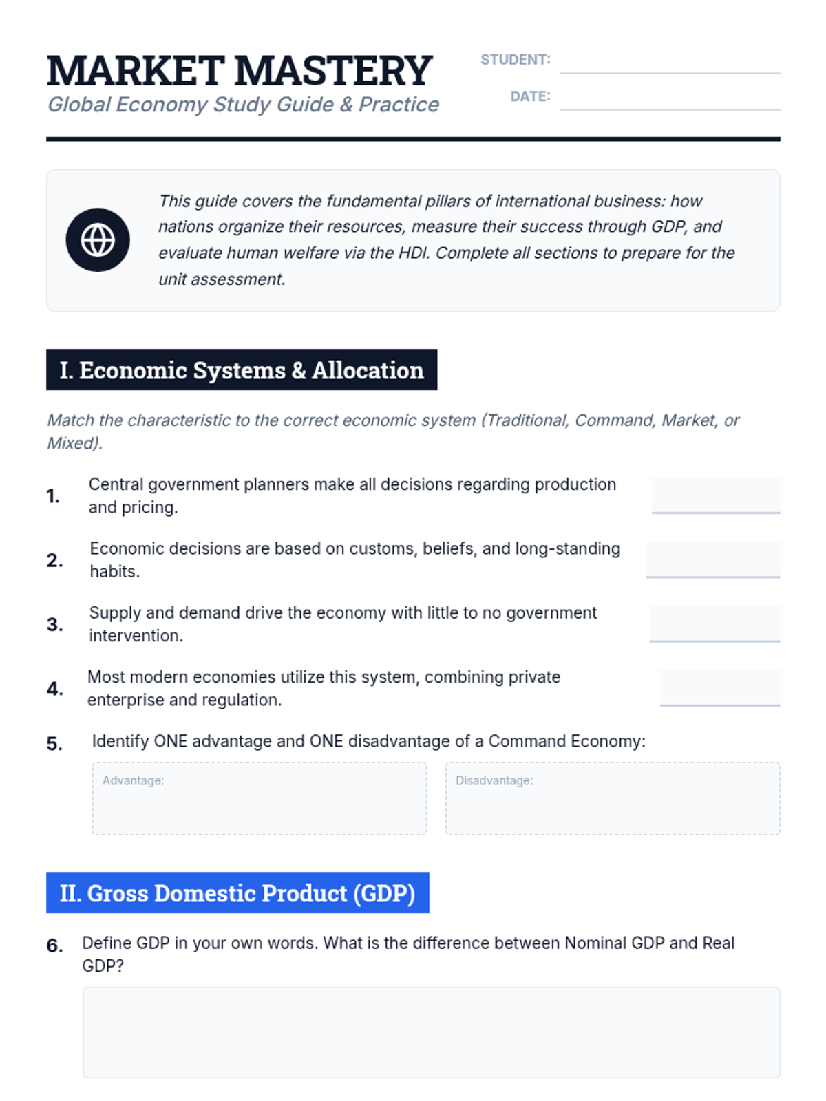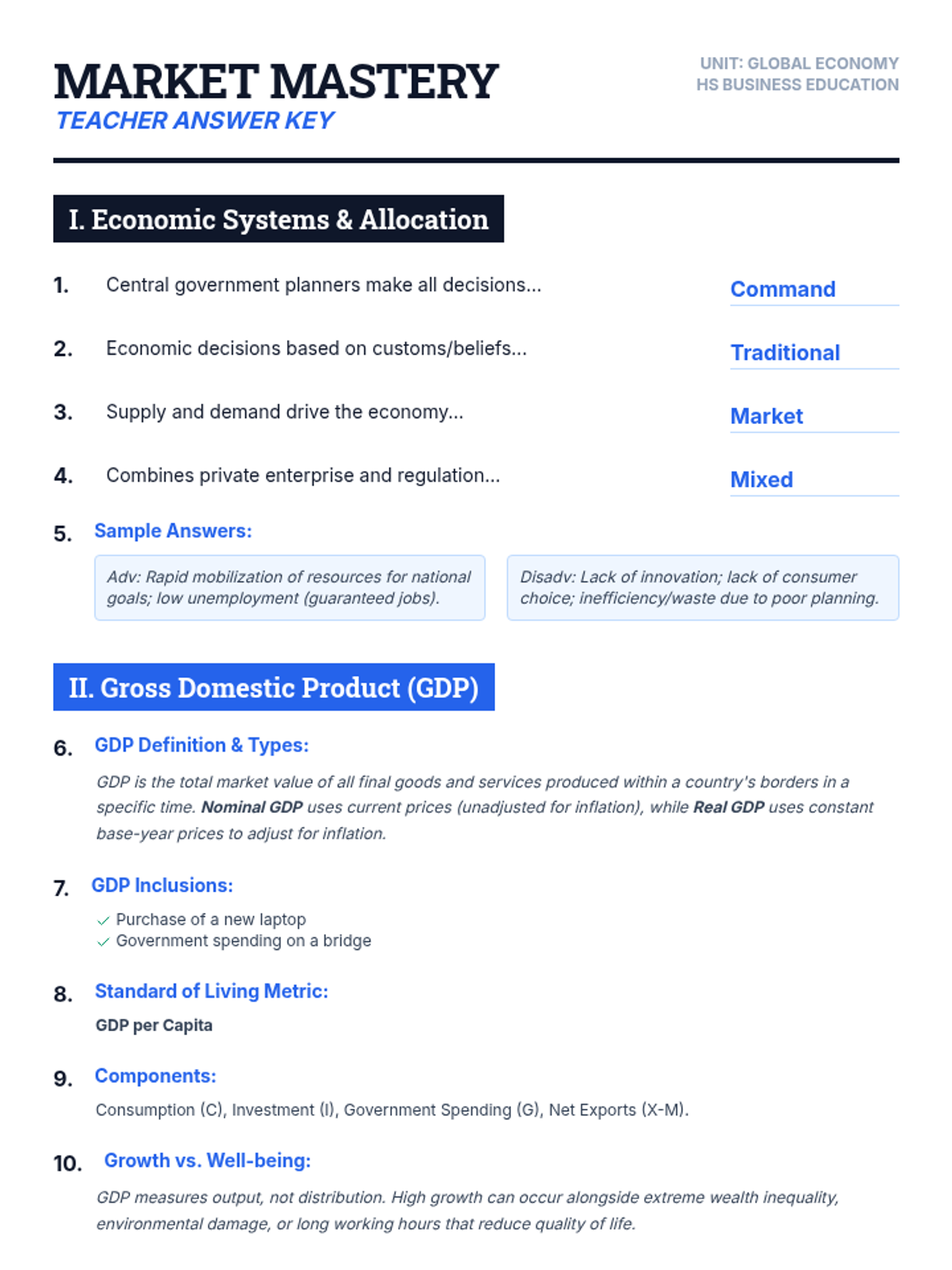 A comprehensive study guide and assessment resource covering economic systems, GDP, HDI, and global trade dynamics for high school business students.
