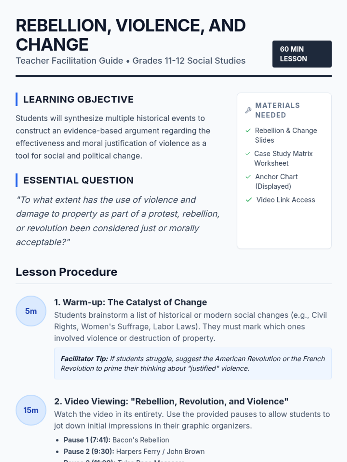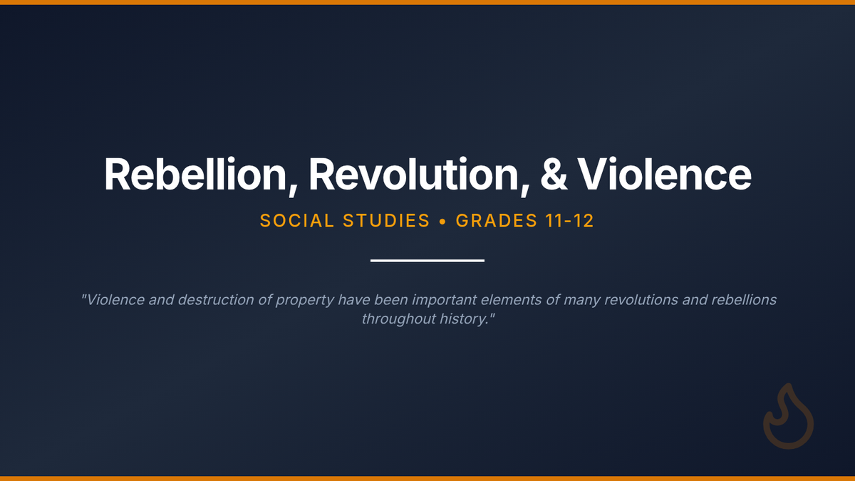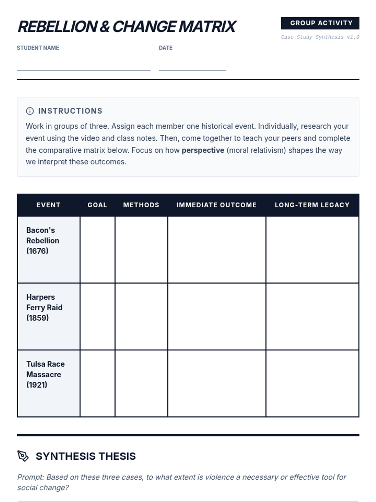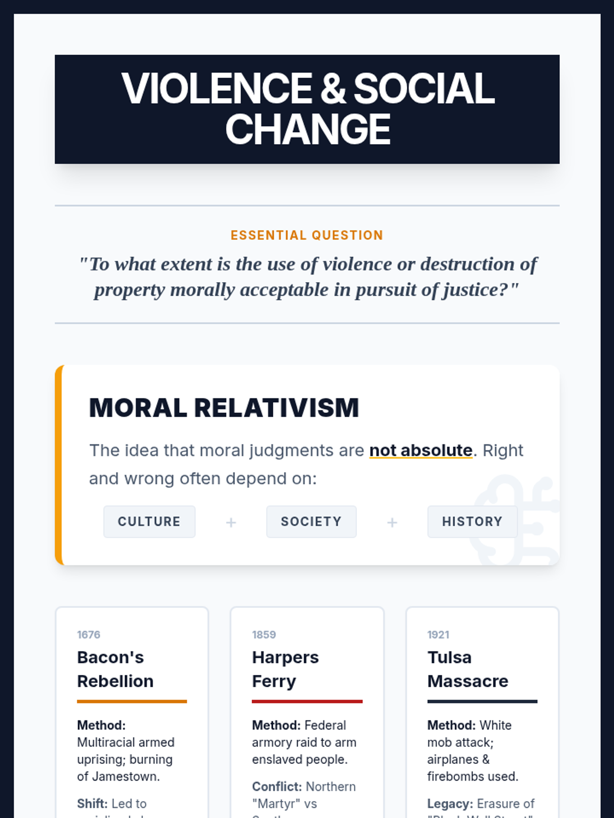 A high school social studies lesson exploring the role of violence in social change through the lens of moral relativism, focusing on Bacon's Rebellion, John Brown's Raid, and the Tulsa Race Massacre.