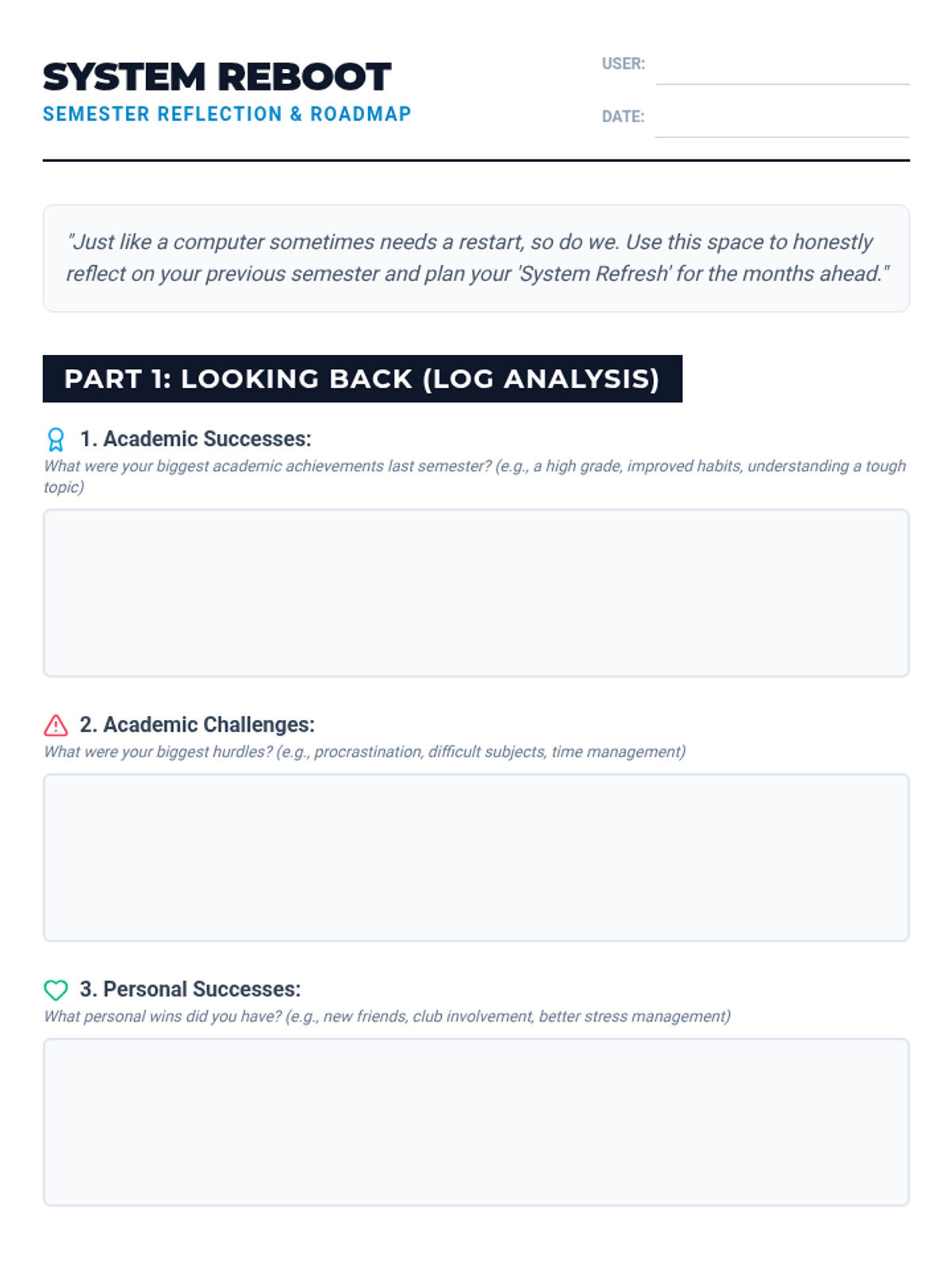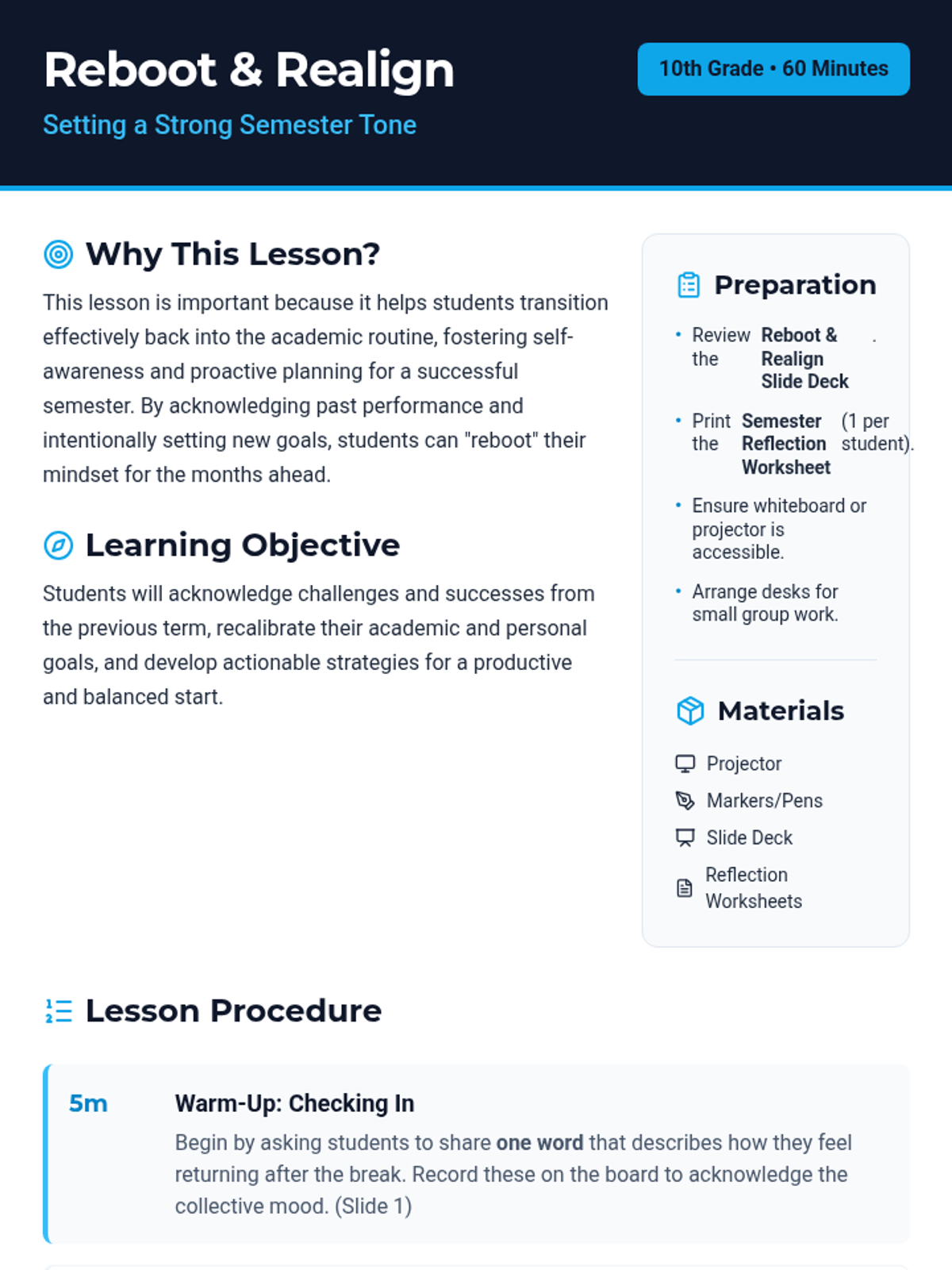 This lesson guides 10th-grade students in reflecting on their return to school after the break, helping them to re-establish focus and set positive intentions for the new semester. Students will recalibrate their academic and personal goals and develop strategies for a productive start.