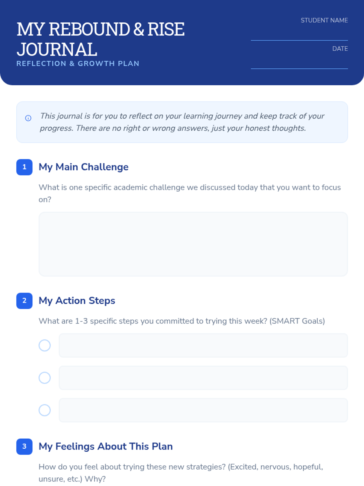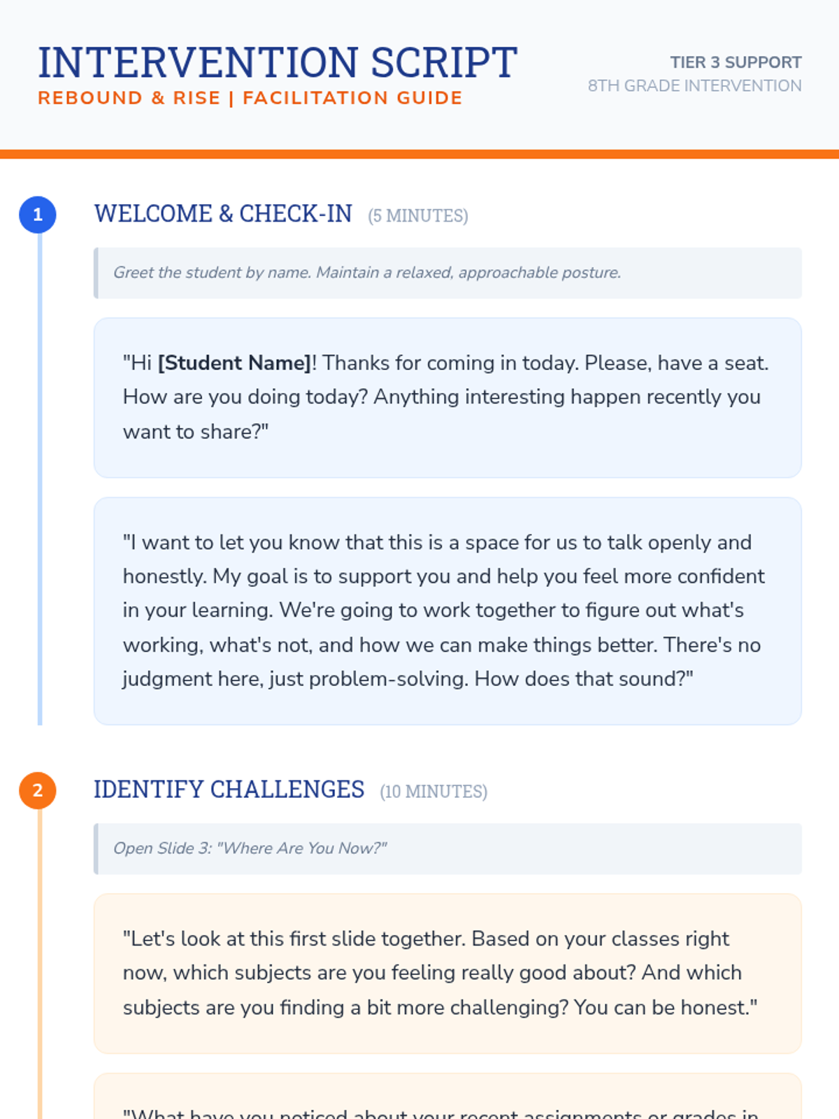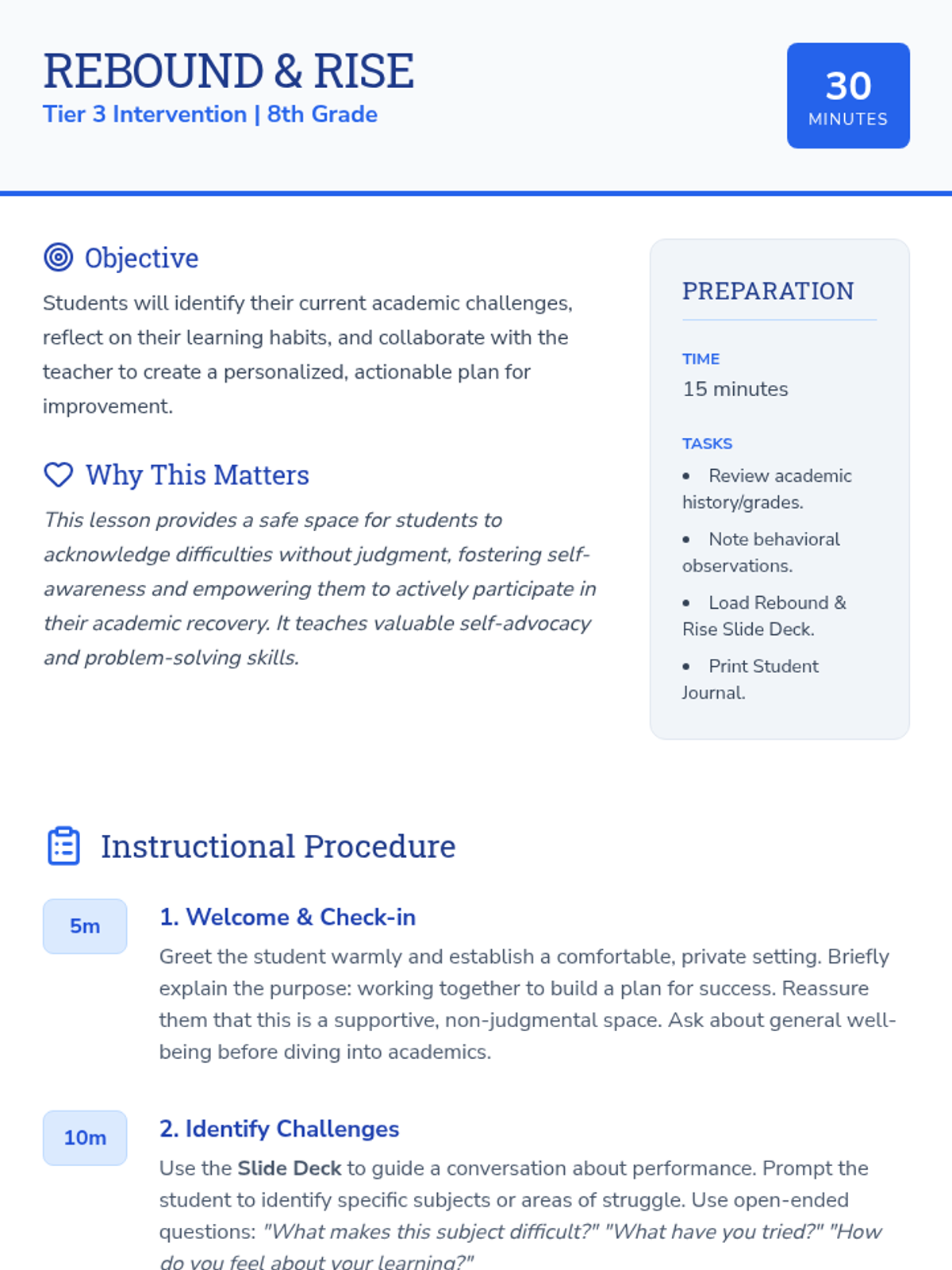 A 30-minute Tier 3 intervention for 8th-grade students focused on identifying academic challenges and developing personalized growth strategies through a supportive, collaborative process.
