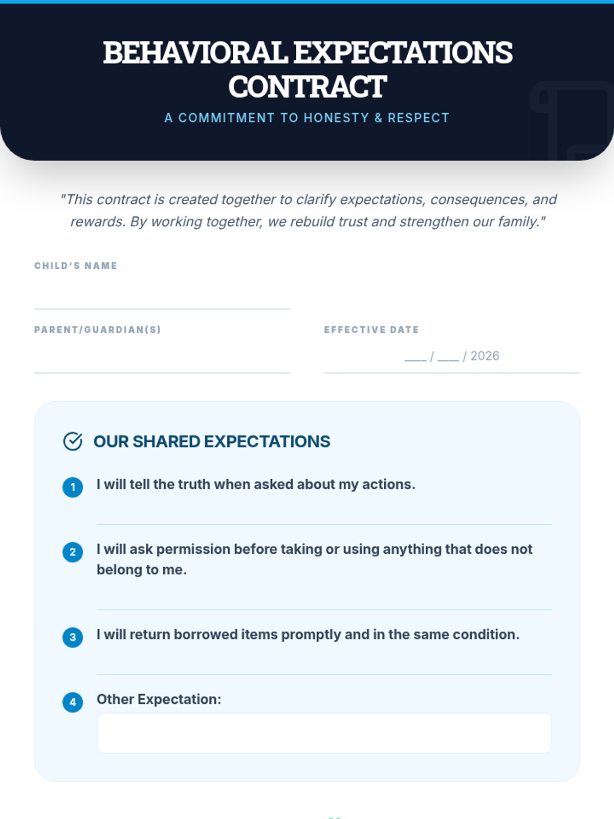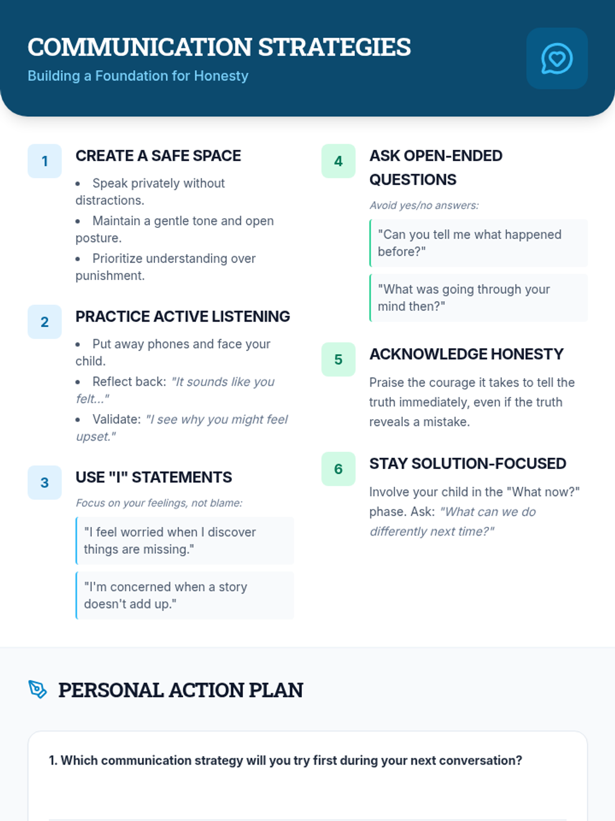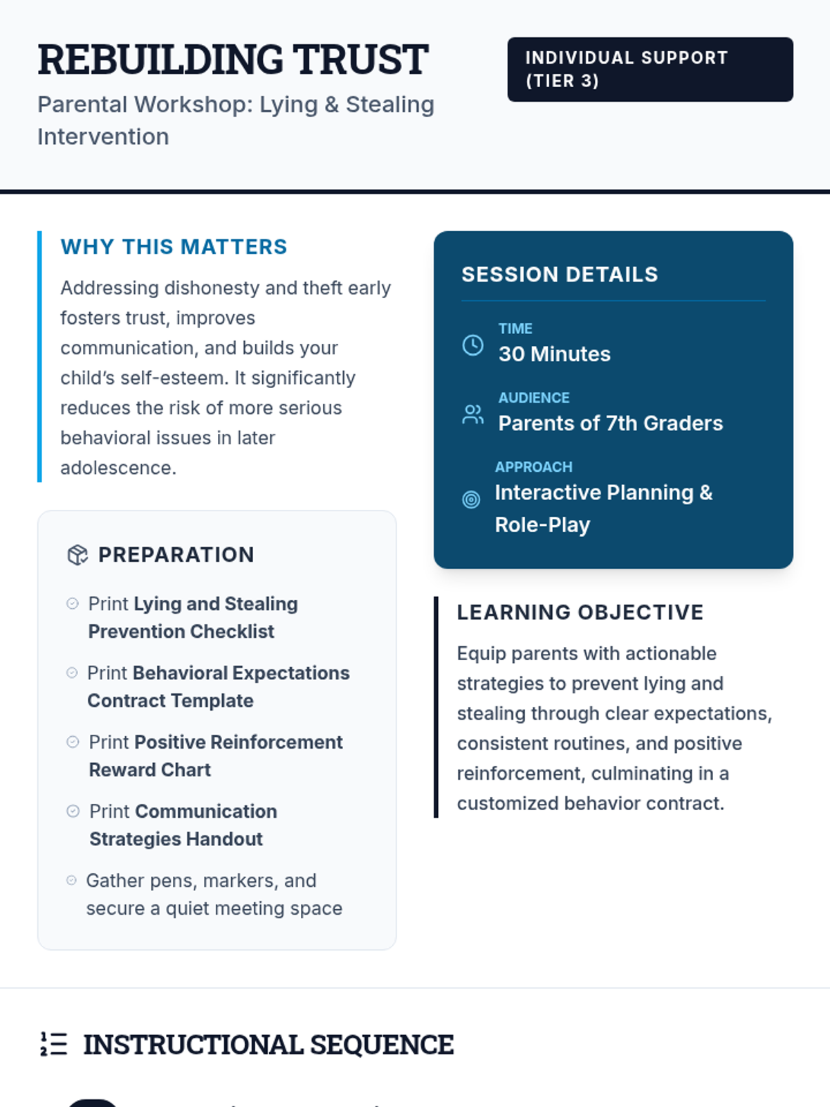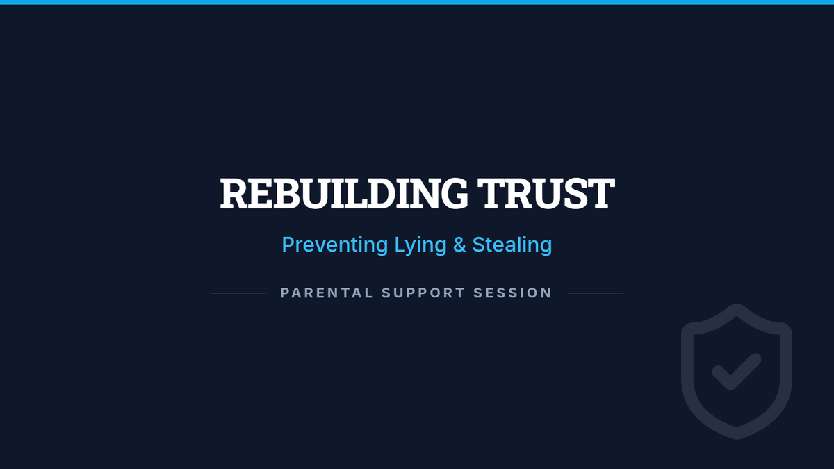 A 30-minute individual support session for parents of 7th graders to address lying and stealing through structured routines, behavior contracts, and open communication.