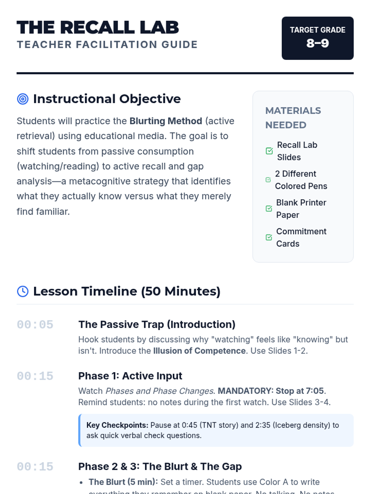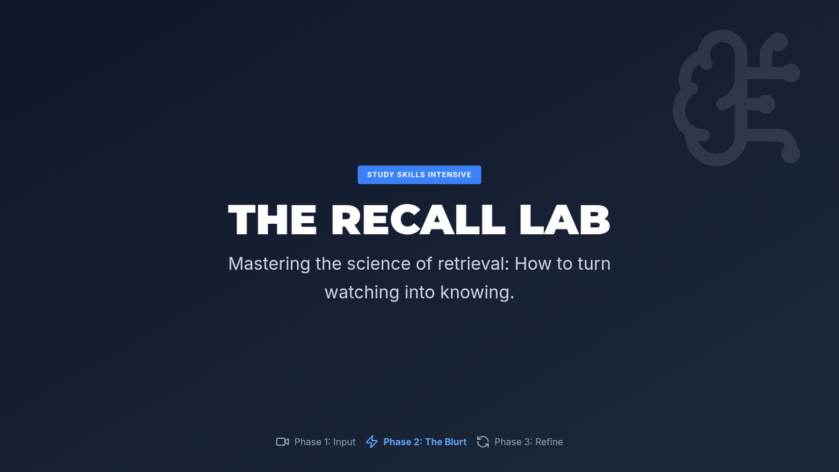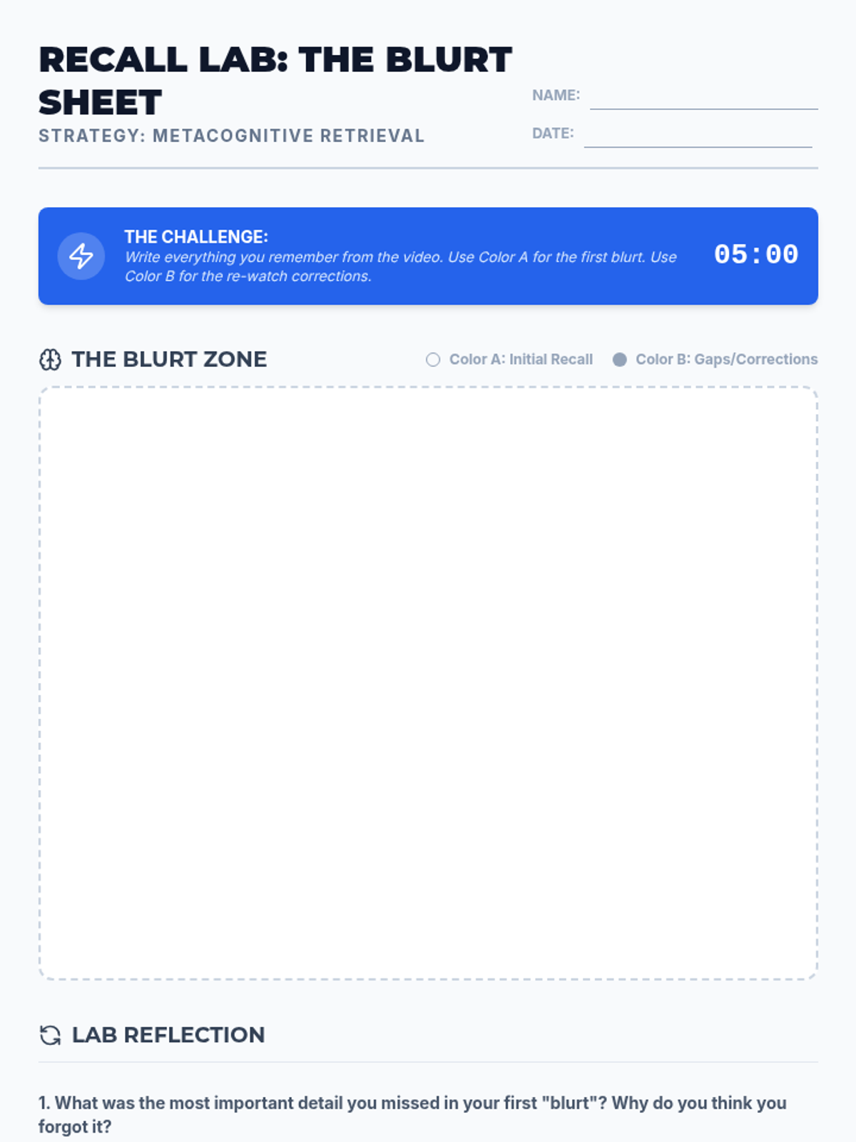 A study-skills focused lesson for 8th-9th graders that uses a science video as a vehicle to practice the 'Blurting Method,' a metacognitive retrieval strategy. Students learn to move beyond passive watching to active recall and gap analysis.