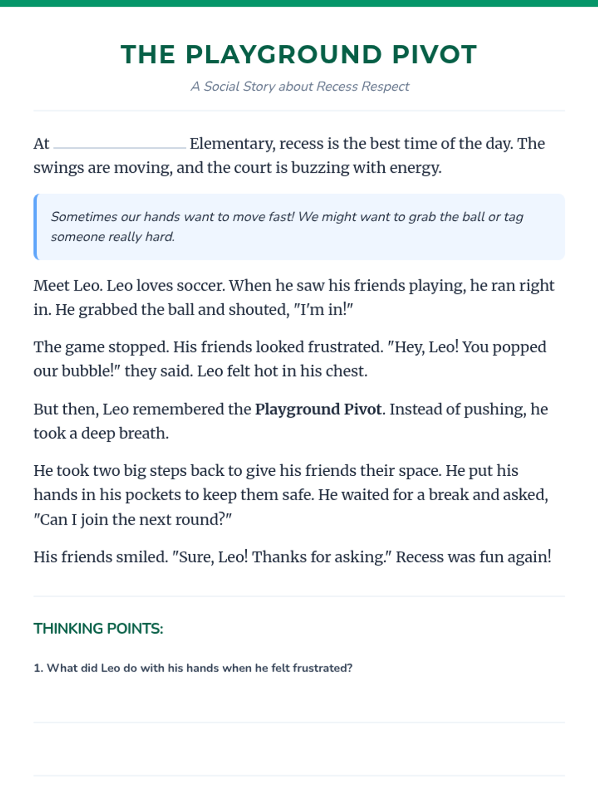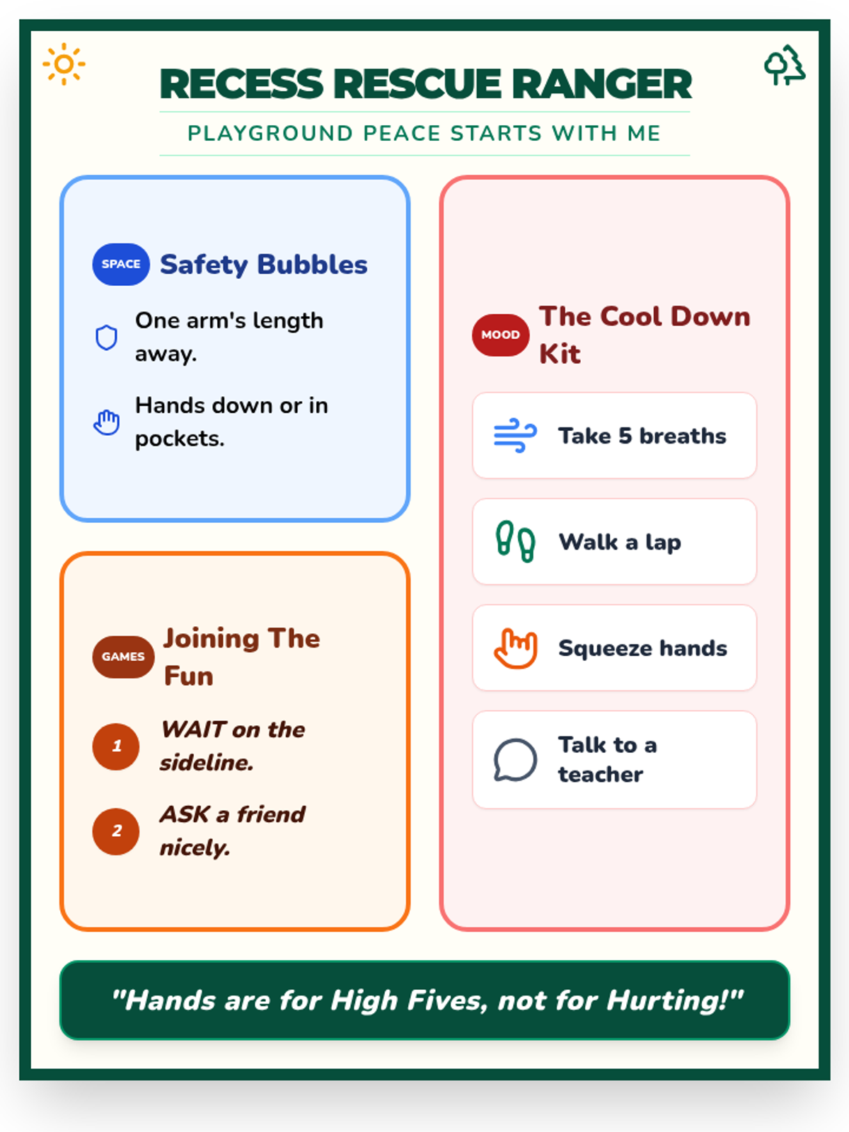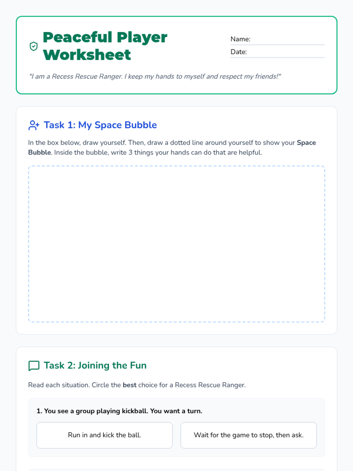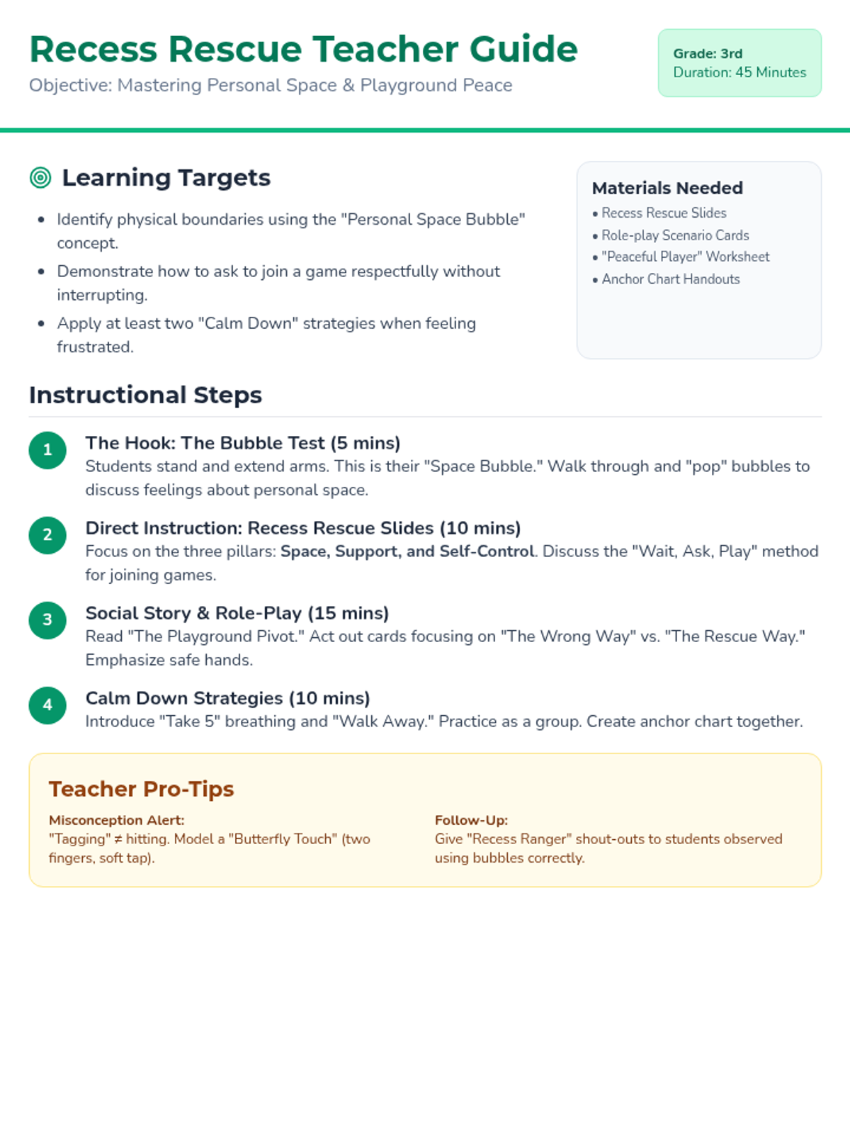 A social-emotional learning lesson for 3rd graders focused on playground etiquette, personal space, and emotional regulation during recess. Students learn to respect games in progress, maintain their 'personal bubble,' and use calming strategies when frustrated.