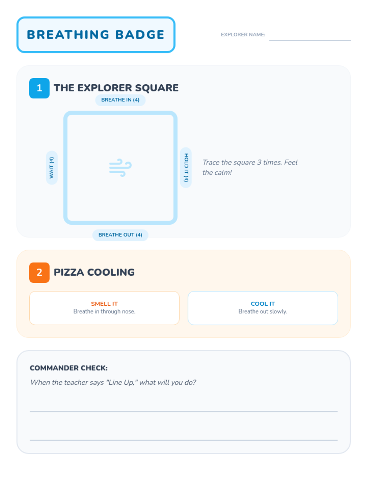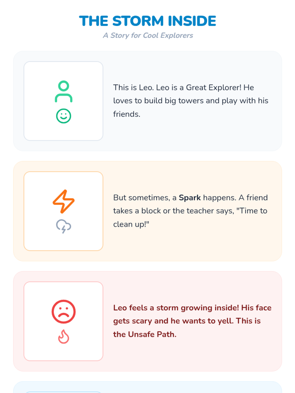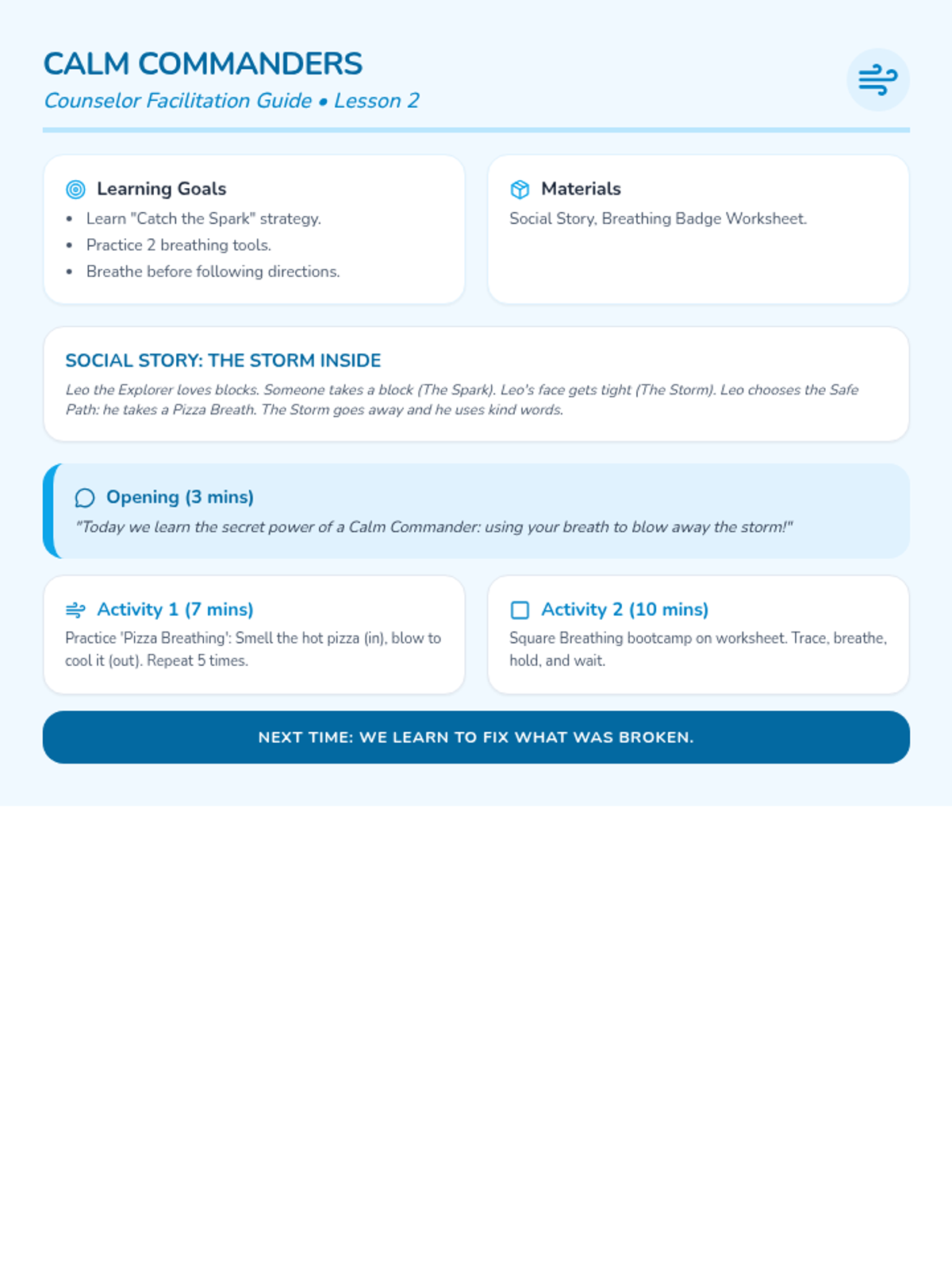 Teaches practical calm-down breathing techniques and tools through a social story and visual guide.