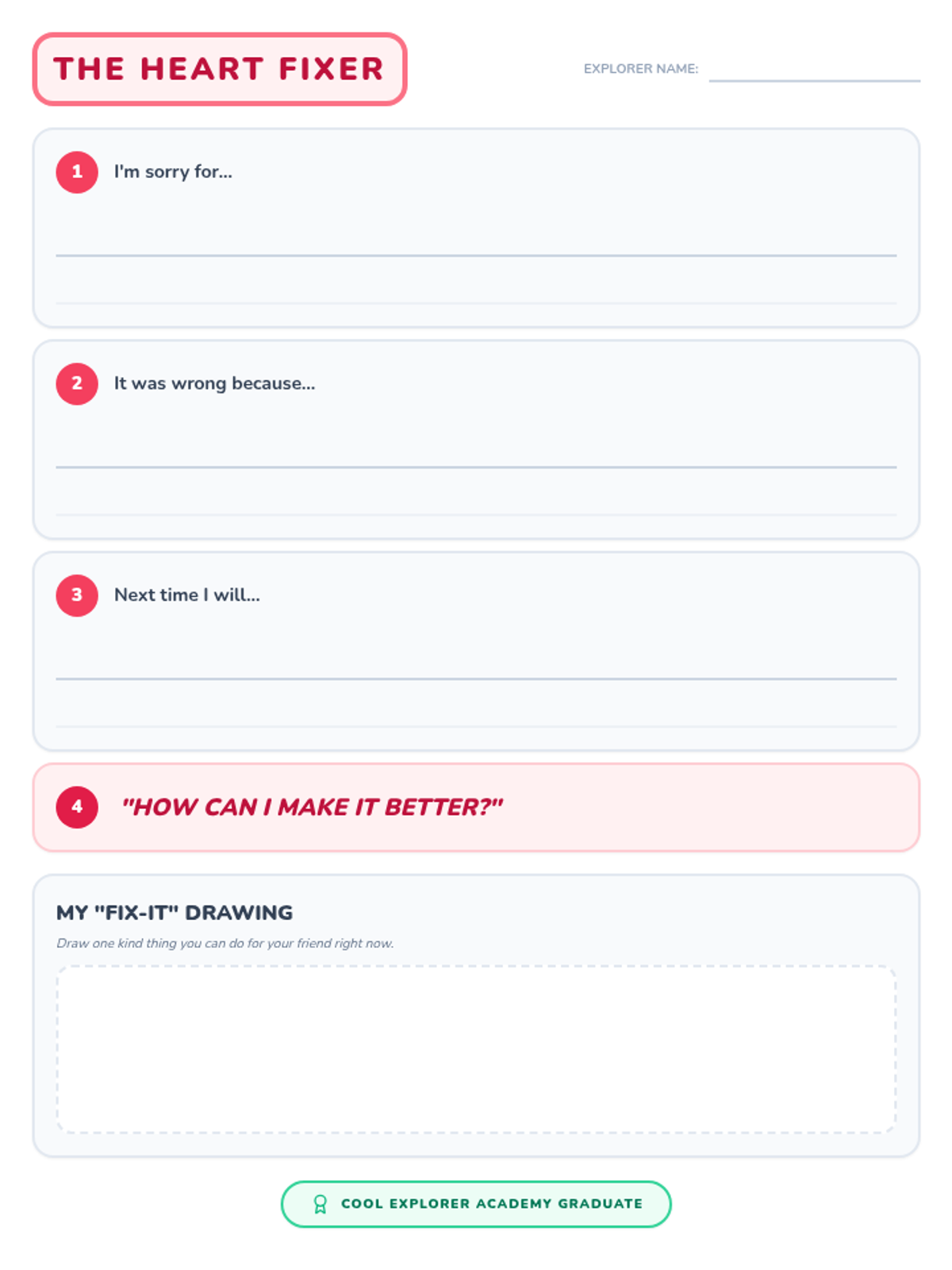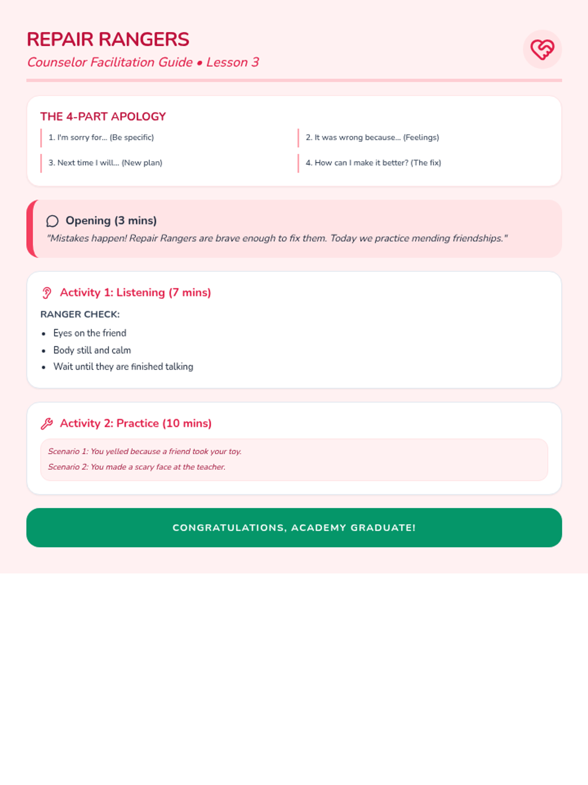 Teaches active listening and the steps of a meaningful apology to repair relationships with peers.