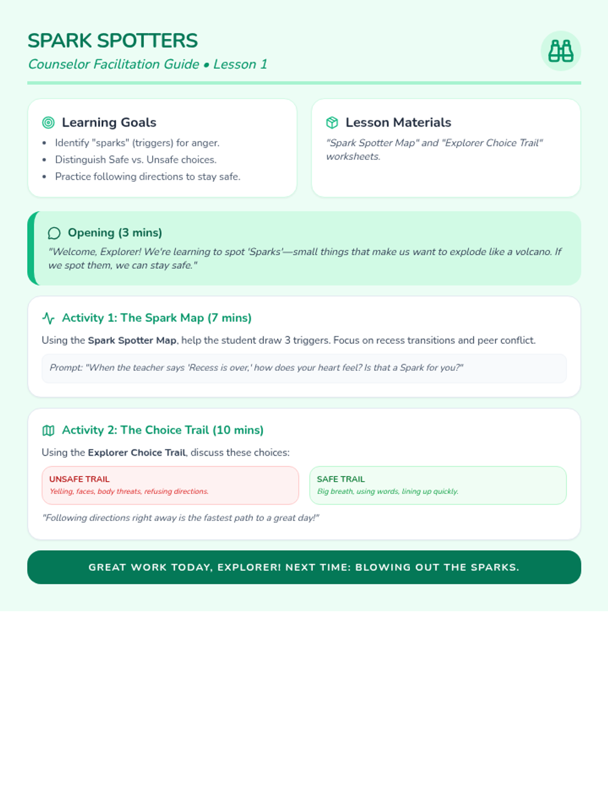 Focuses on identifying personal anger triggers and distinguishing between safe and unsafe choices when big feelings arise.
