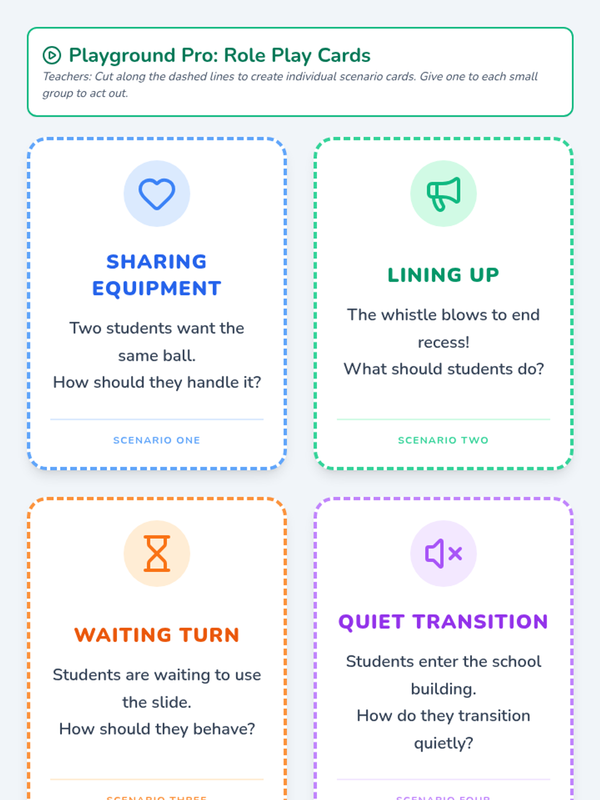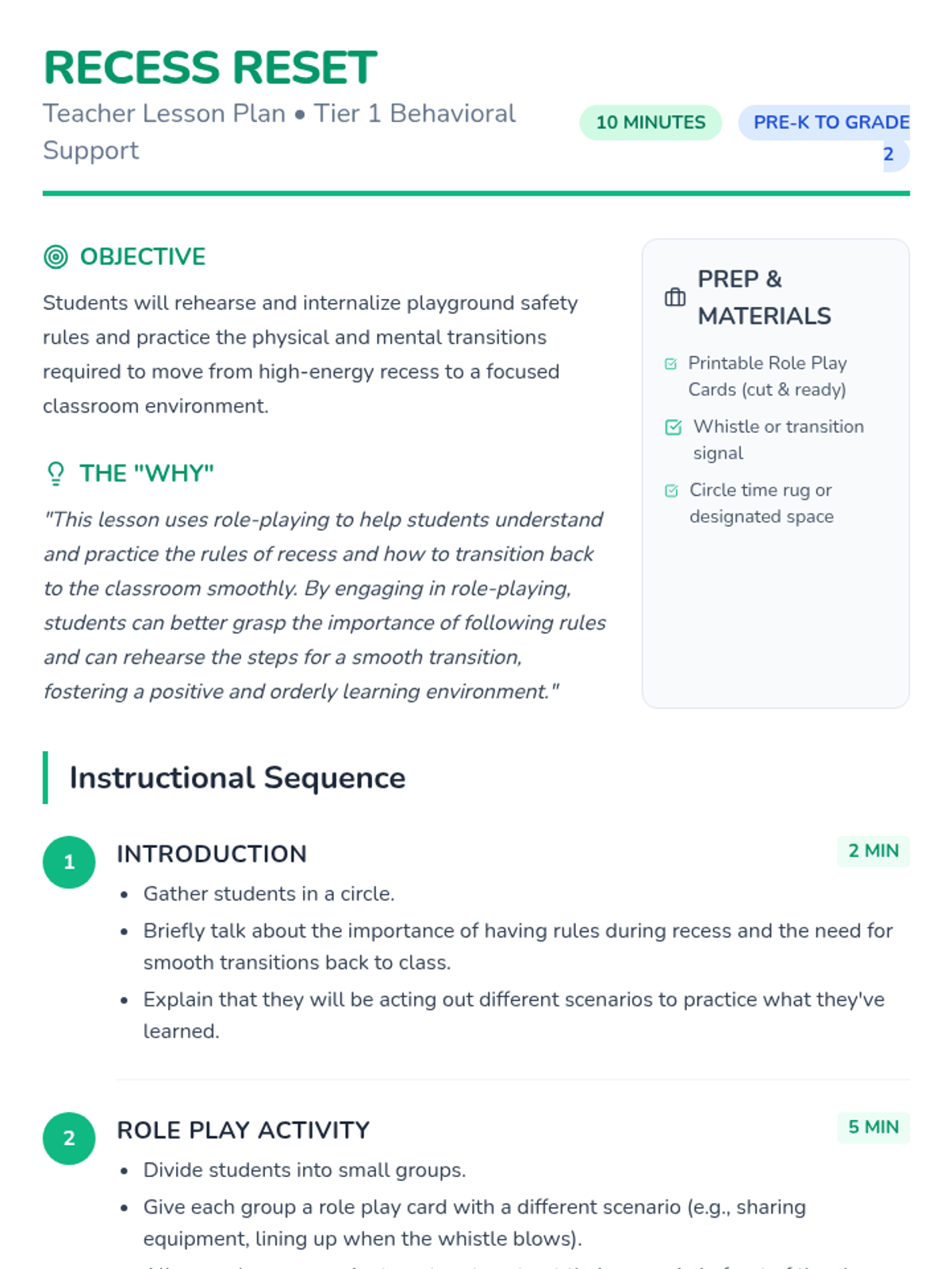 A quick and interactive lesson where students use role-playing to practice recess rules and master the art of transitioning back to the classroom smoothly.