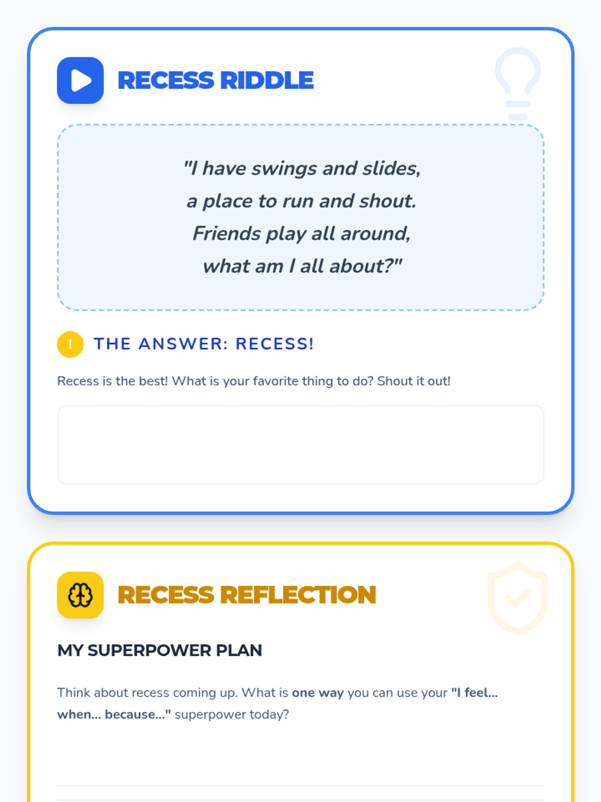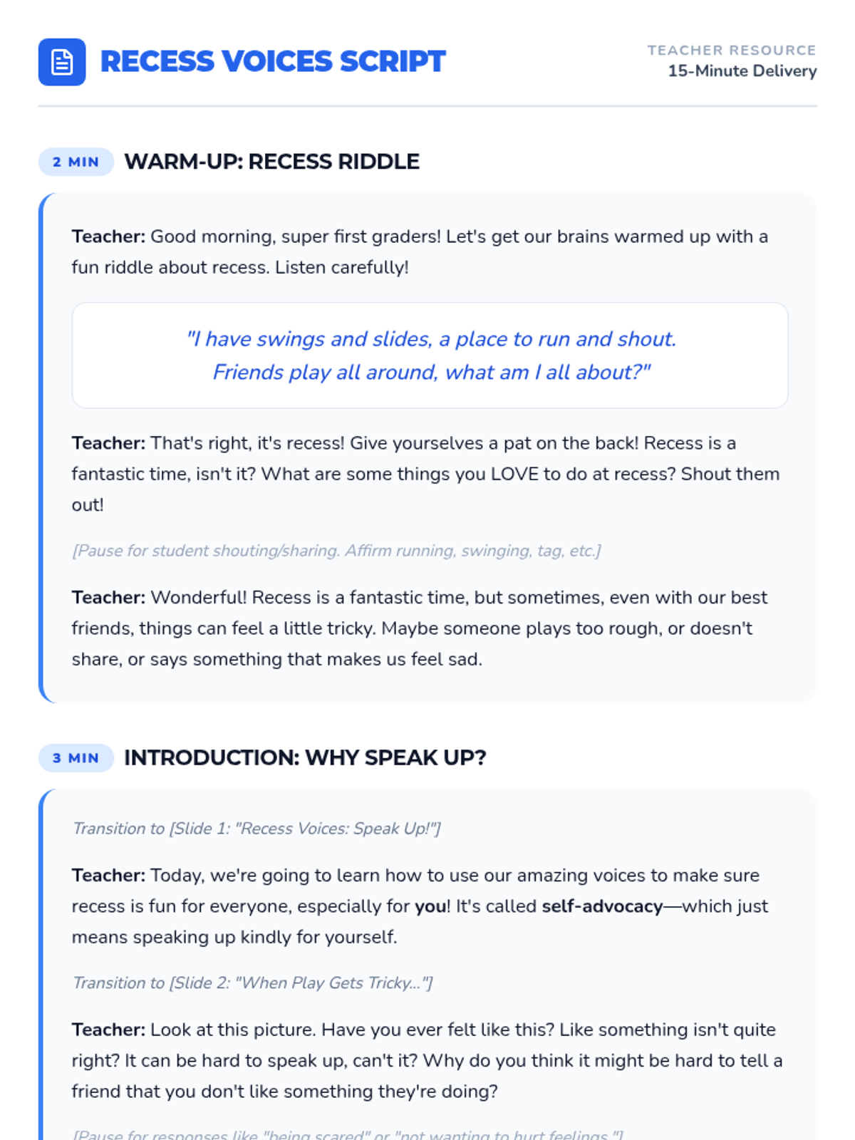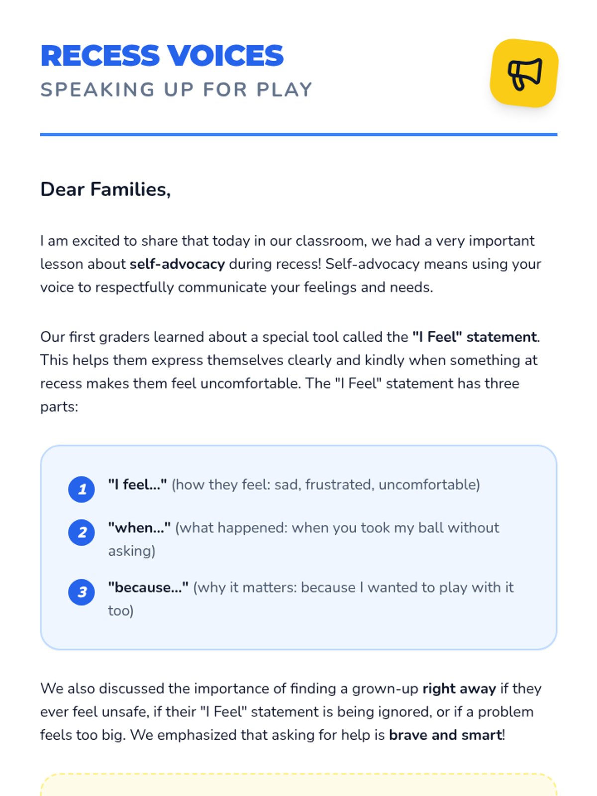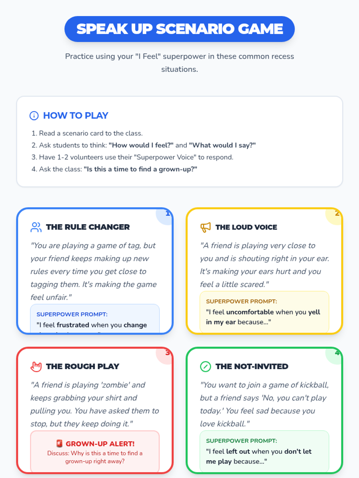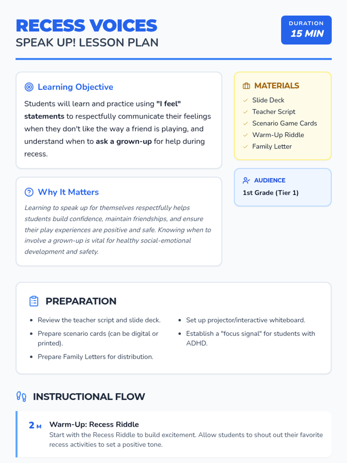 A 15-minute Tier 1 lesson for first graders on self-advocacy and 'I Feel' statements during recess. Students learn to communicate boundaries and identify when to seek adult help.