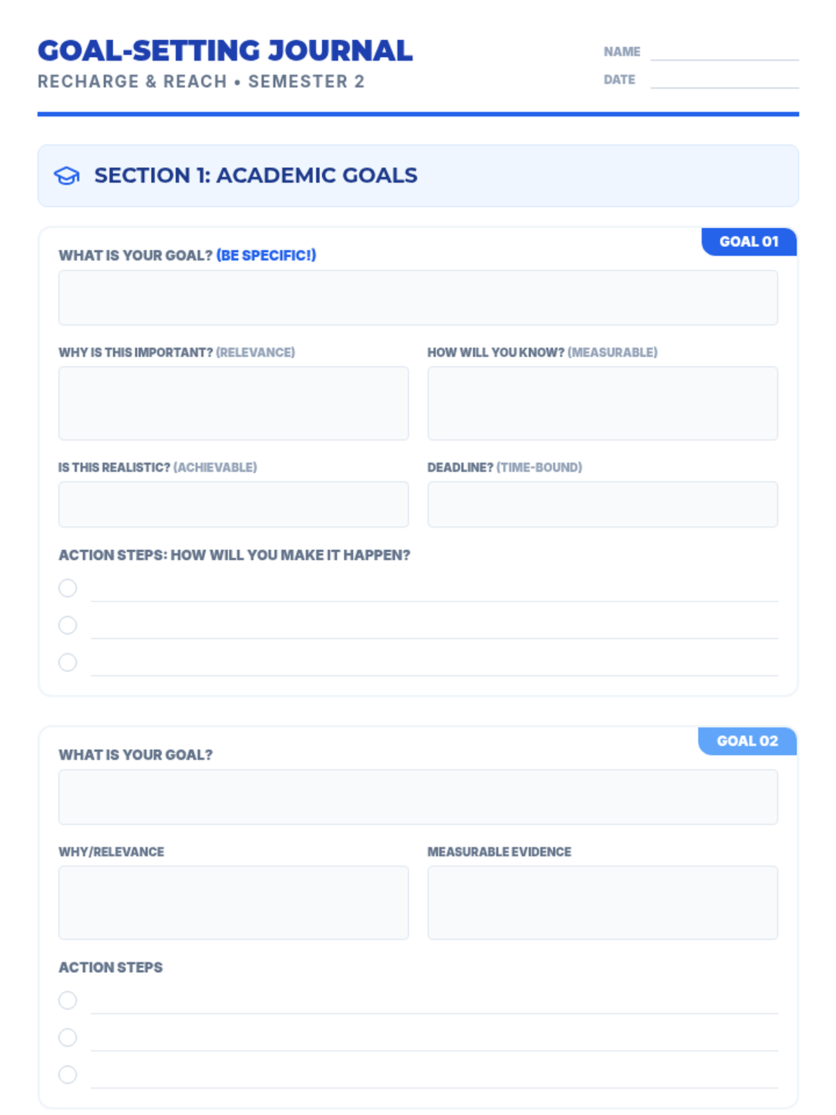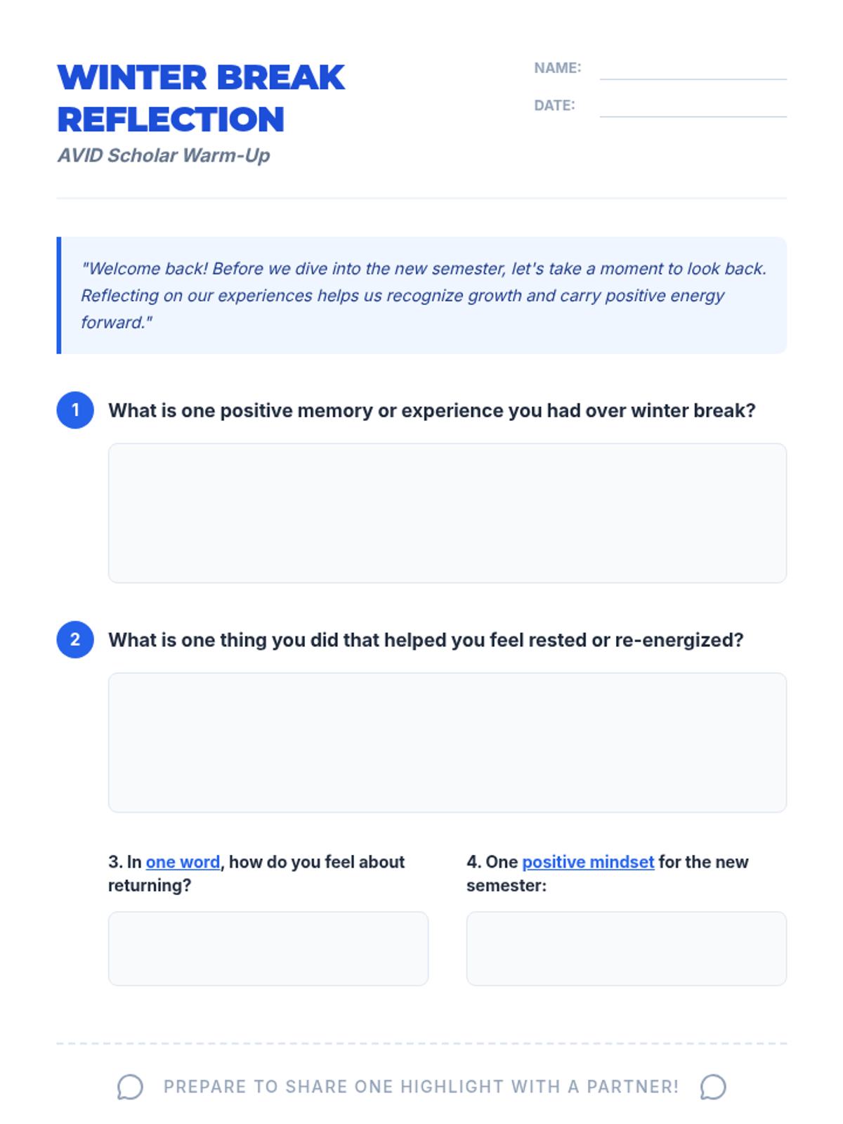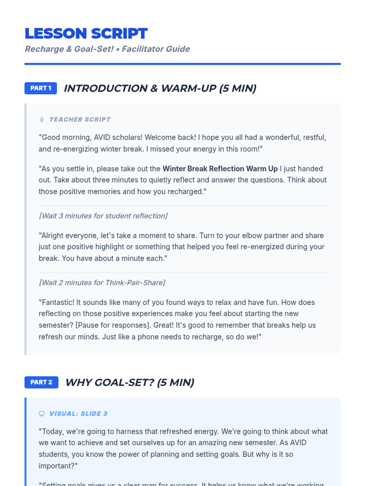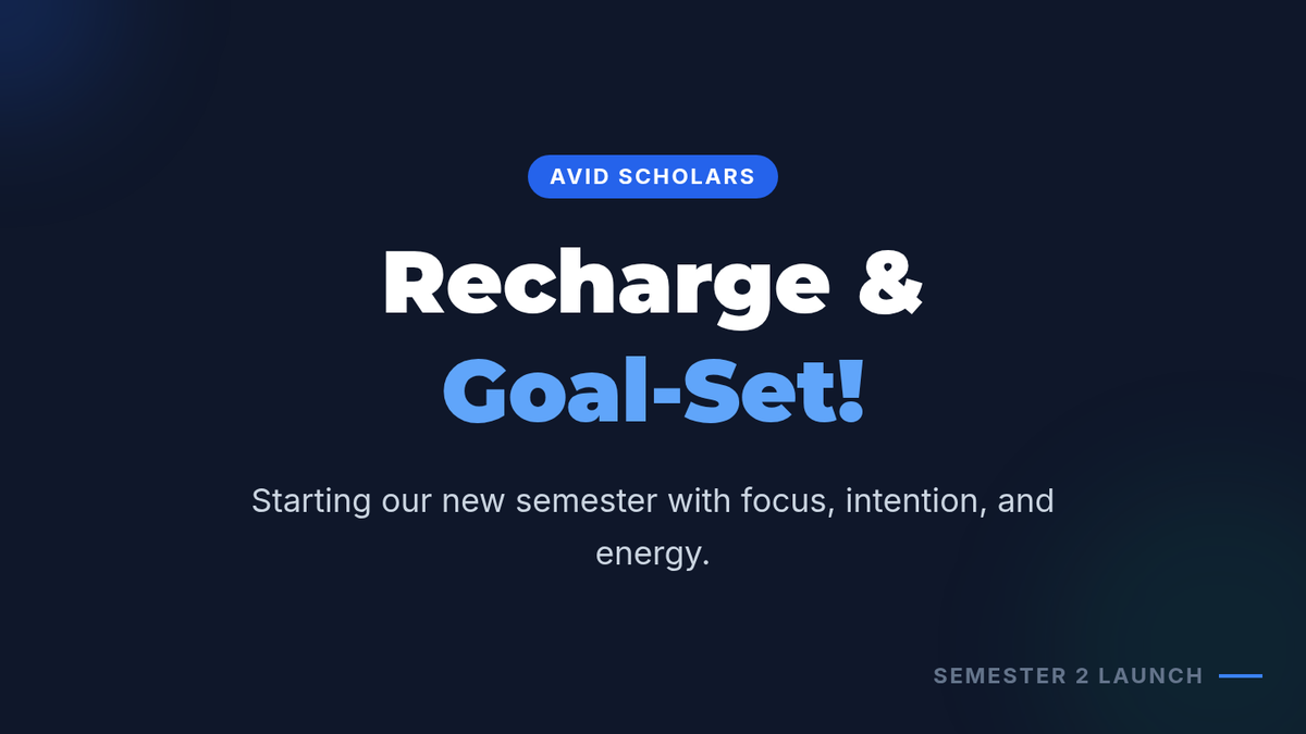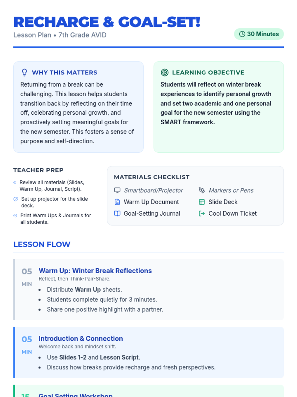 A 30-minute transition lesson for 7th-grade AVID students to reflect on their winter break and set SMART academic and personal goals for the new semester.