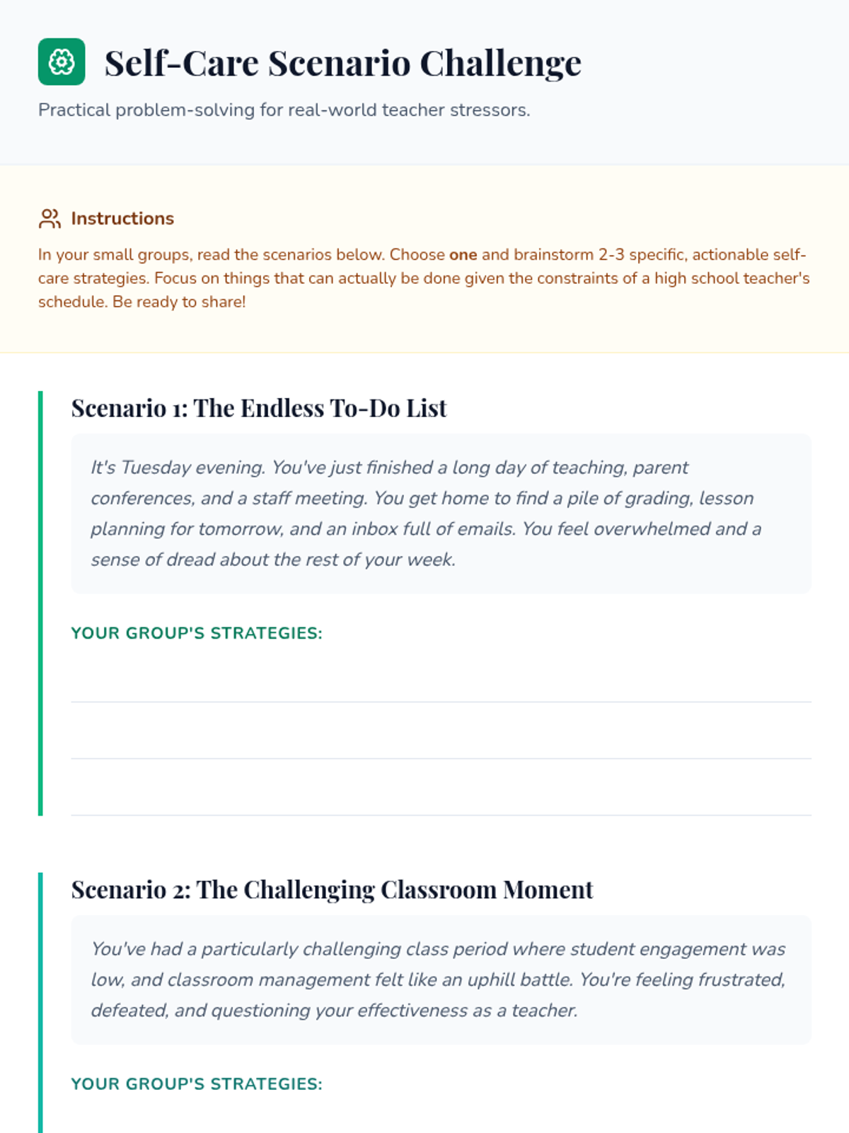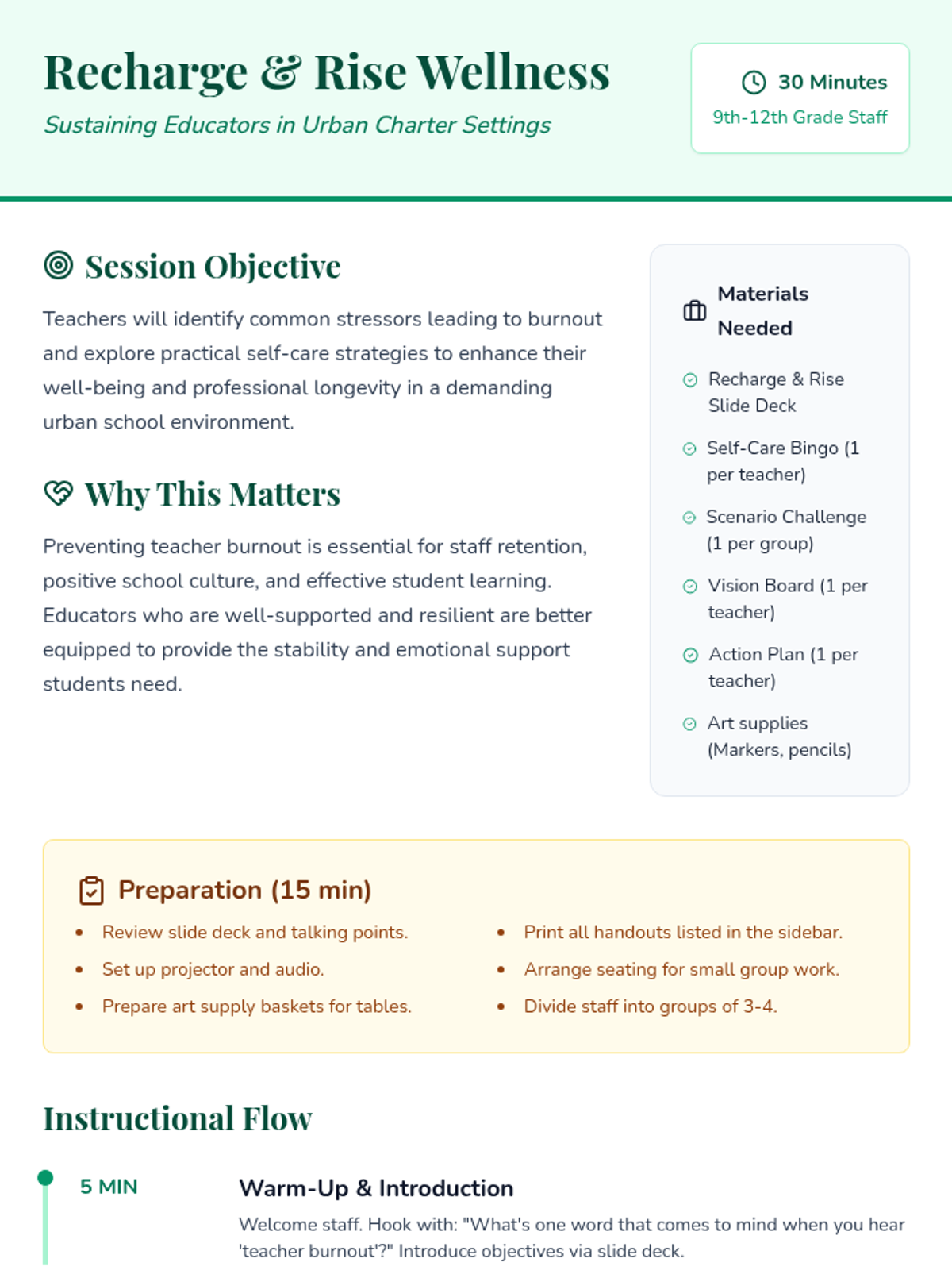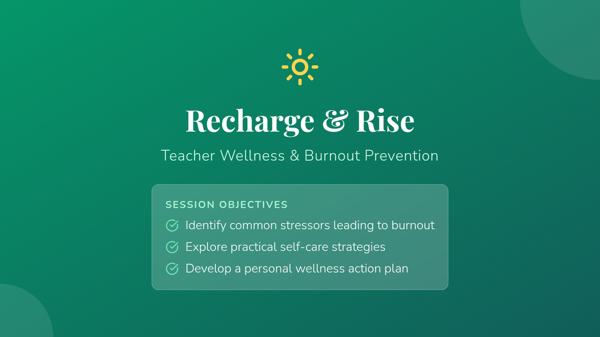 A 30-minute professional development session for high school teachers focused on identifying stressors and implementing practical self-care strategies to prevent burnout in urban school settings.