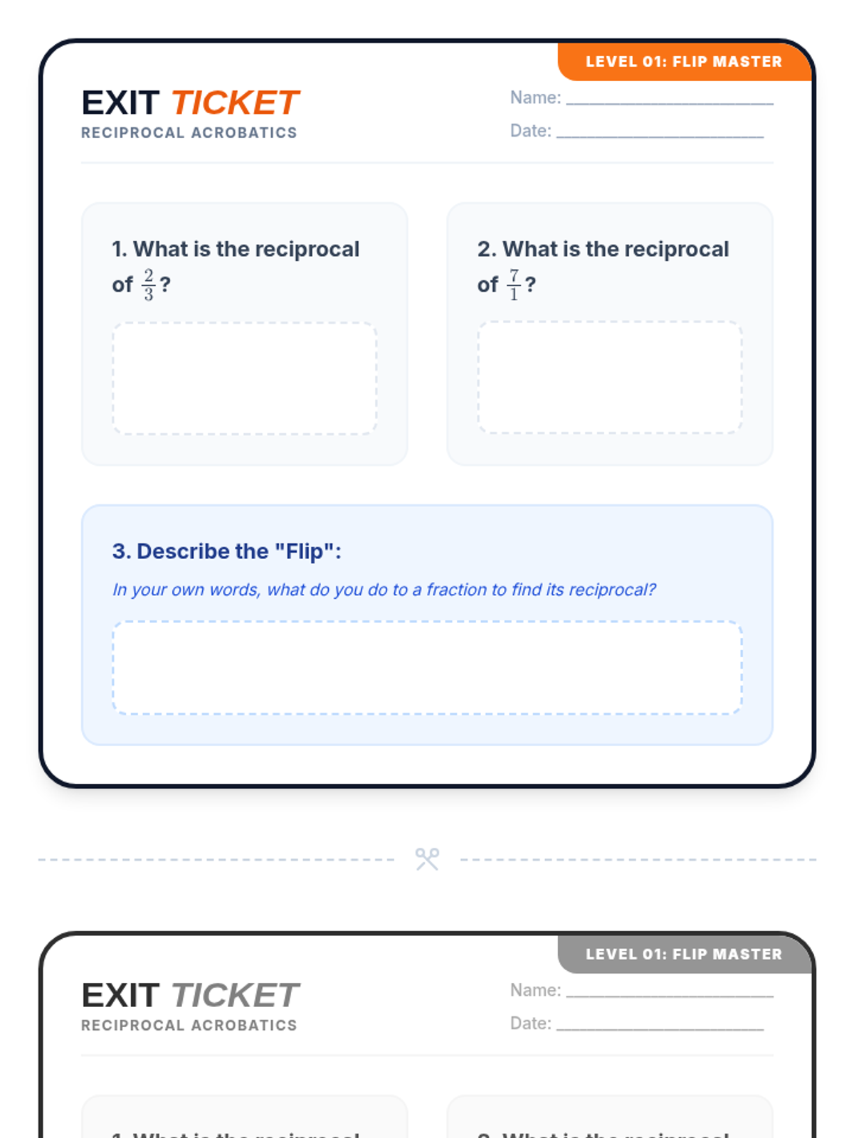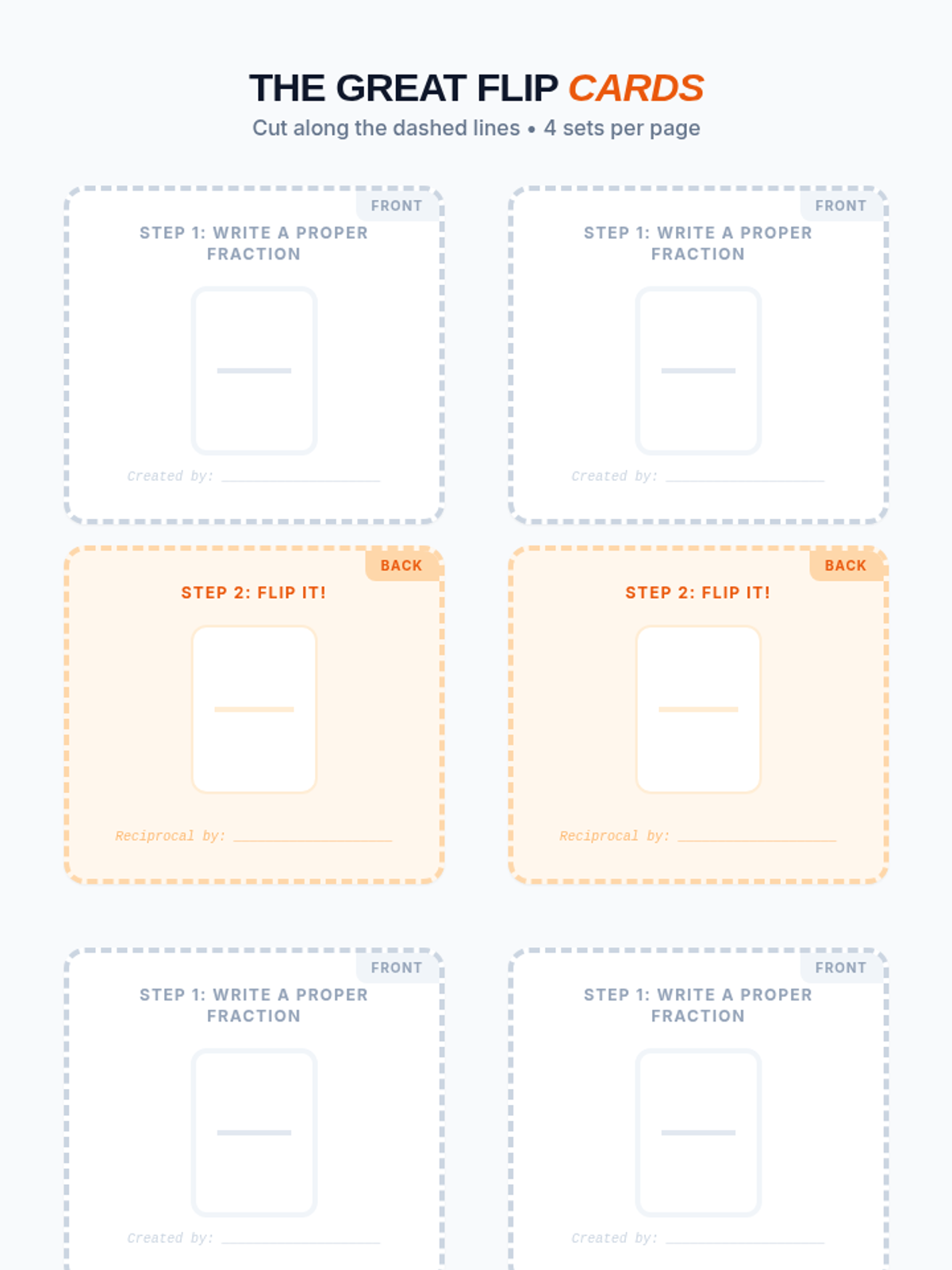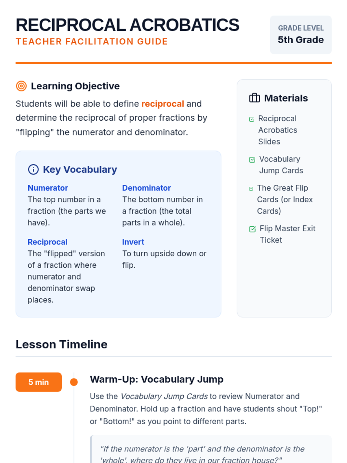 A high-energy math lesson where 5th graders learn to find reciprocals by 'flipping' fractions through visual demonstrations and a hands-on trading activity.