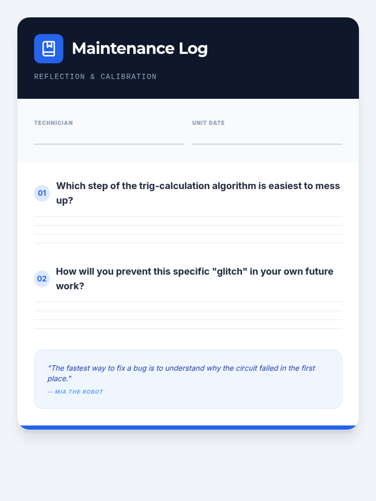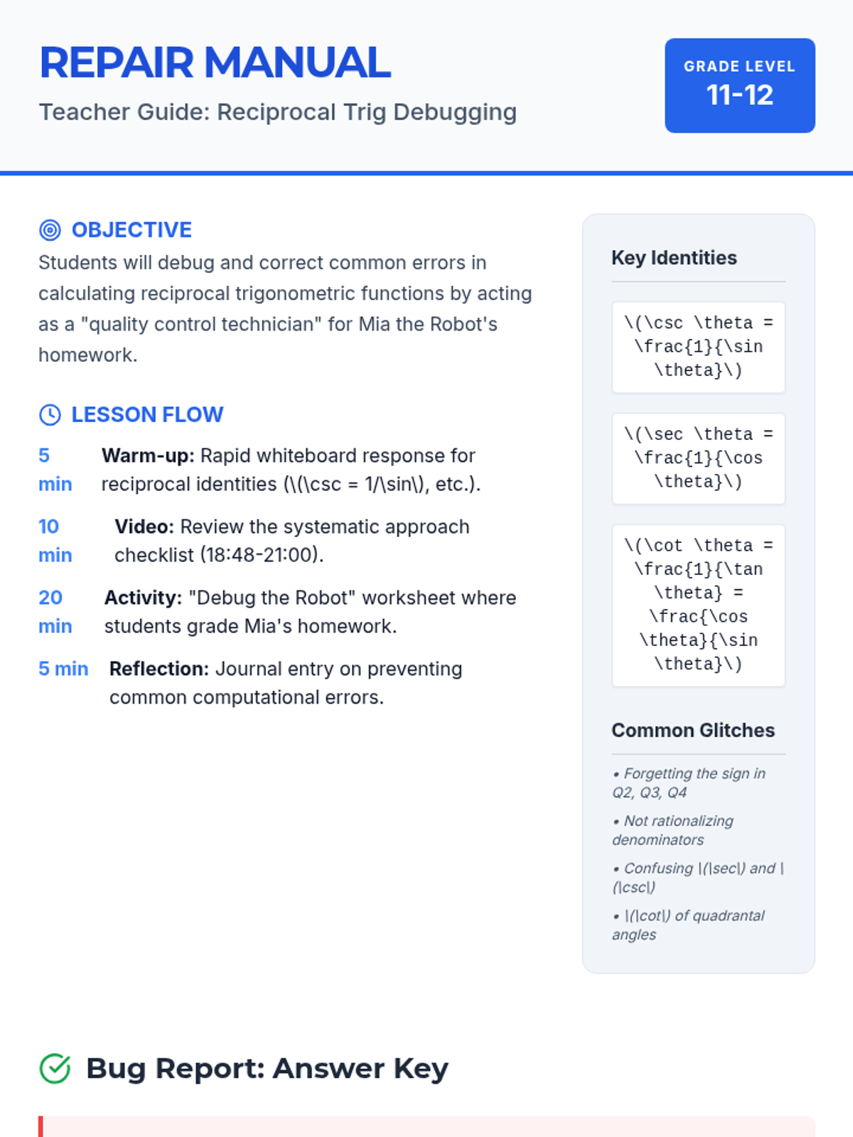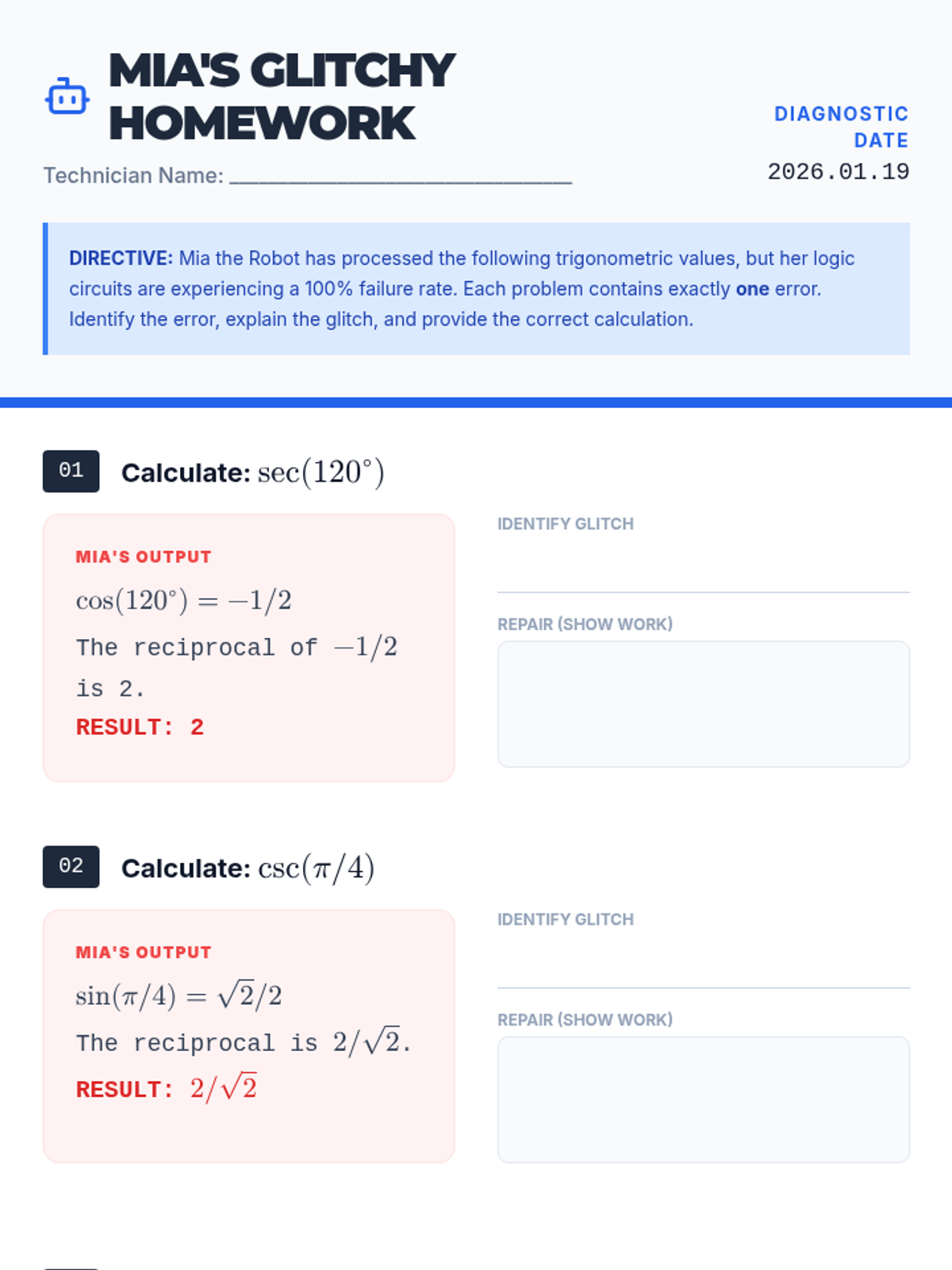 Students will identify and correct common errors in calculating reciprocal trigonometric functions (Cosecant, Secant, and Cotangent) by analyzing a set of 'glitchy' homework problems from Mia the Robot.