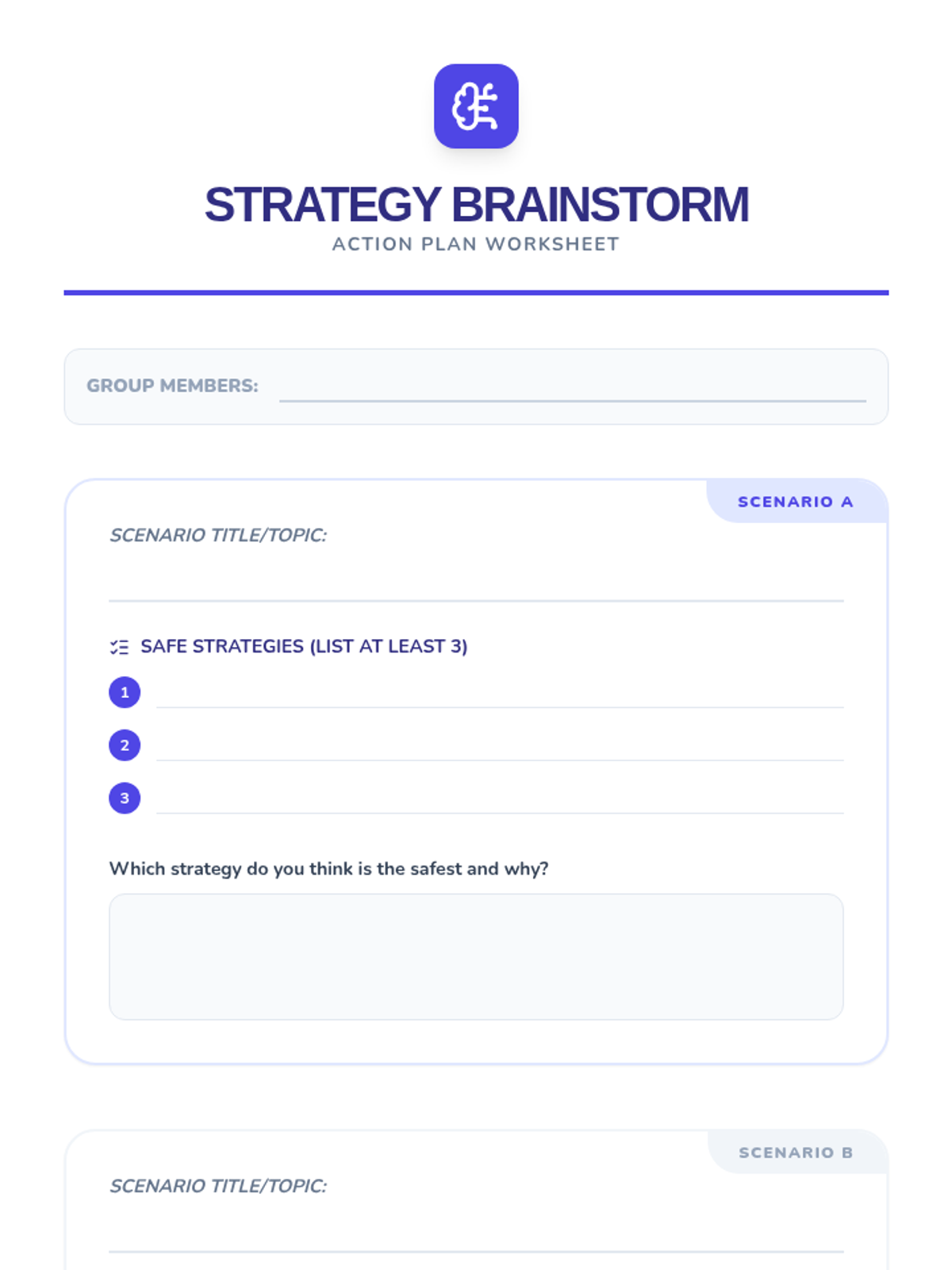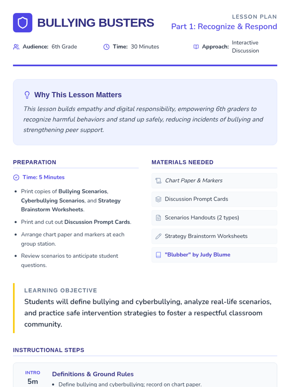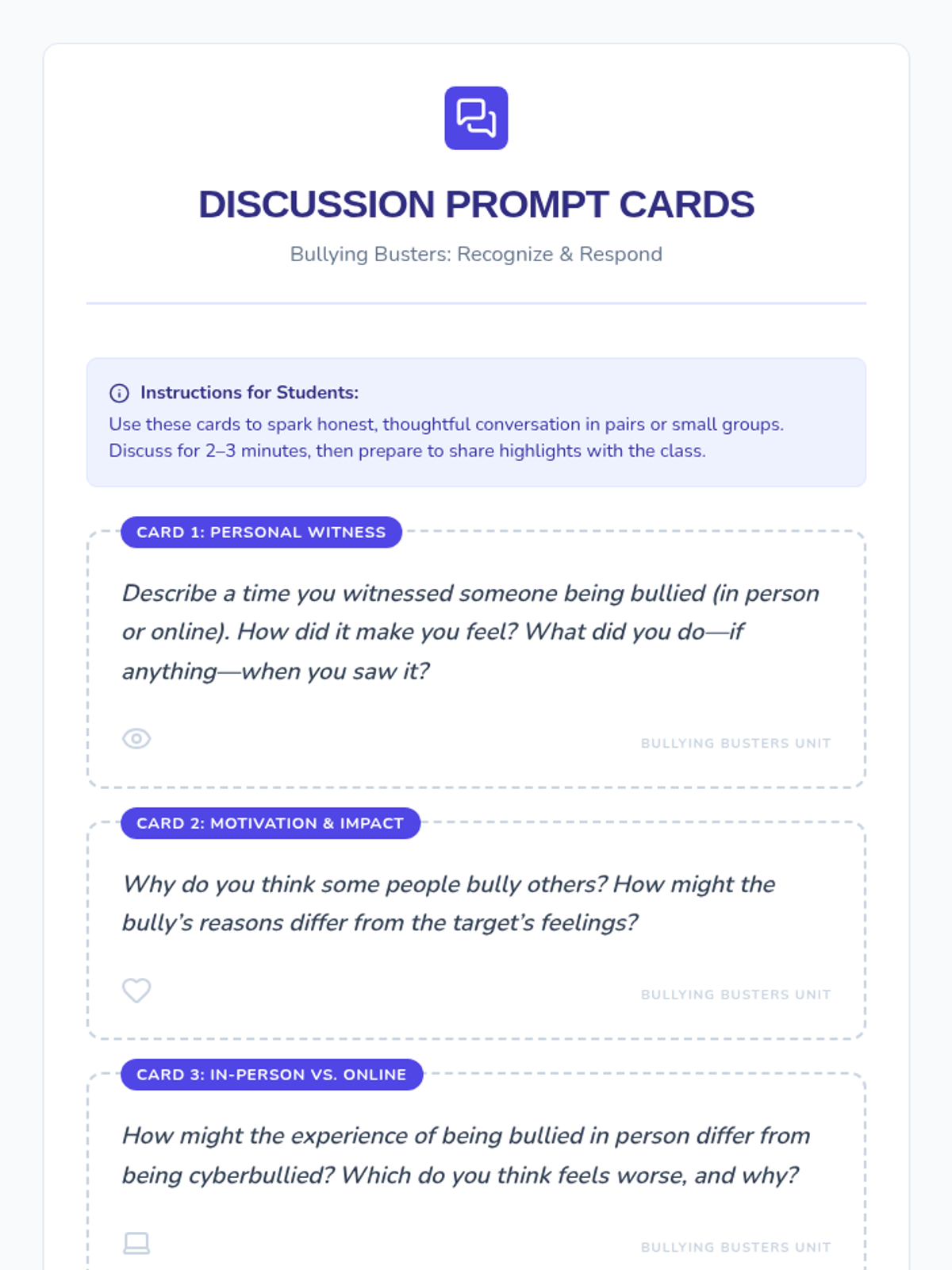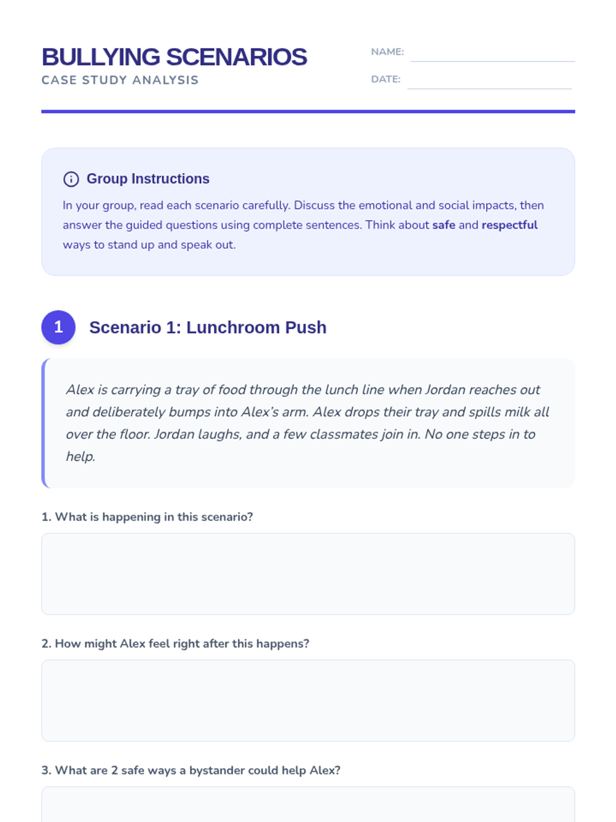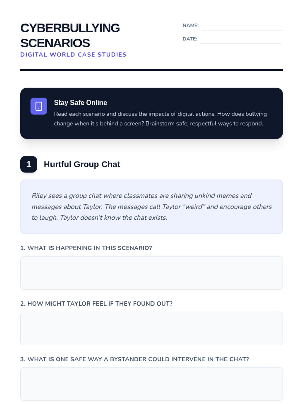 Students define bullying and cyberbullying, analyze real-life scenarios, and brainstorm safe intervention strategies.