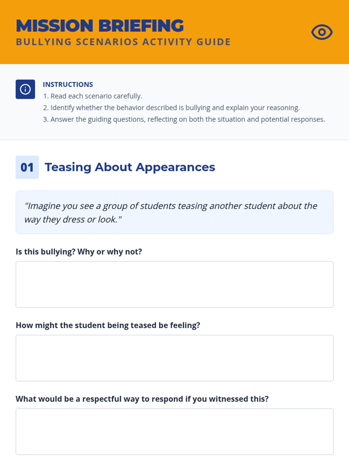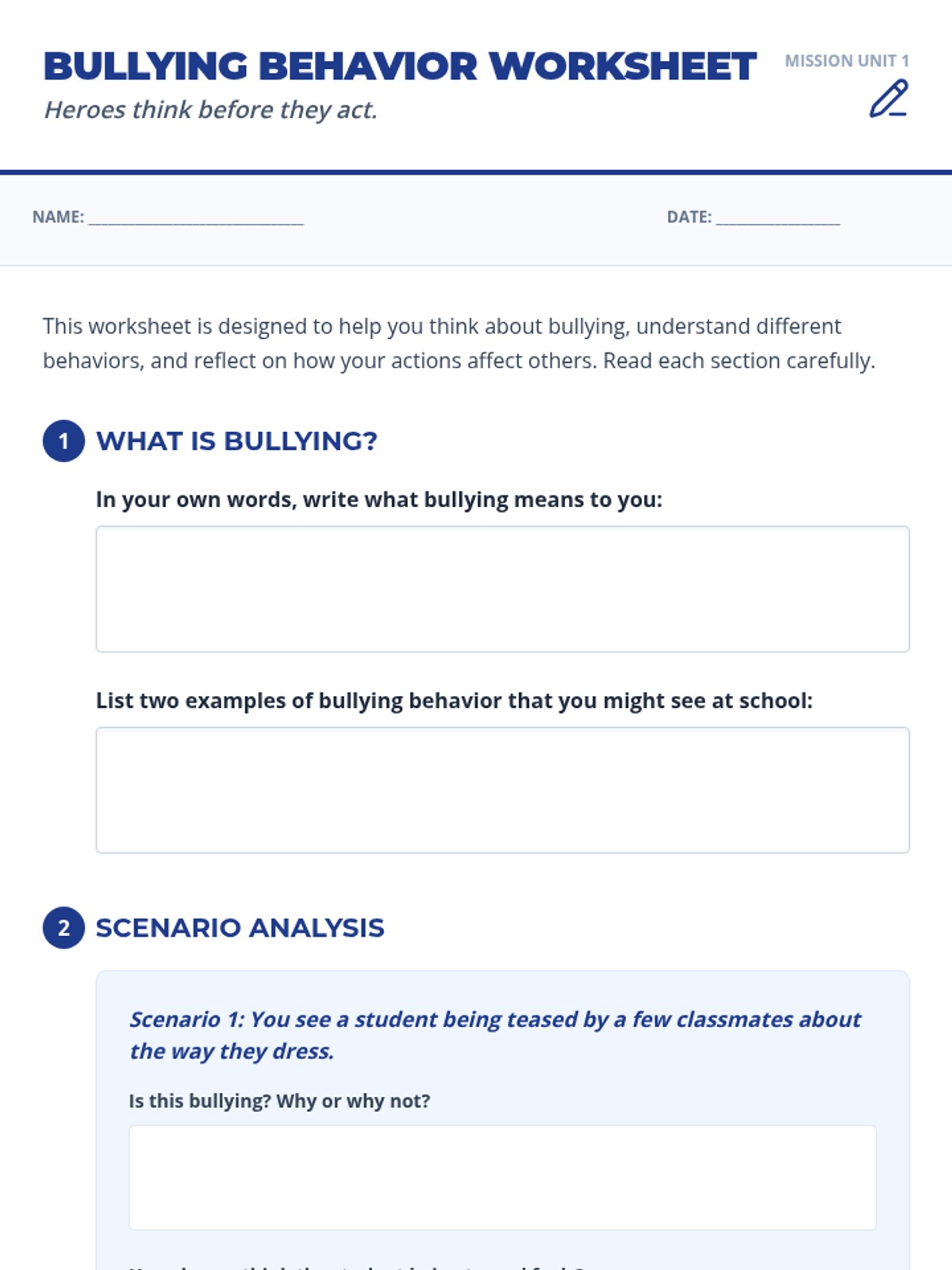 Focuses on identifying the three main types of bullying (physical, verbal, and social) and reflecting on personal behavior.