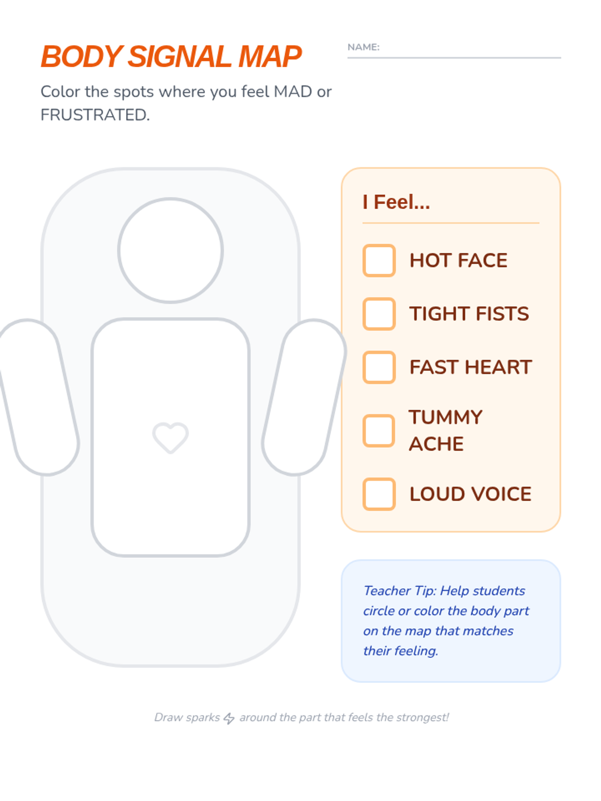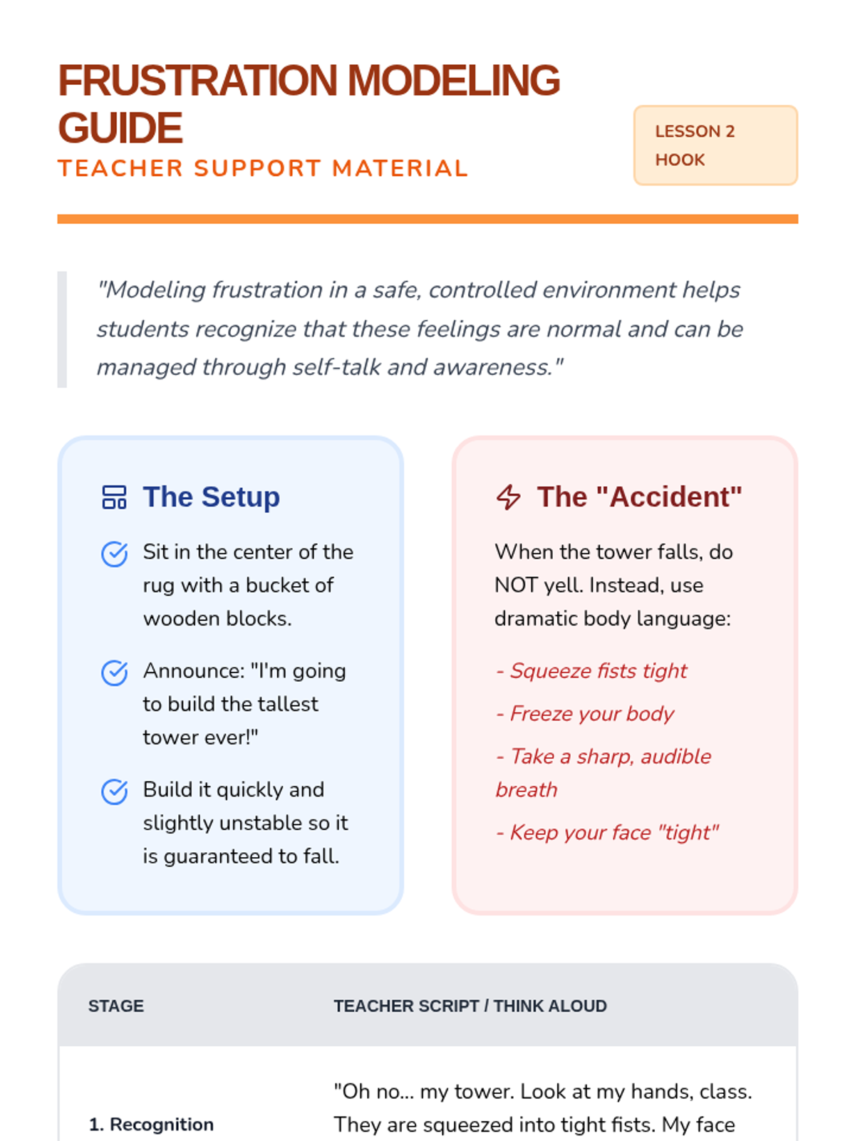 Students explore a narrative about a character facing a frustration trigger (a falling tower) and learn to identify physical signs of anger in their own bodies.