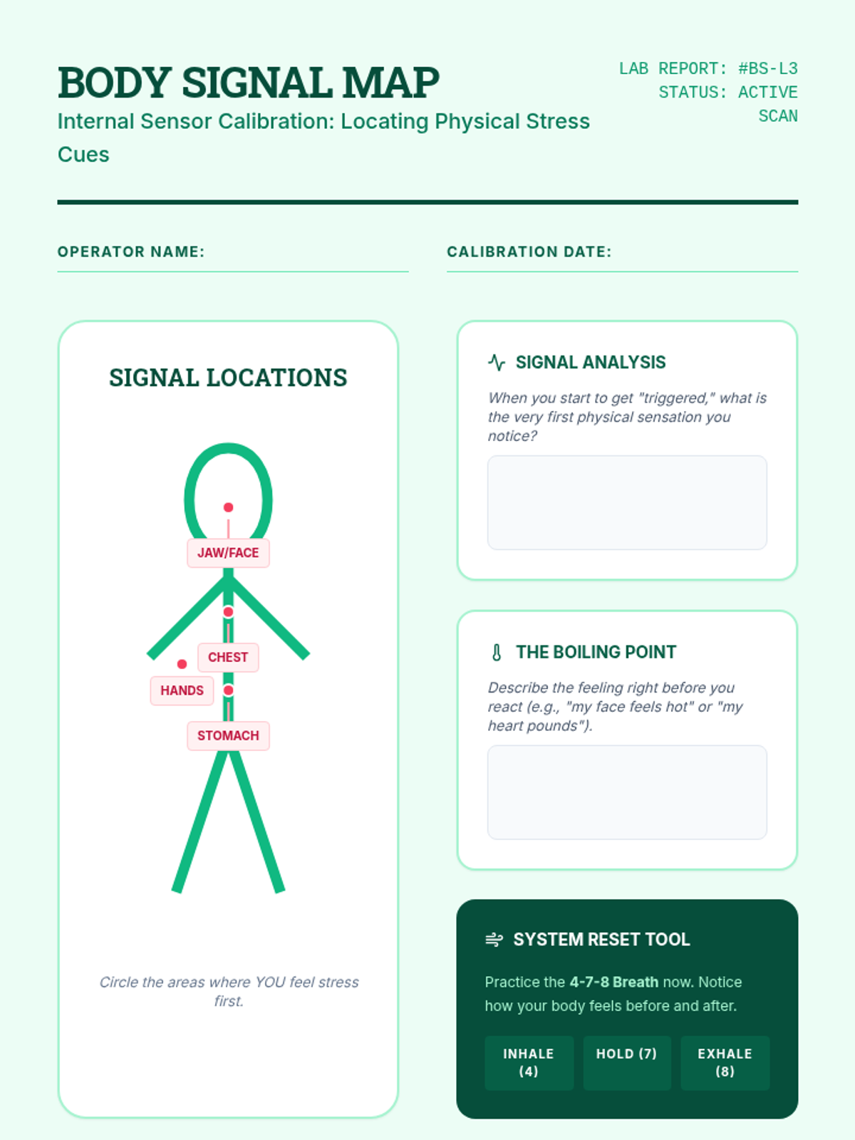 Students learn to scan their bodies for physical signs of escalation (clenched jaw, rapid heartbeat) that precede a behavioral outburst. They practice mindfulness techniques to increase body awareness.