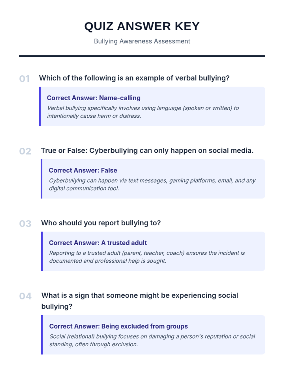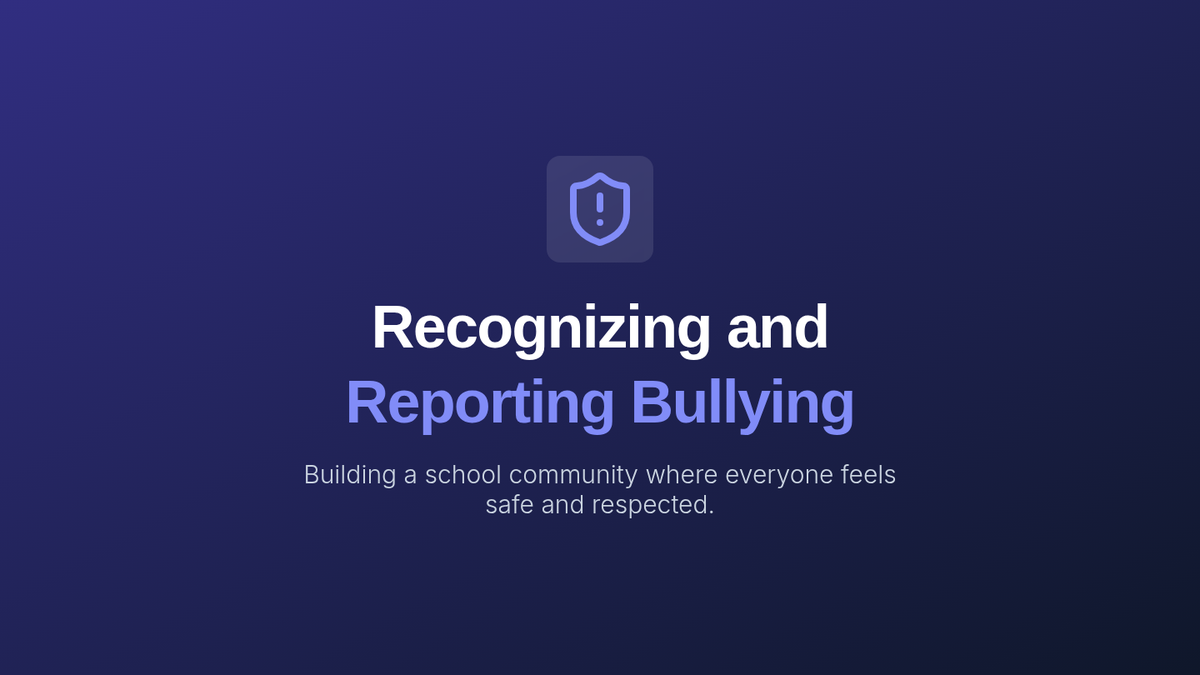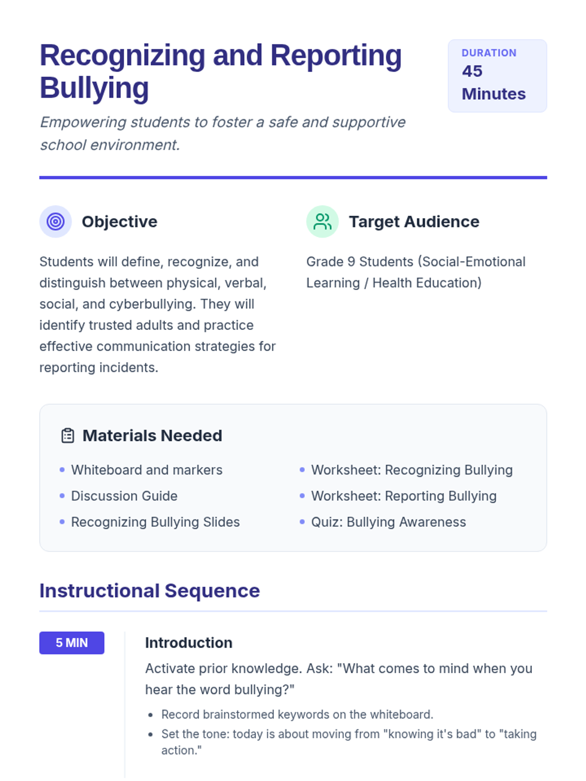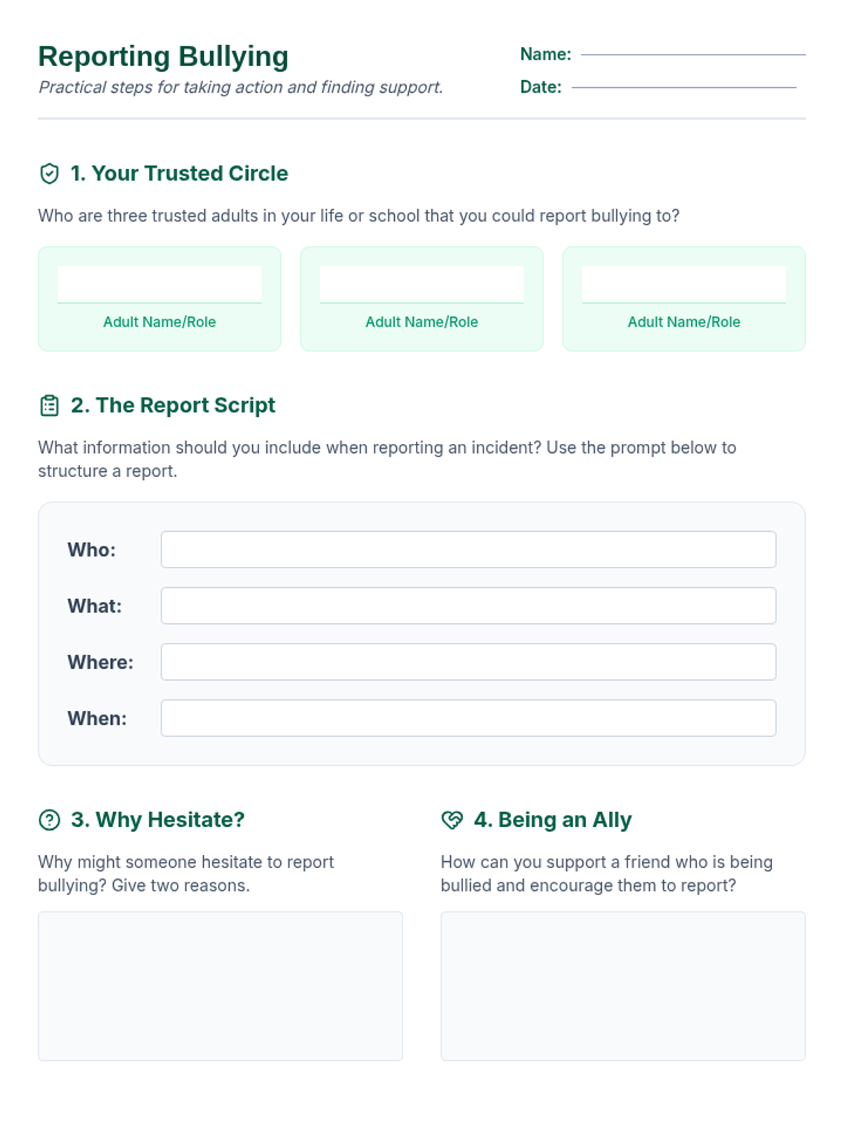 A comprehensive lesson for Grade 9 students on identifying the four main types of bullying (physical, verbal, social, and cyber) and learning the specific steps to report incidents to trusted adults.