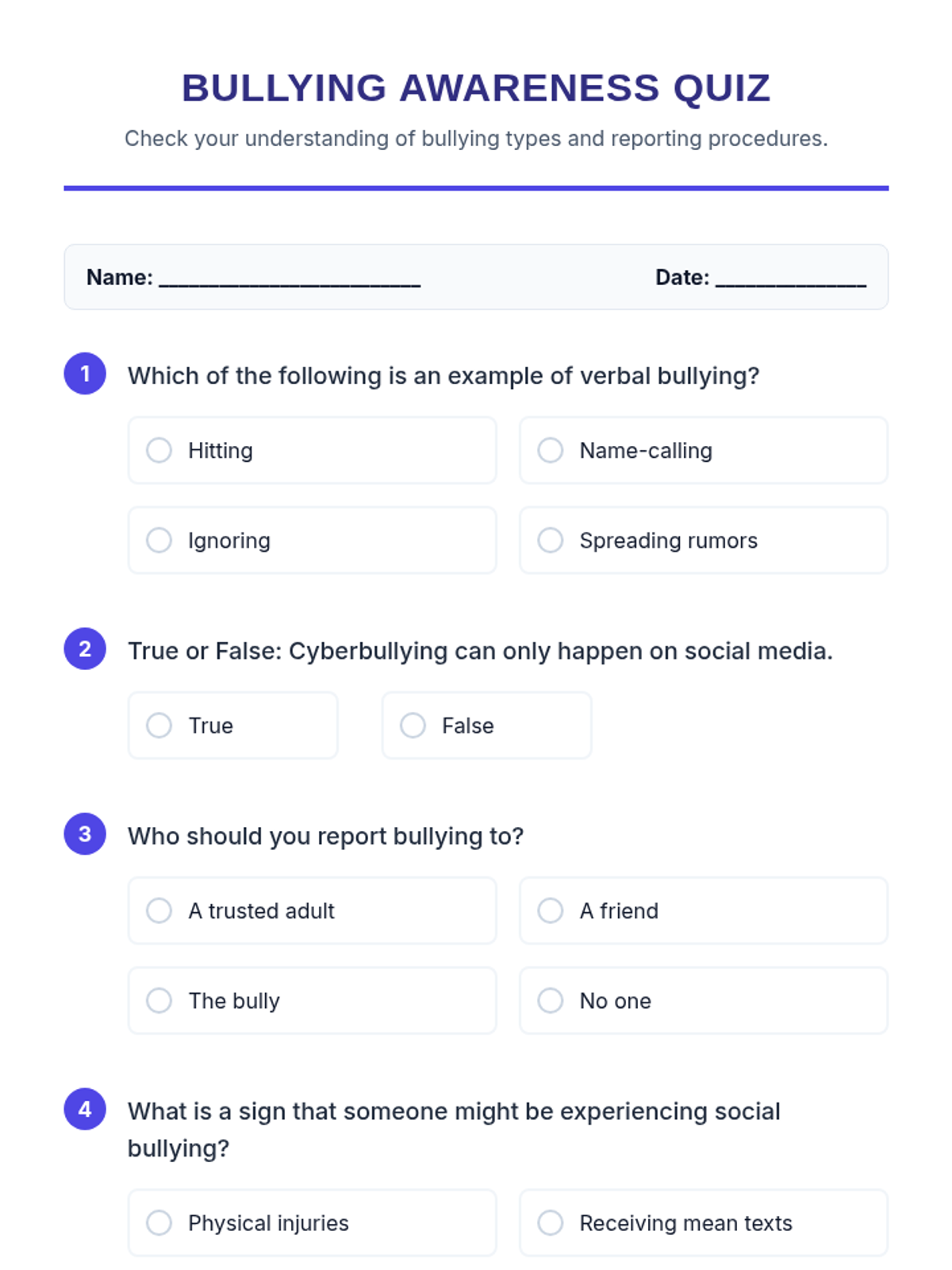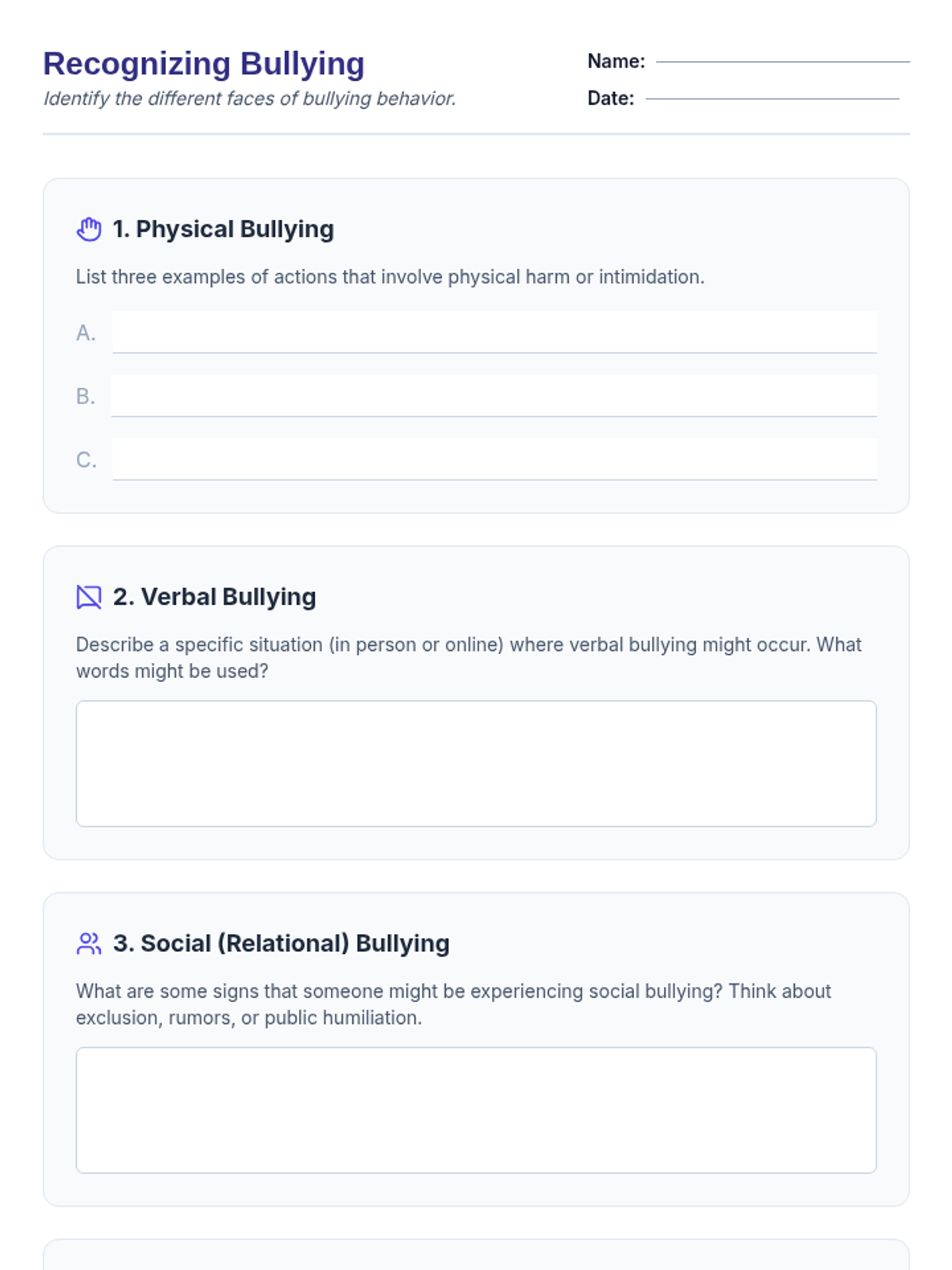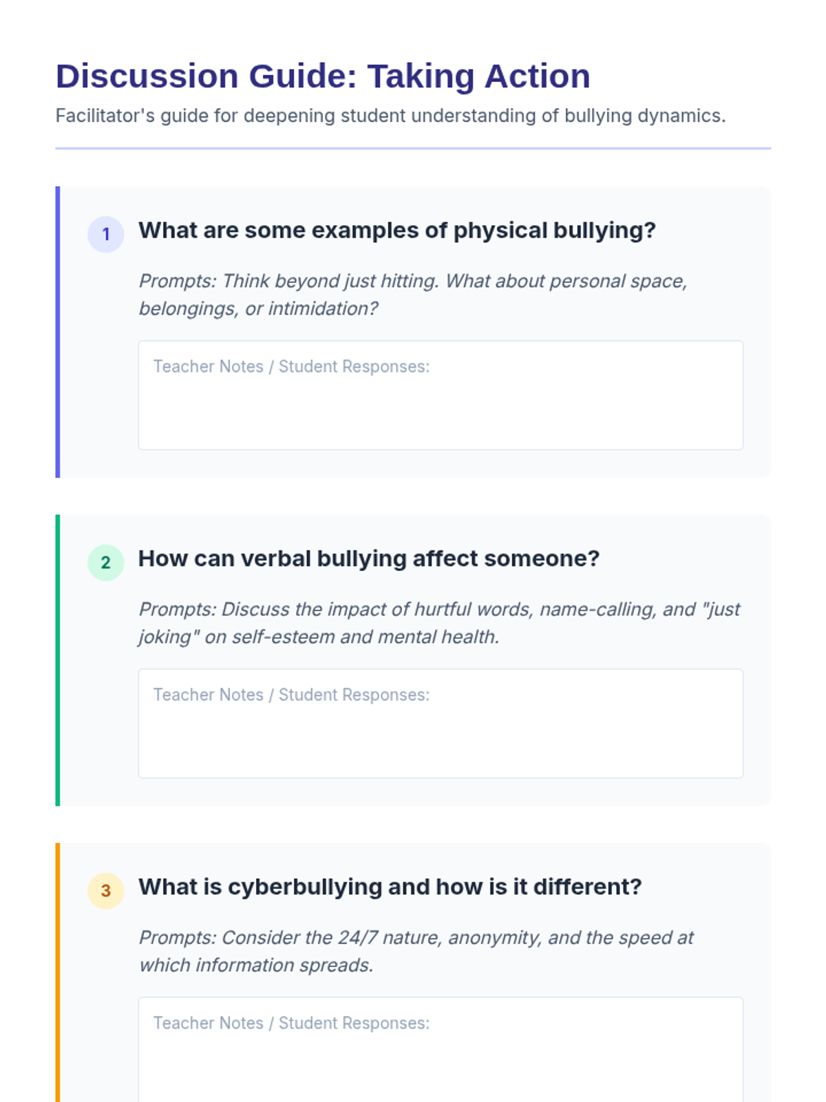 A comprehensive lesson for Grade 9 students on identifying the four main types of bullying (physical, verbal, social, and cyber) and learning the specific steps to report incidents to trusted adults.