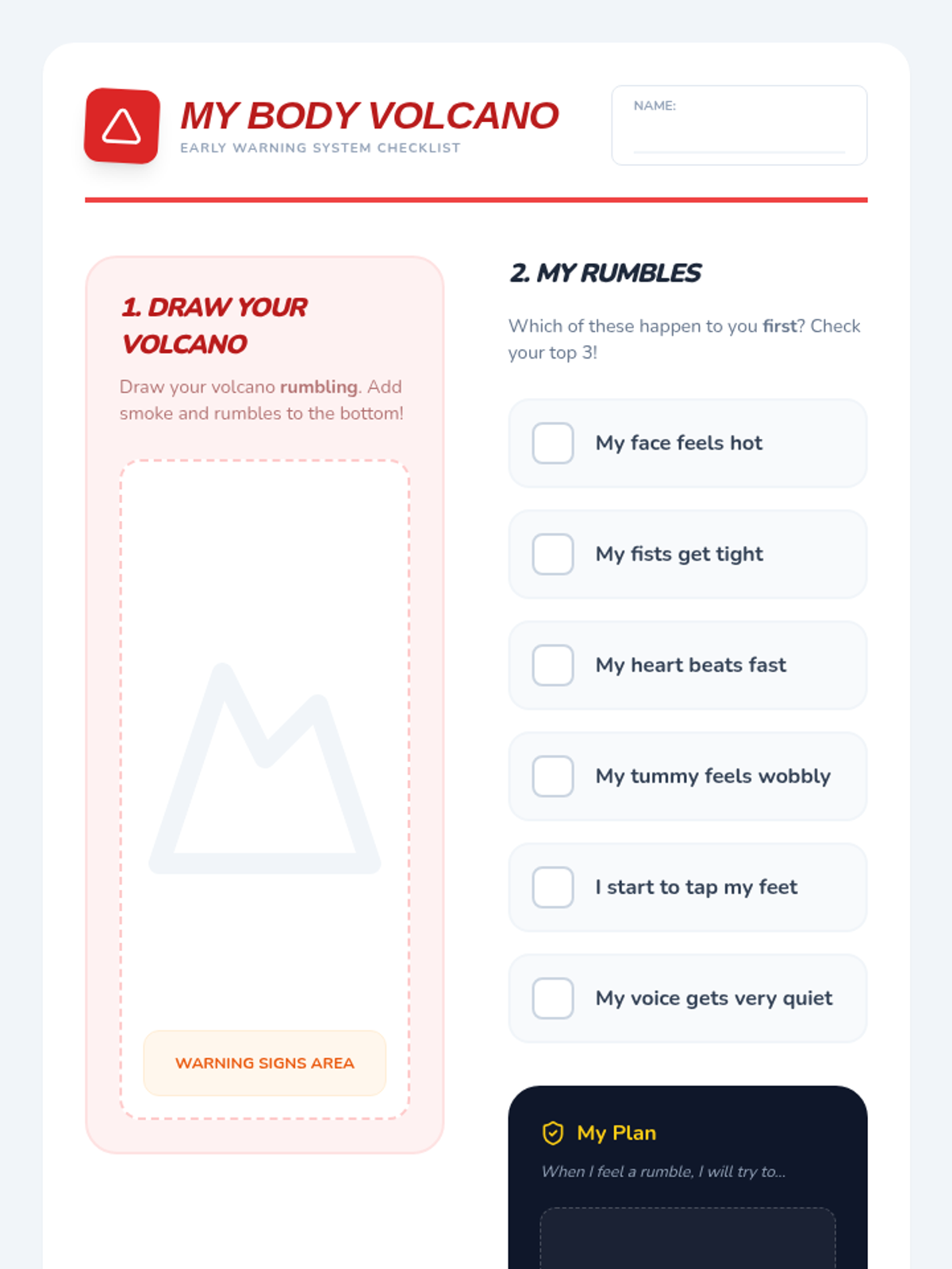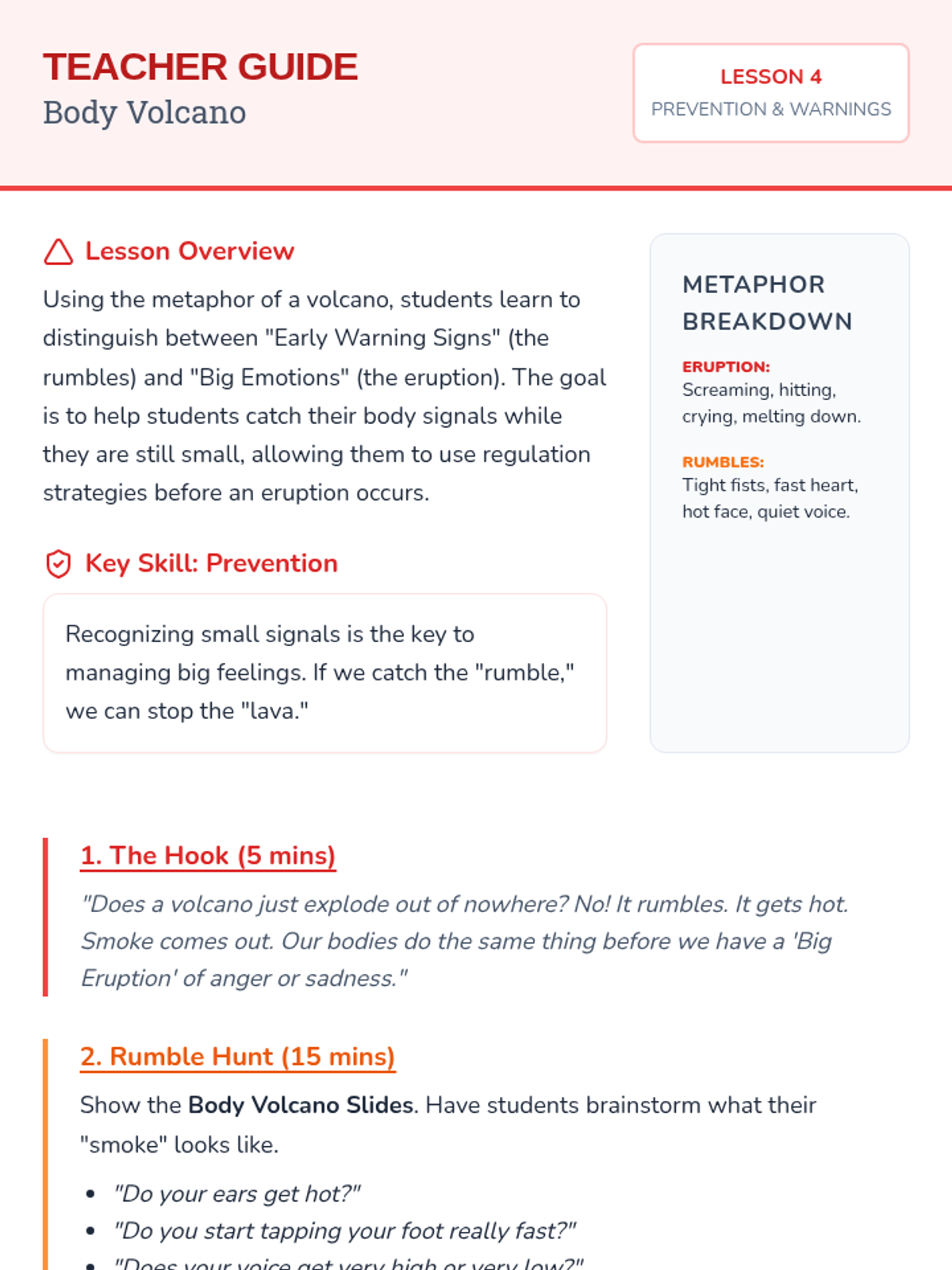 Focuses on 'early warning signs'—the subtle physical sensations that occur before big emotional outbursts—using the 'Body Volcano' metaphor.