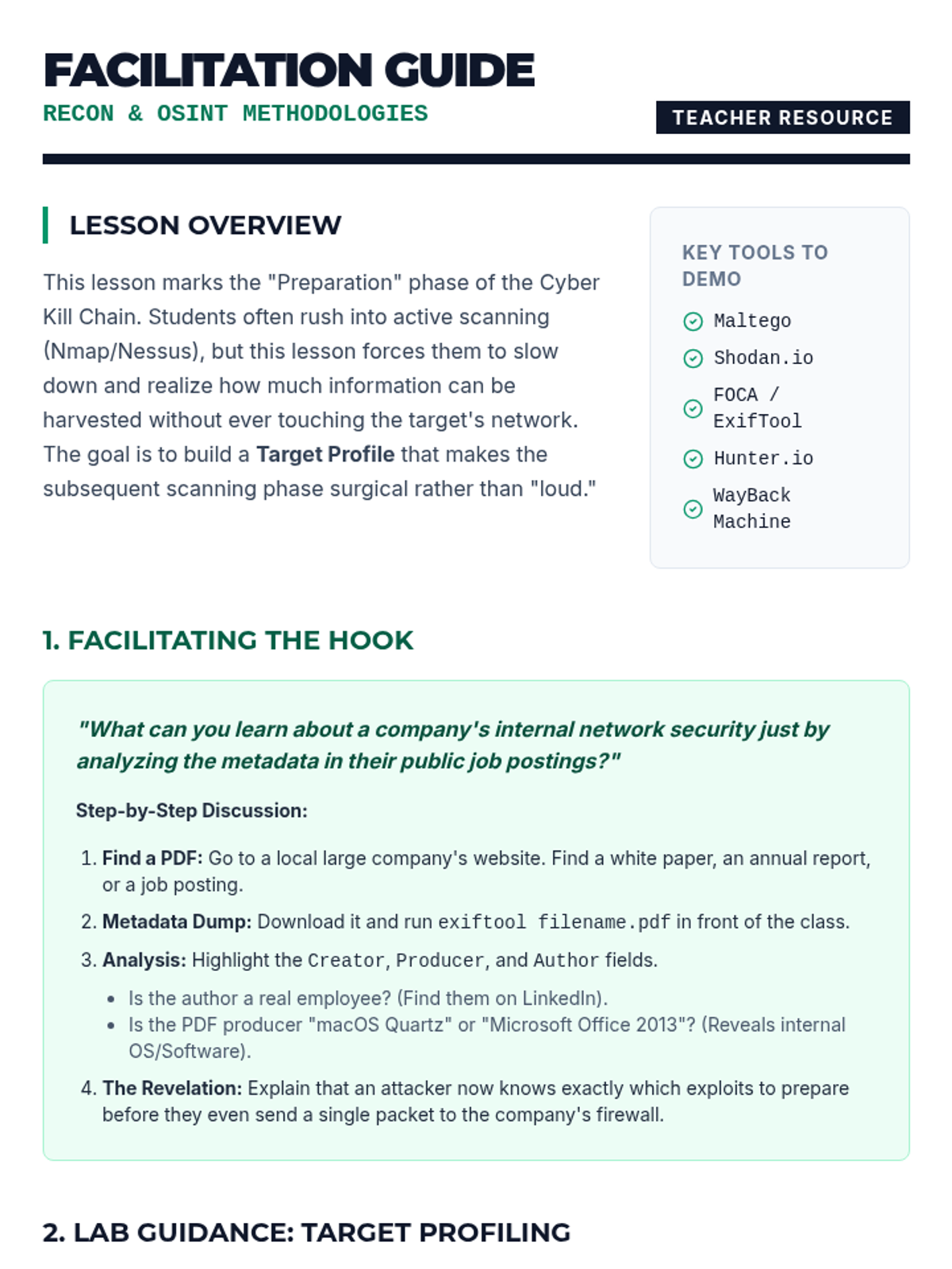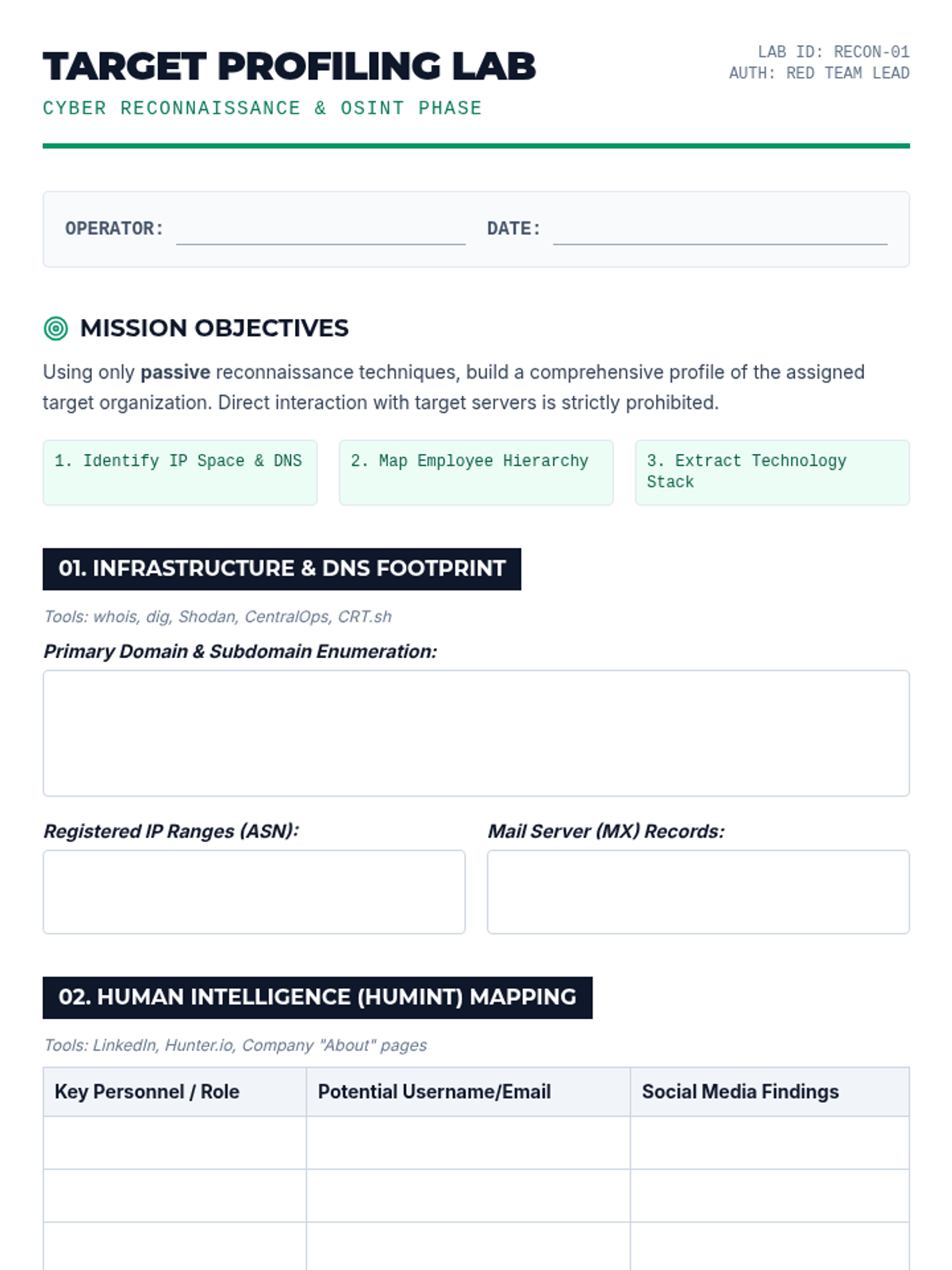 Students utilize Open Source Intelligence (OSINT) frameworks to gather actionable intelligence on a target without direct engagement. The lesson covers passive DNS analysis, social media scraping, and metadata extraction to build a comprehensive target profile.