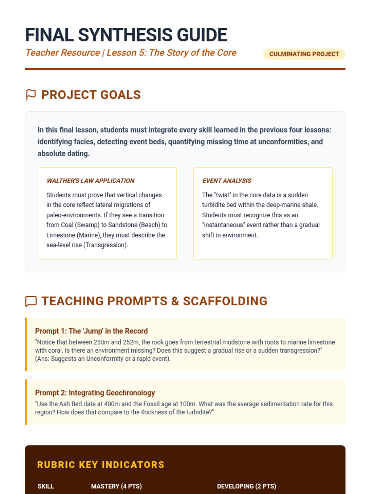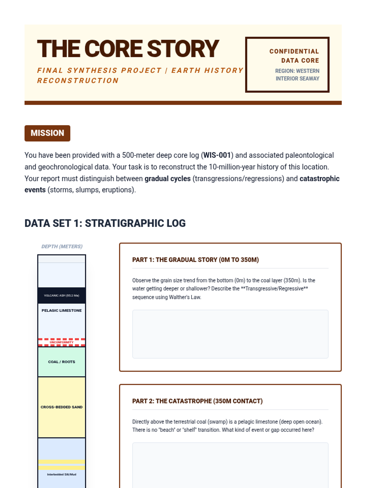Students synthesize sedimentological, paleontological, and stratigraphic data to construct a narrative history of a region, differentiating between gradual environmental shifts and rapid tectonic or catastrophic events.