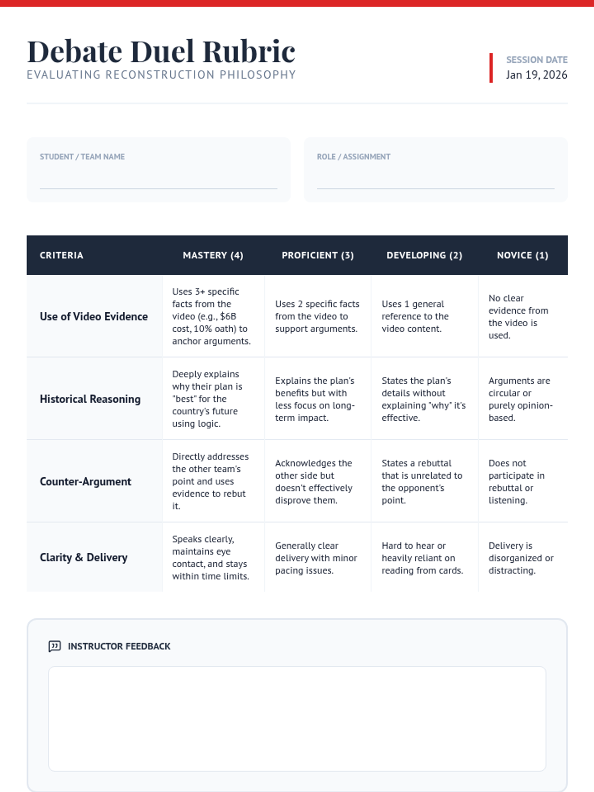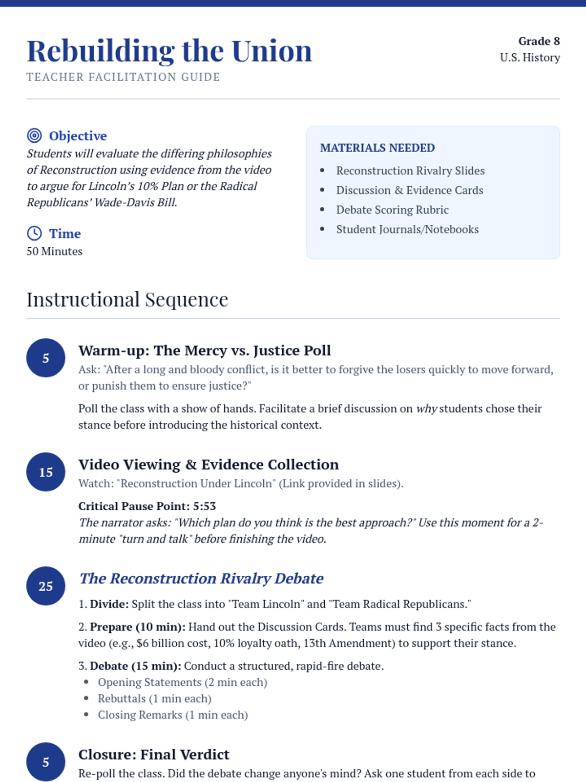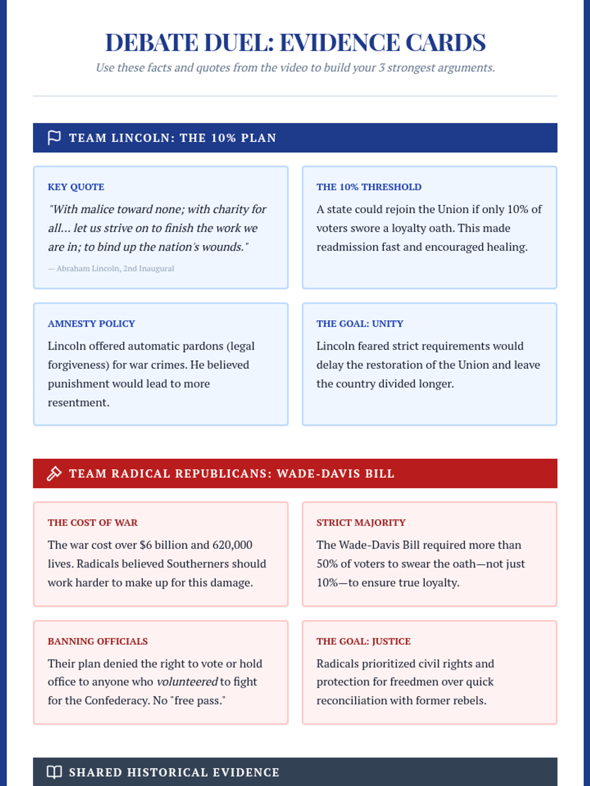 An 8th-grade history lesson comparing Lincoln's lenient Ten Percent Plan with the Radical Republicans' strict Wade-Davis Bill, centered around a structured debate. Students use video evidence to evaluate which Reconstruction philosophy best served the nation's future after the Civil War.