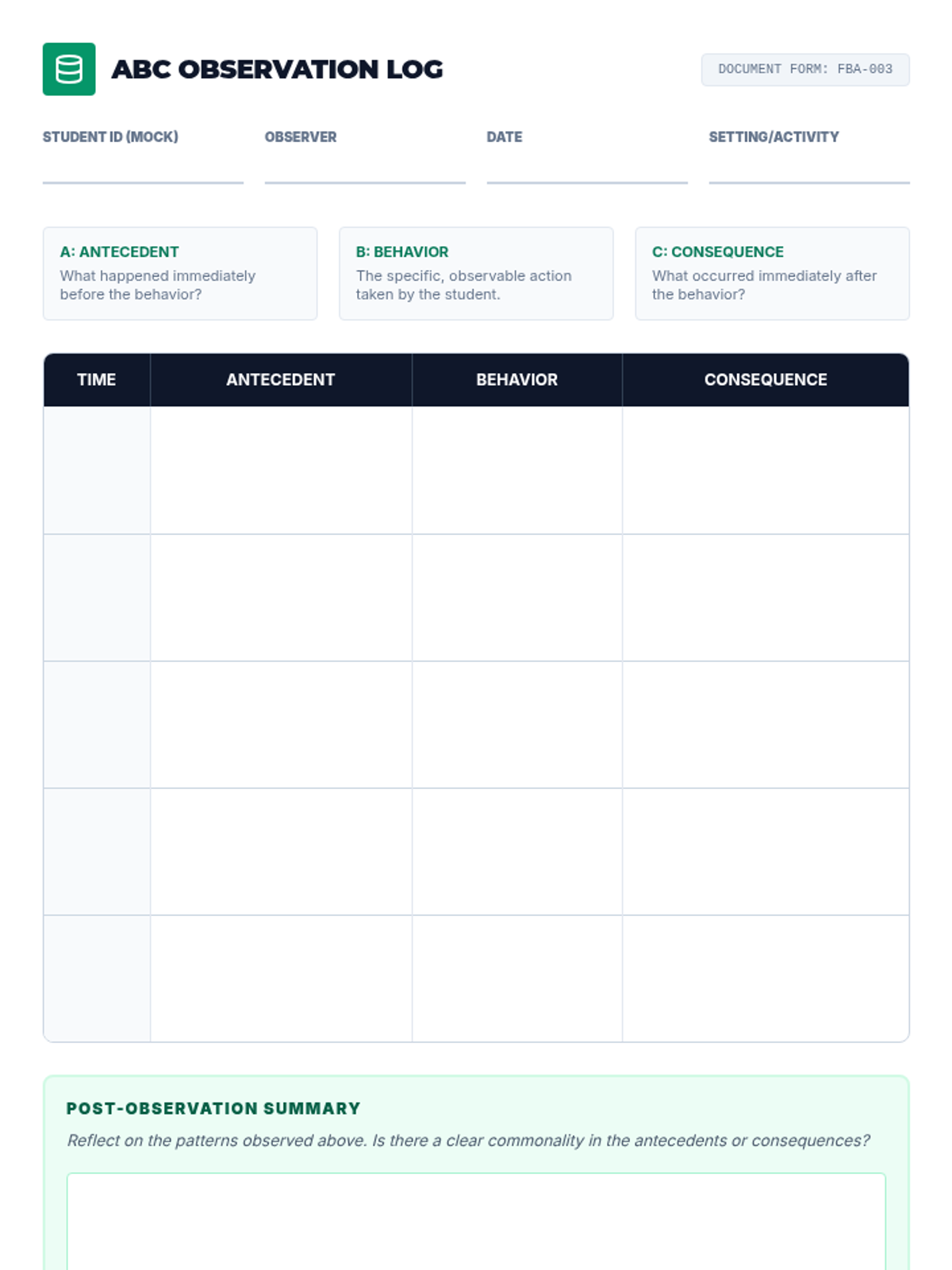 Students master the narrative ABC recording technique, learning to document the Antecedent, Behavior, and Consequence in real-time to uncover the 'why' behind actions.