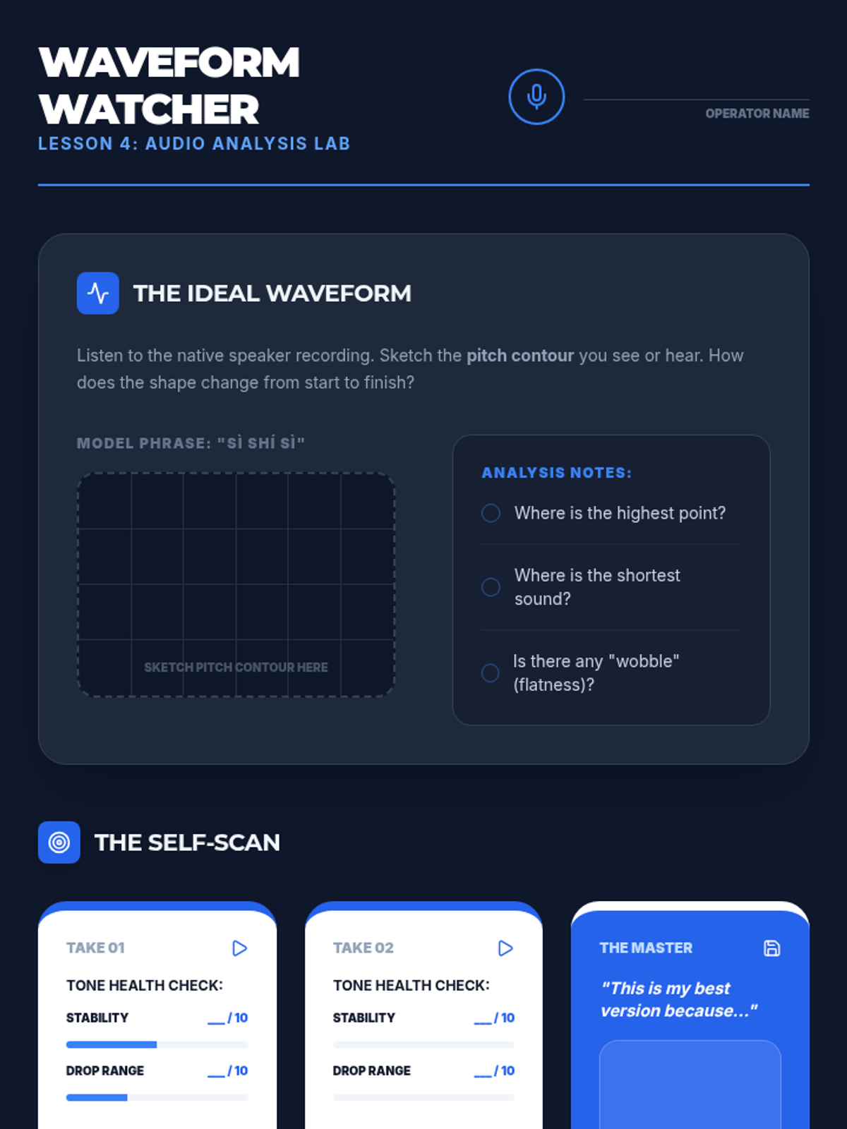 Students record their tonal performances and use audio analysis to identify areas for improvement, comparing their contours to native models.