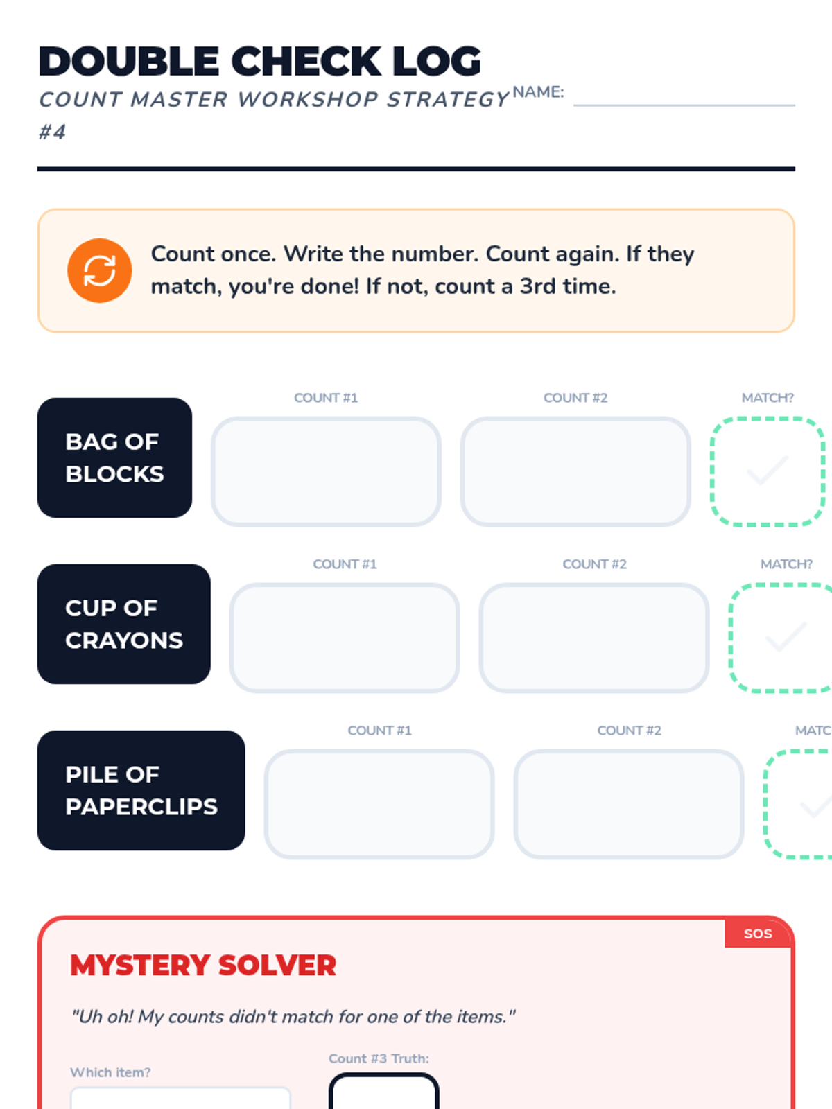 Students establish a verification habit by counting sets twice and comparing the results to ensure accuracy.