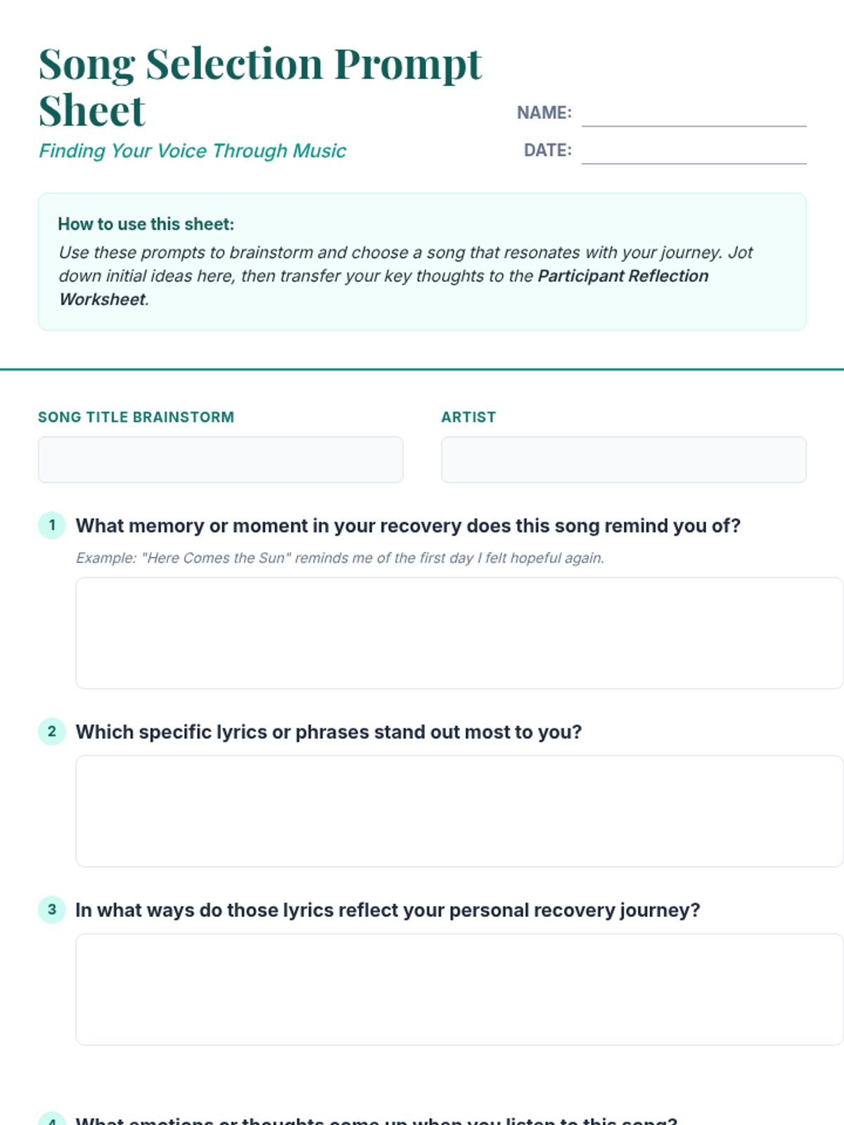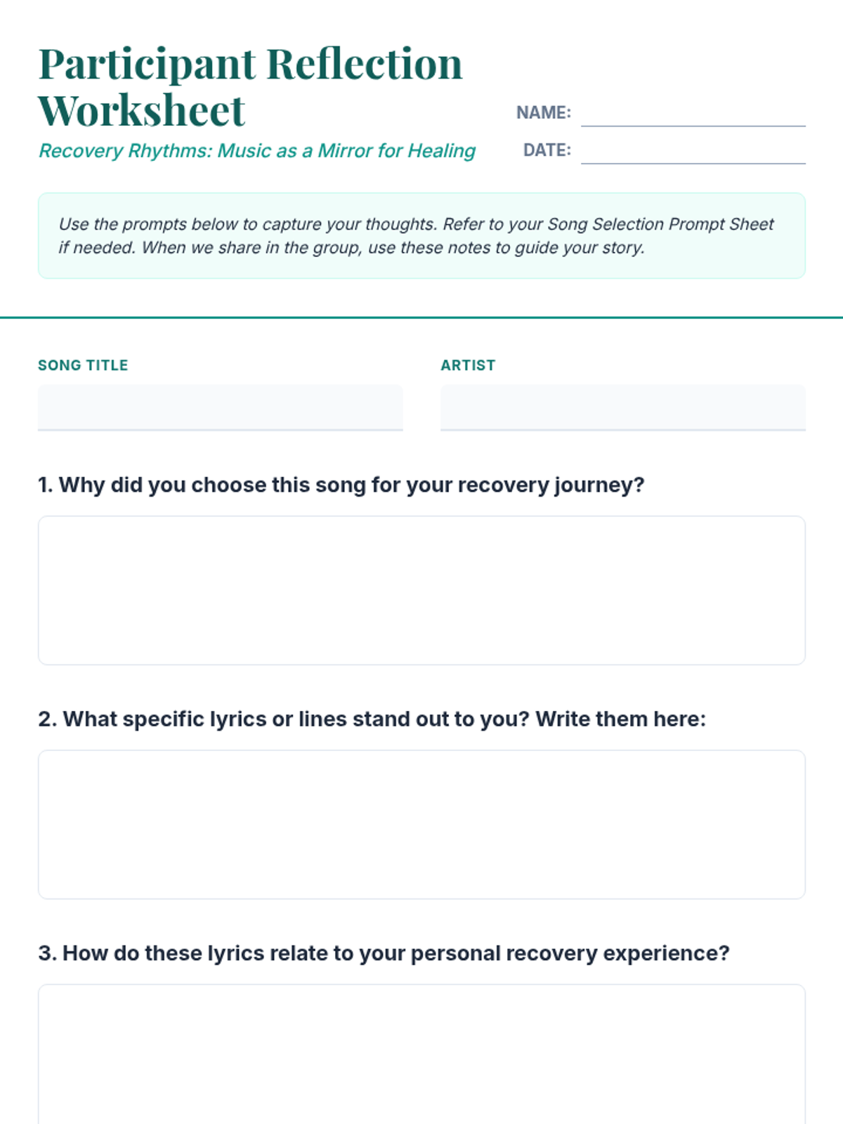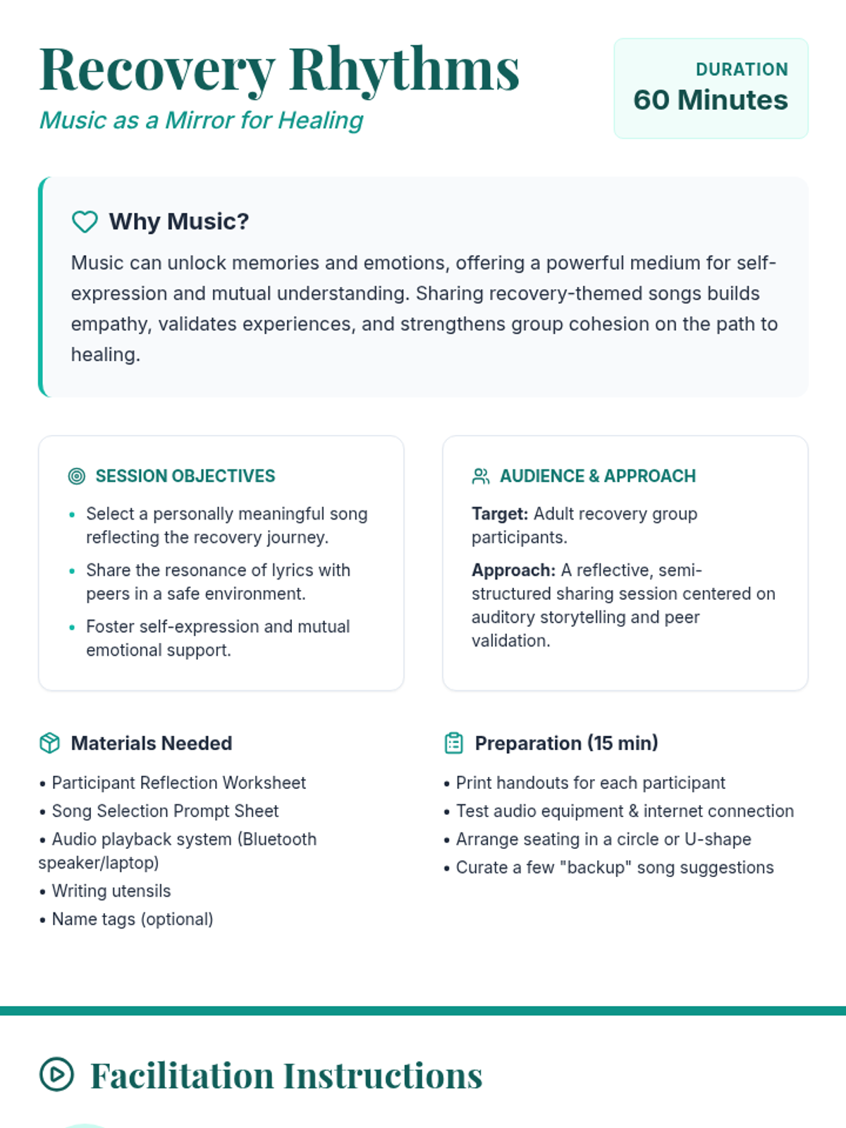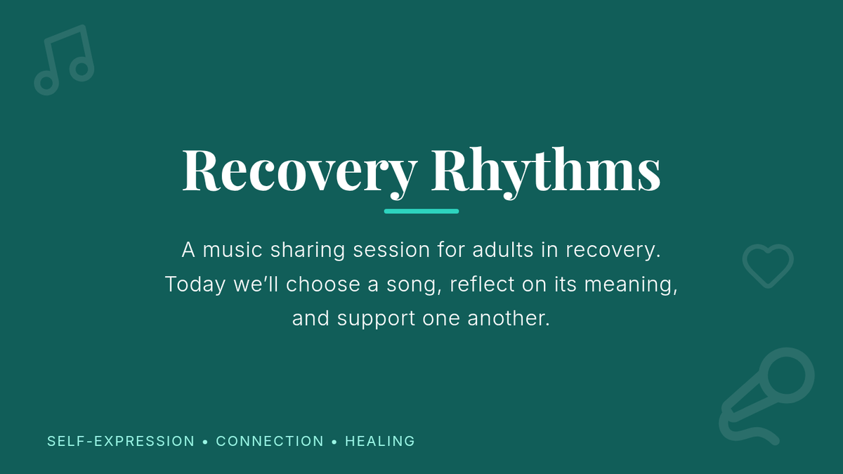 A one-hour group session for adults in recovery that uses music as a bridge for self-expression and peer connection. Participants select a meaningful song, reflect on its impact, and share their story with the group.