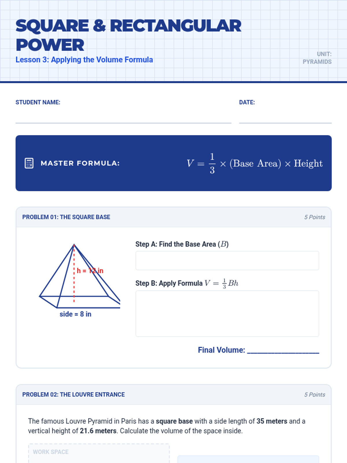 Focuses on calculating the volume of pyramids with rectangular and square bases, including solving for missing dimensions.