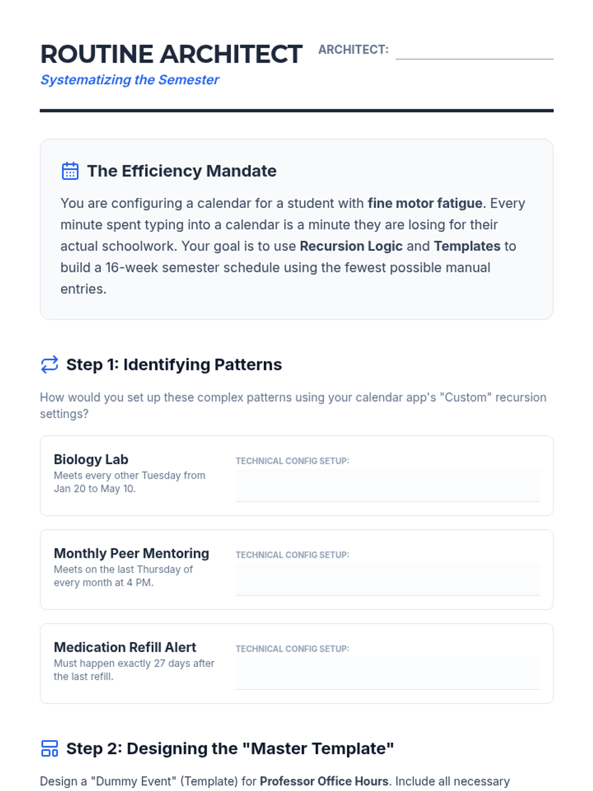 Covers the mastery of recurring event patterns and the creation of templates to streamline input and build predictable routines.