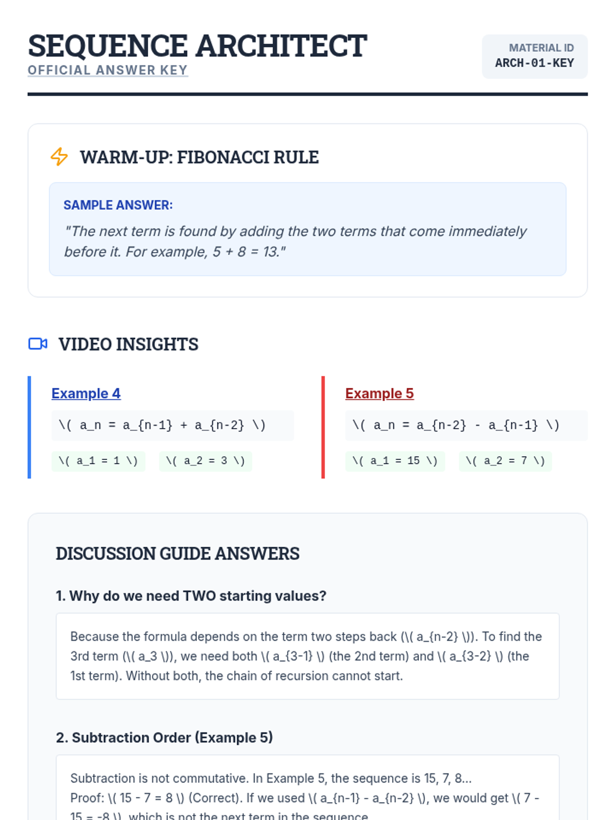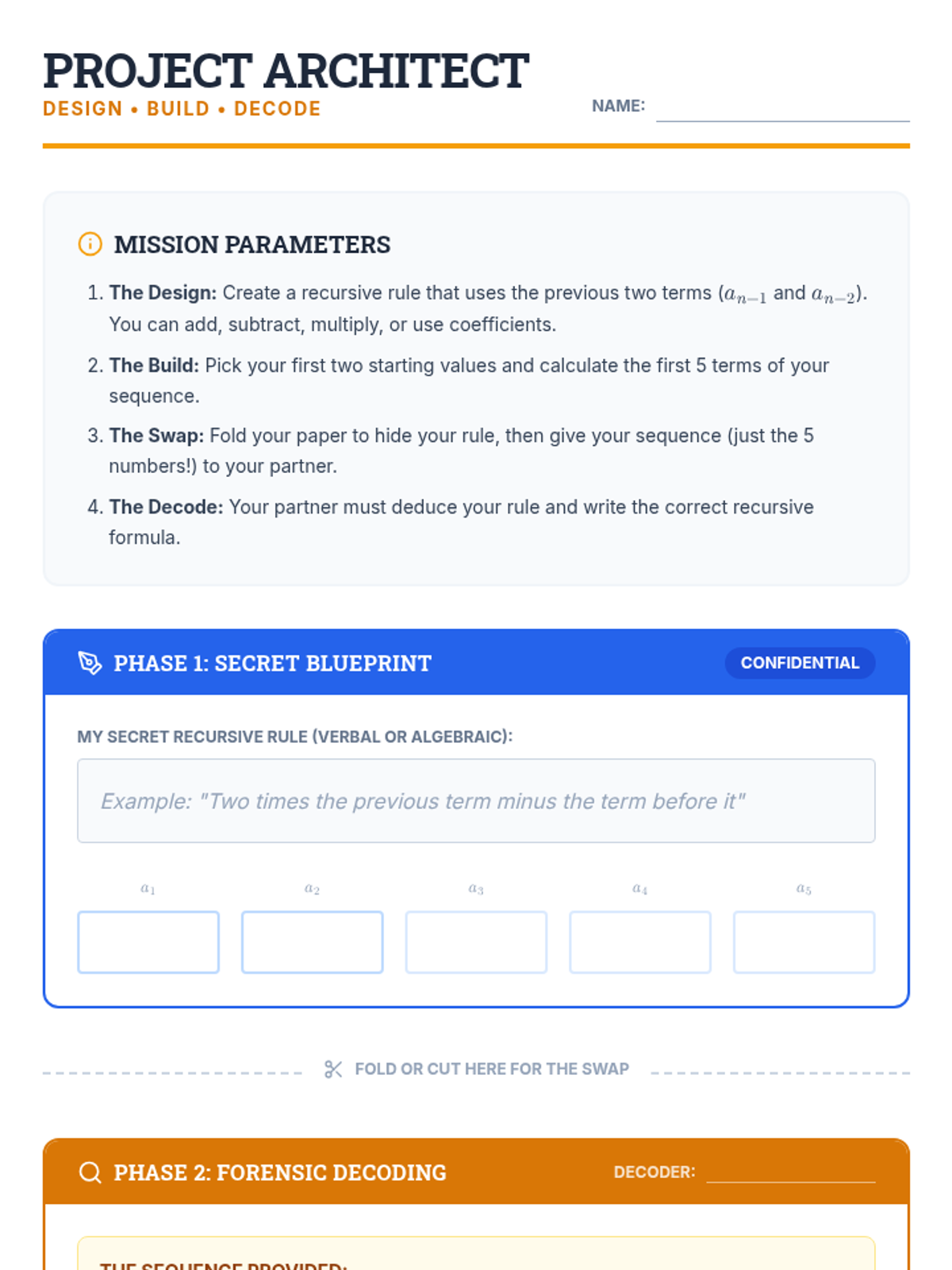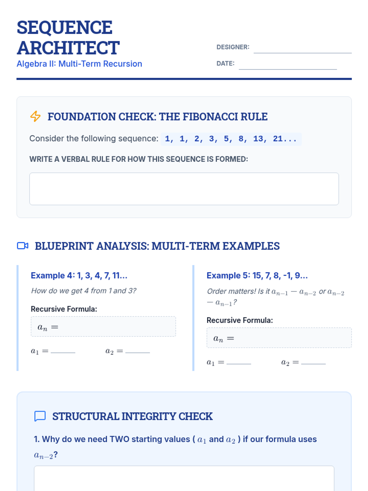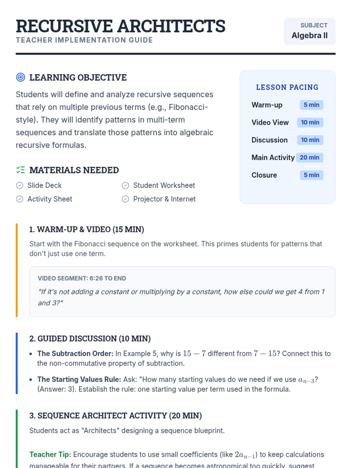 Students explore complex recursive sequences where terms depend on multiple previous values. They will analyze multi-term patterns from a video and then design and decode their own sequences in a peer-led activity.