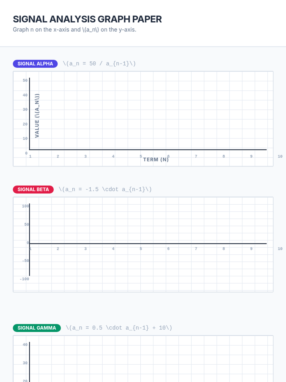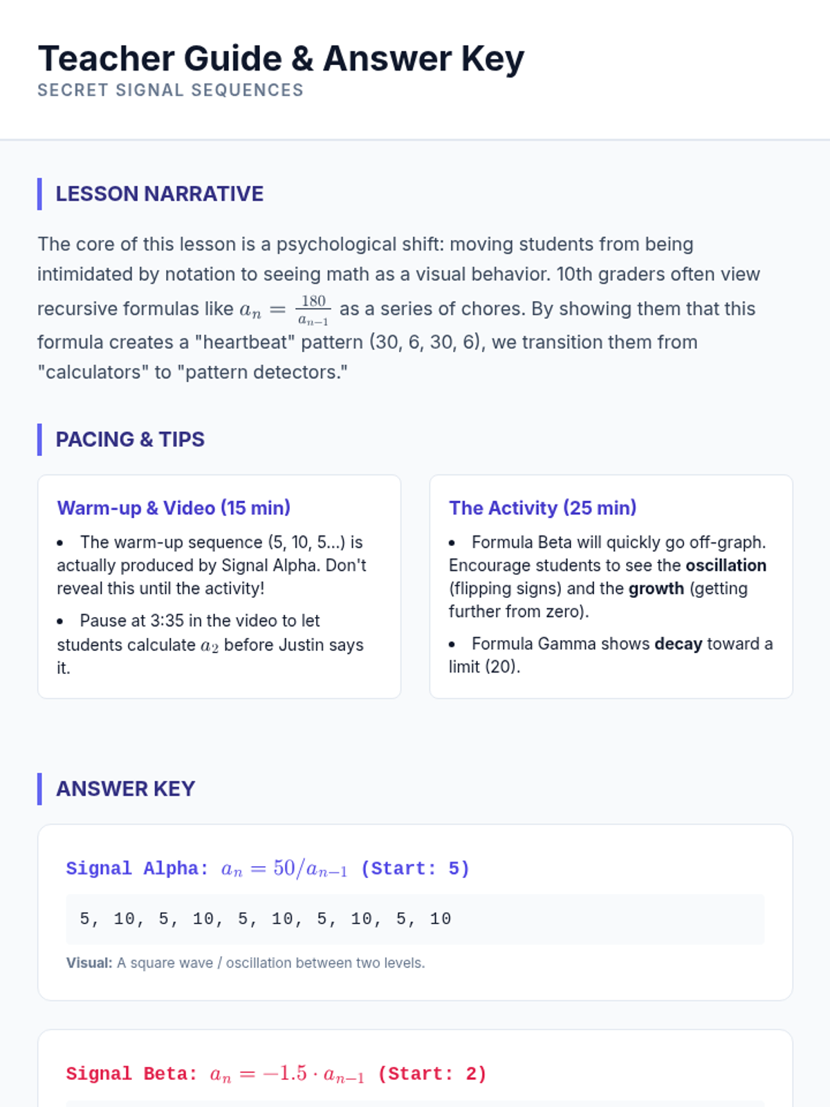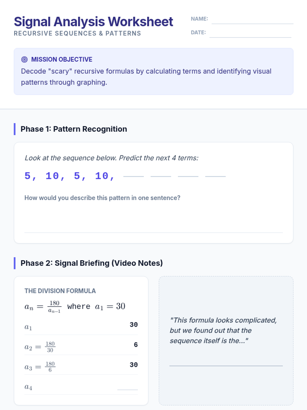 Students explore recursive sequences where complex-looking formulas generate simple patterns like oscillations, decay, and exponential growth. The lesson features a video-guided exploration and a hands-on graphing activity to visualize mathematical behaviors.