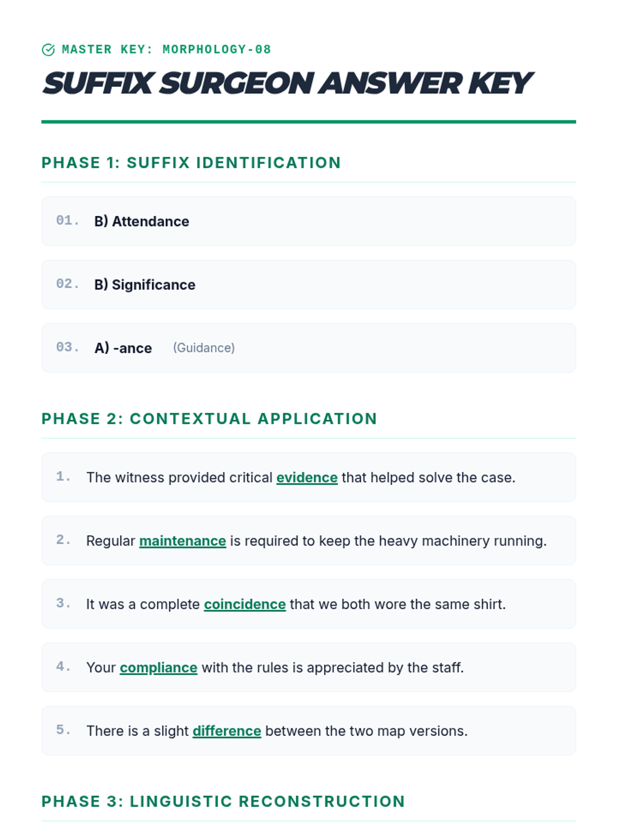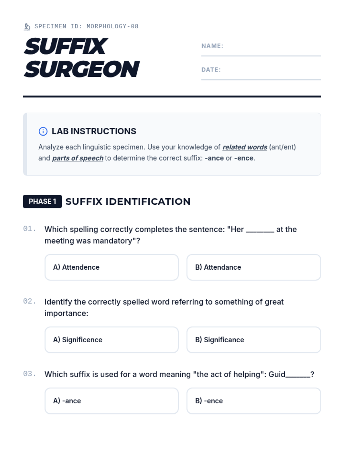This lesson breaks down the patterns behind -ance and -ence suffixes, helping students use root words and parts of speech to determine correct spellings.