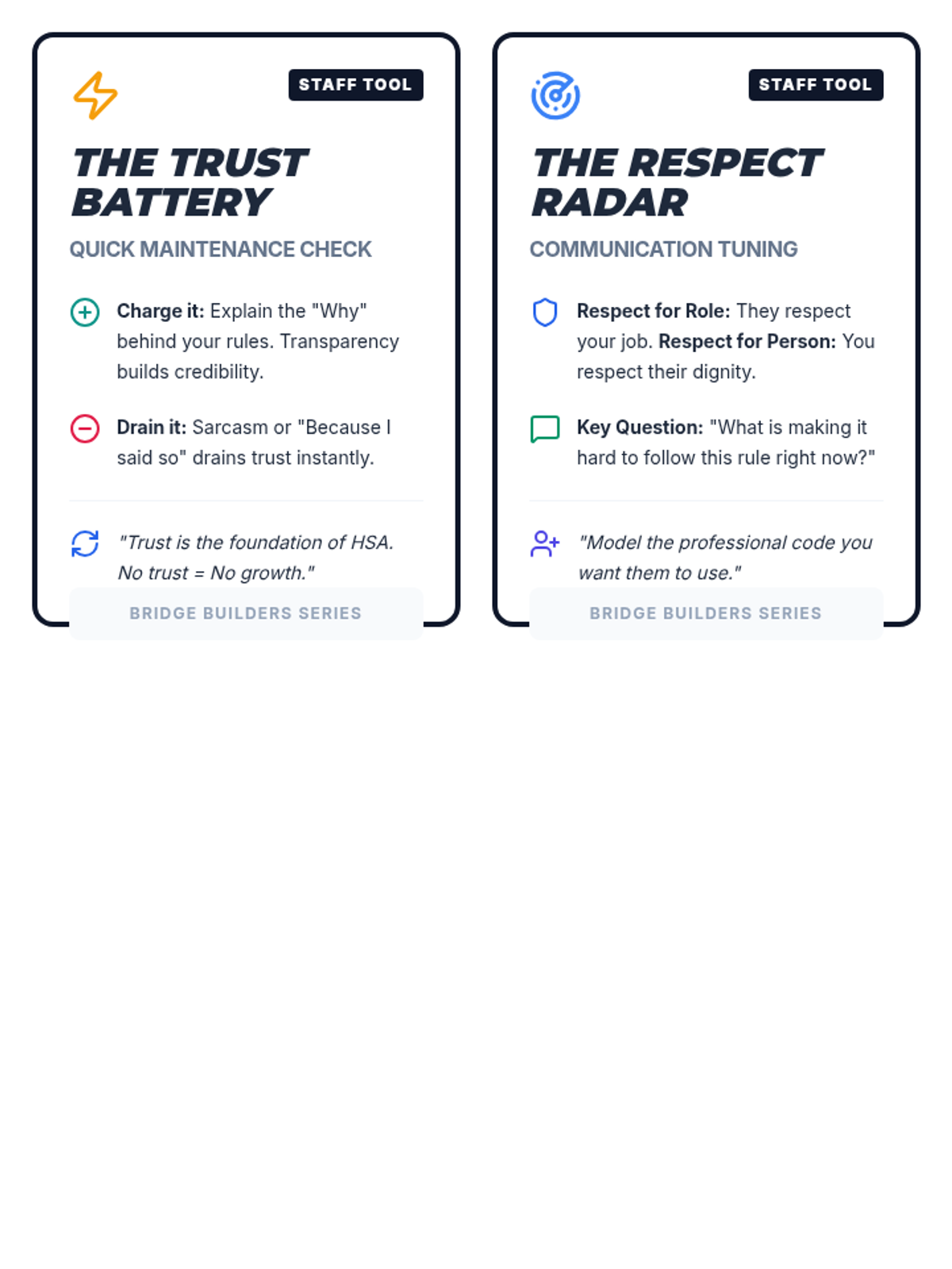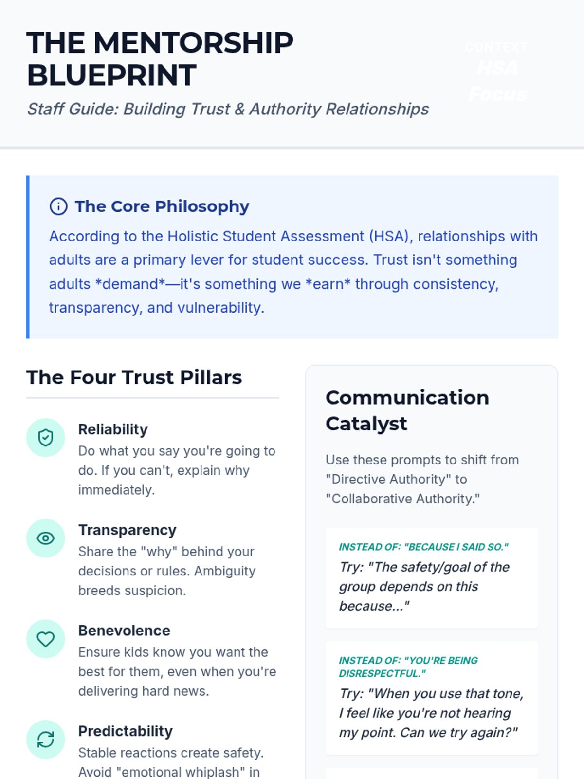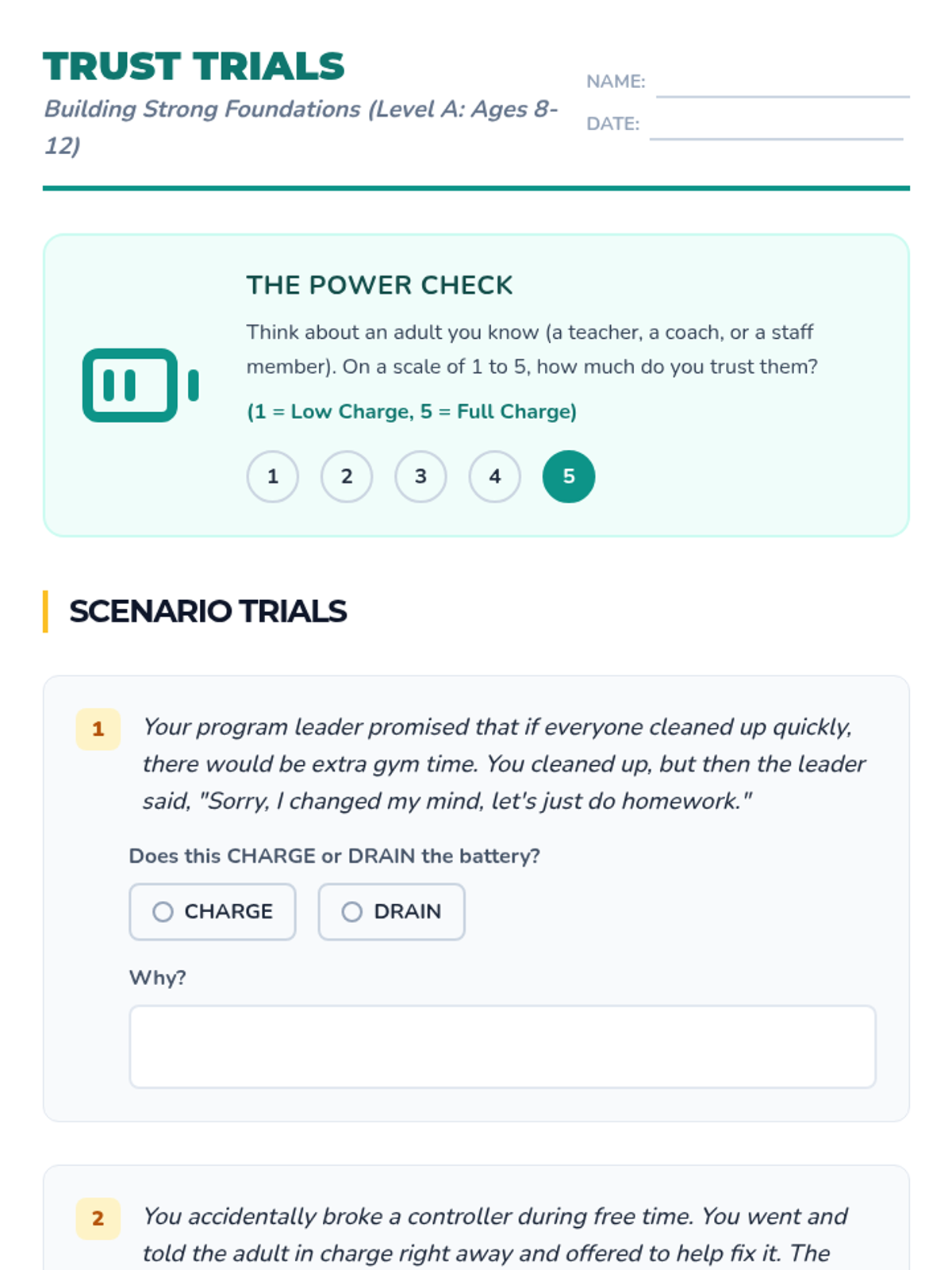 Focuses on the foundational concept of trust as a dynamic resource that can be built or depleted through consistent actions. Staff learn to model trustworthiness, while students identify what makes an adult 'trust-worthy' and how to build their own credibility.