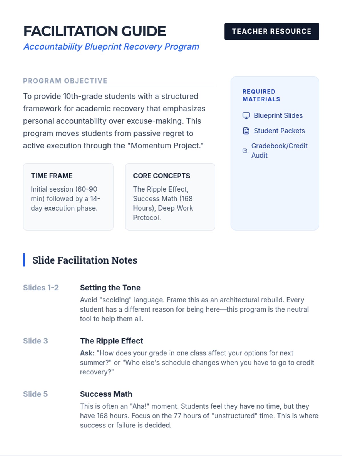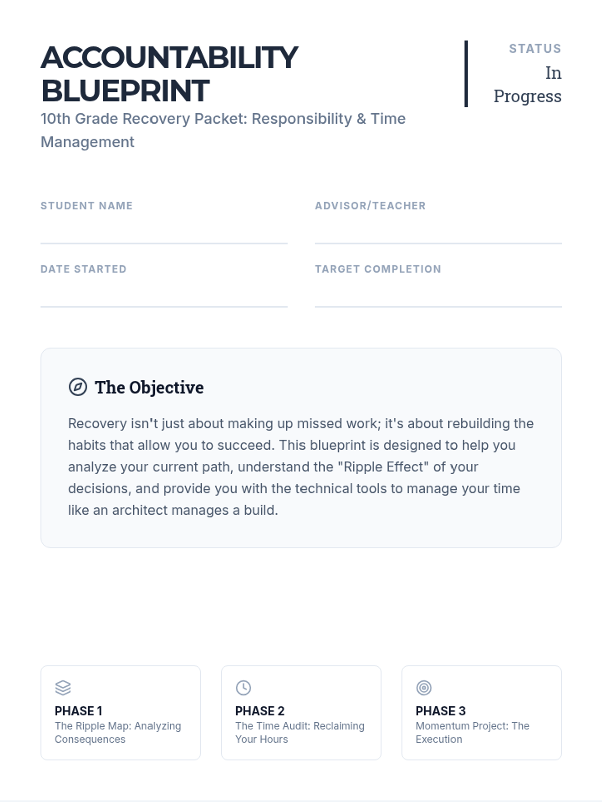 A comprehensive recovery program for 10th graders focusing on taking ownership of their actions, understanding the consequences of their choices, and mastering time management through a structured project.