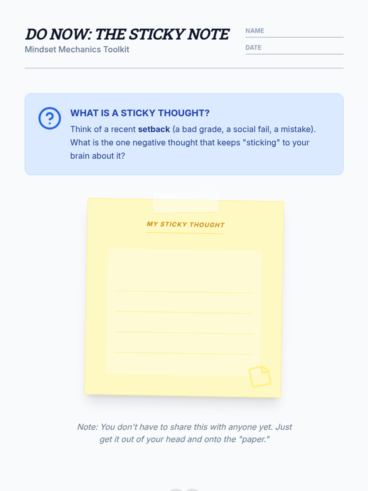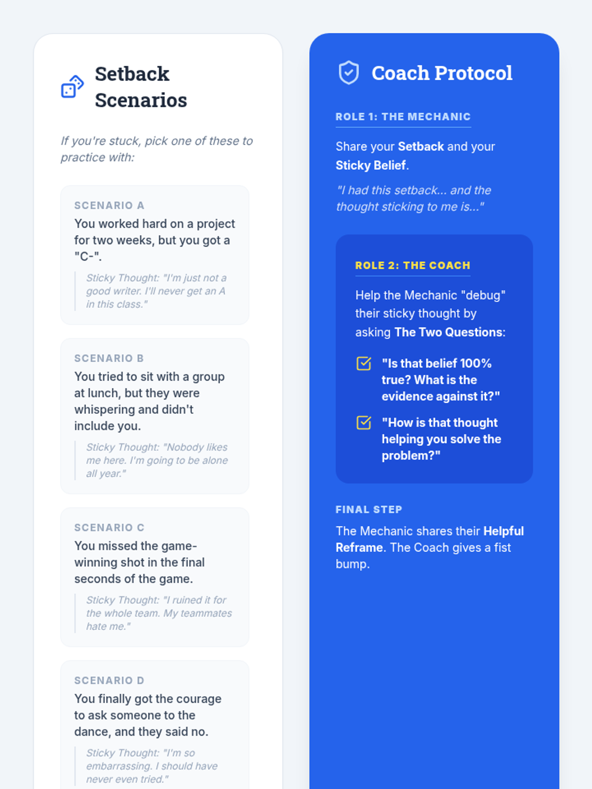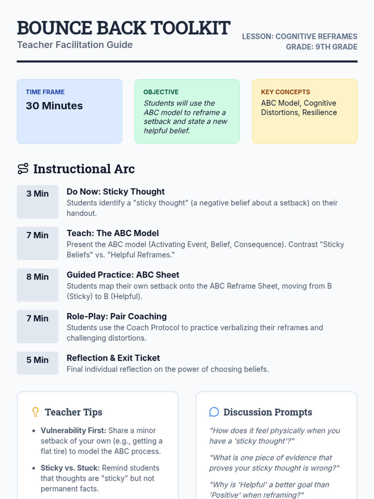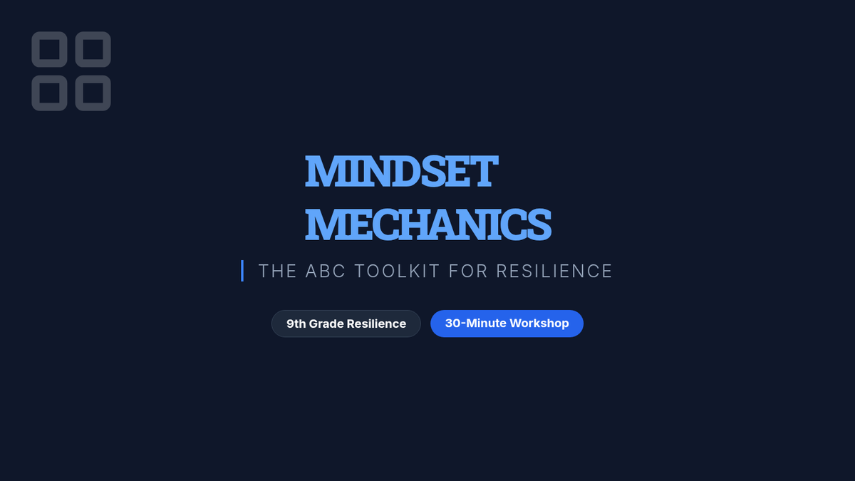A high-energy, 30-minute resilience workshop for 9th graders focusing on the ABC model of cognitive reframing to turn setbacks into growth opportunities.