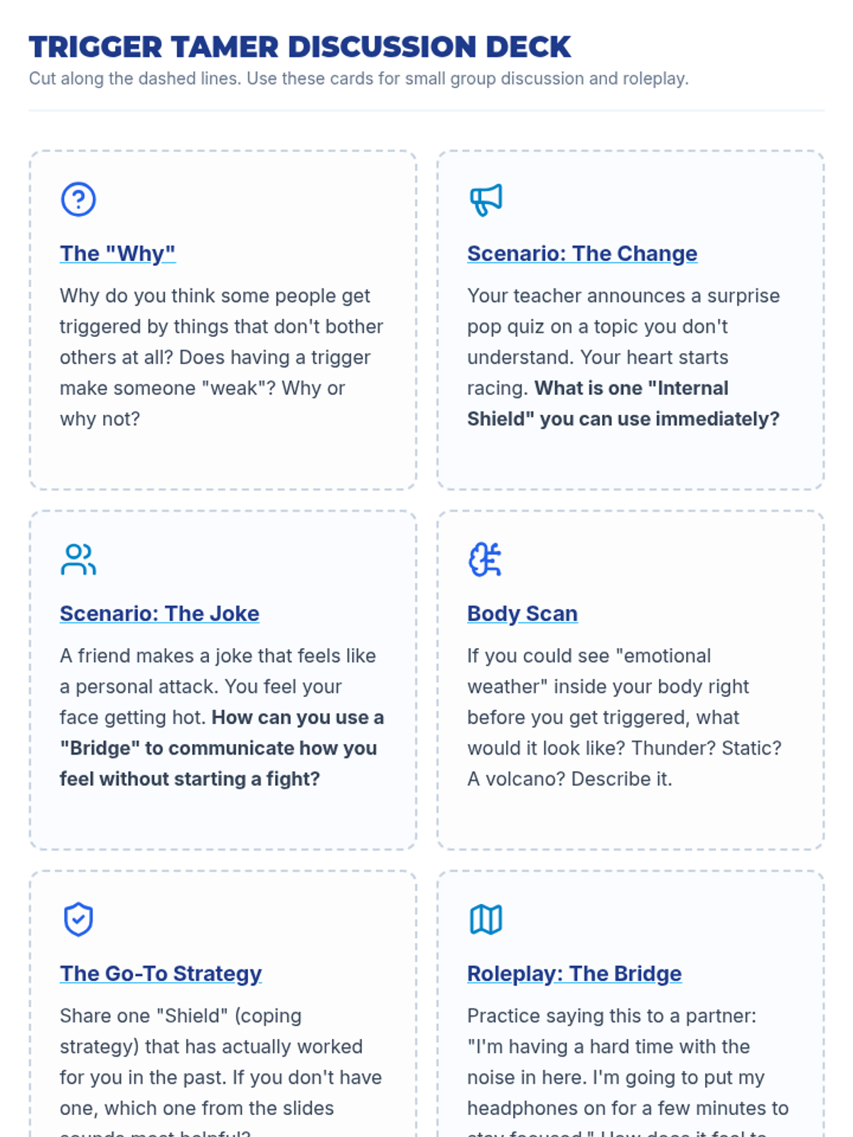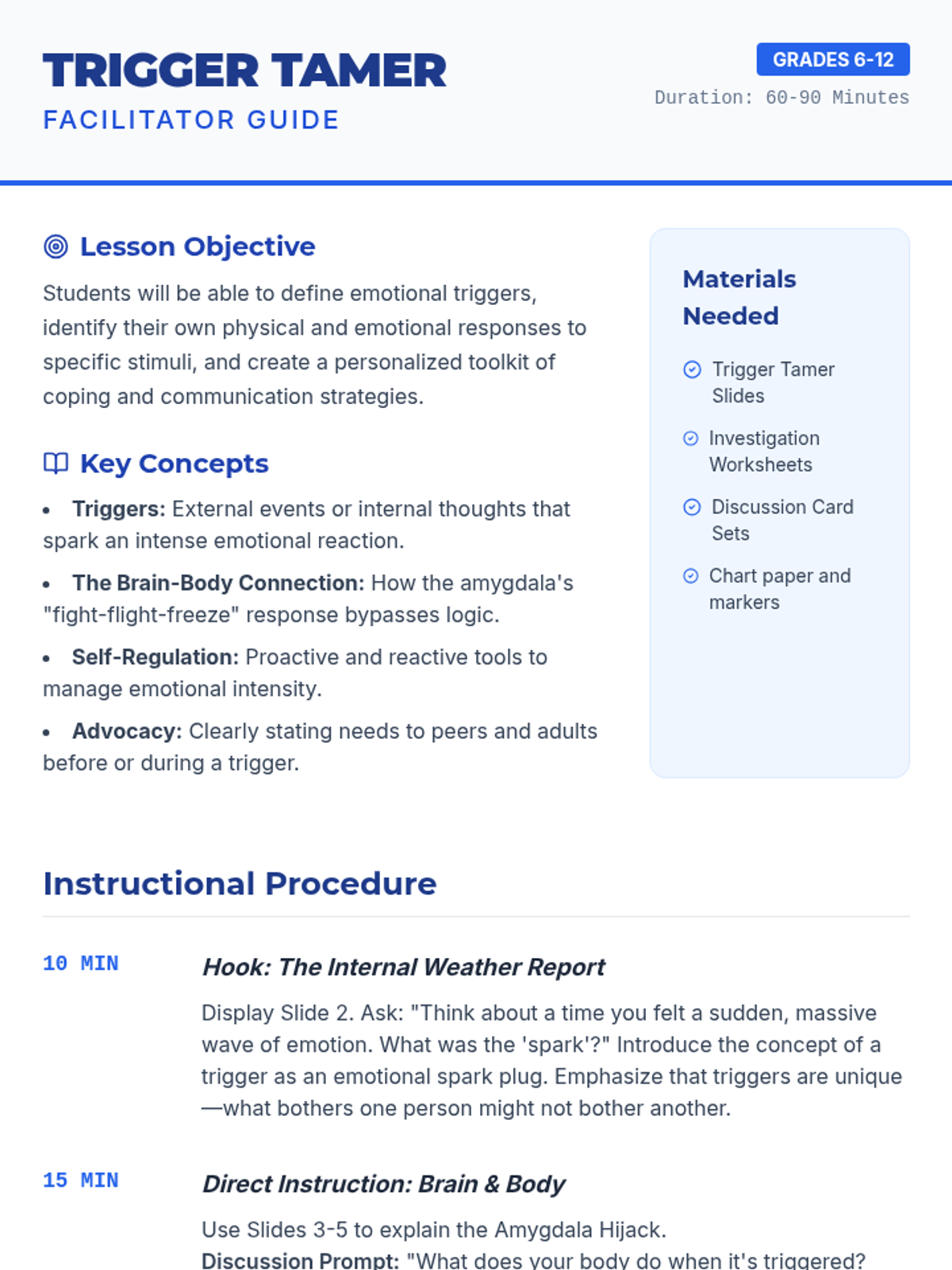 A comprehensive lesson designed to help students identify personal emotional triggers, understand the physiological link between emotions and reactions, develop practical coping strategies, and communicate their needs effectively to others.